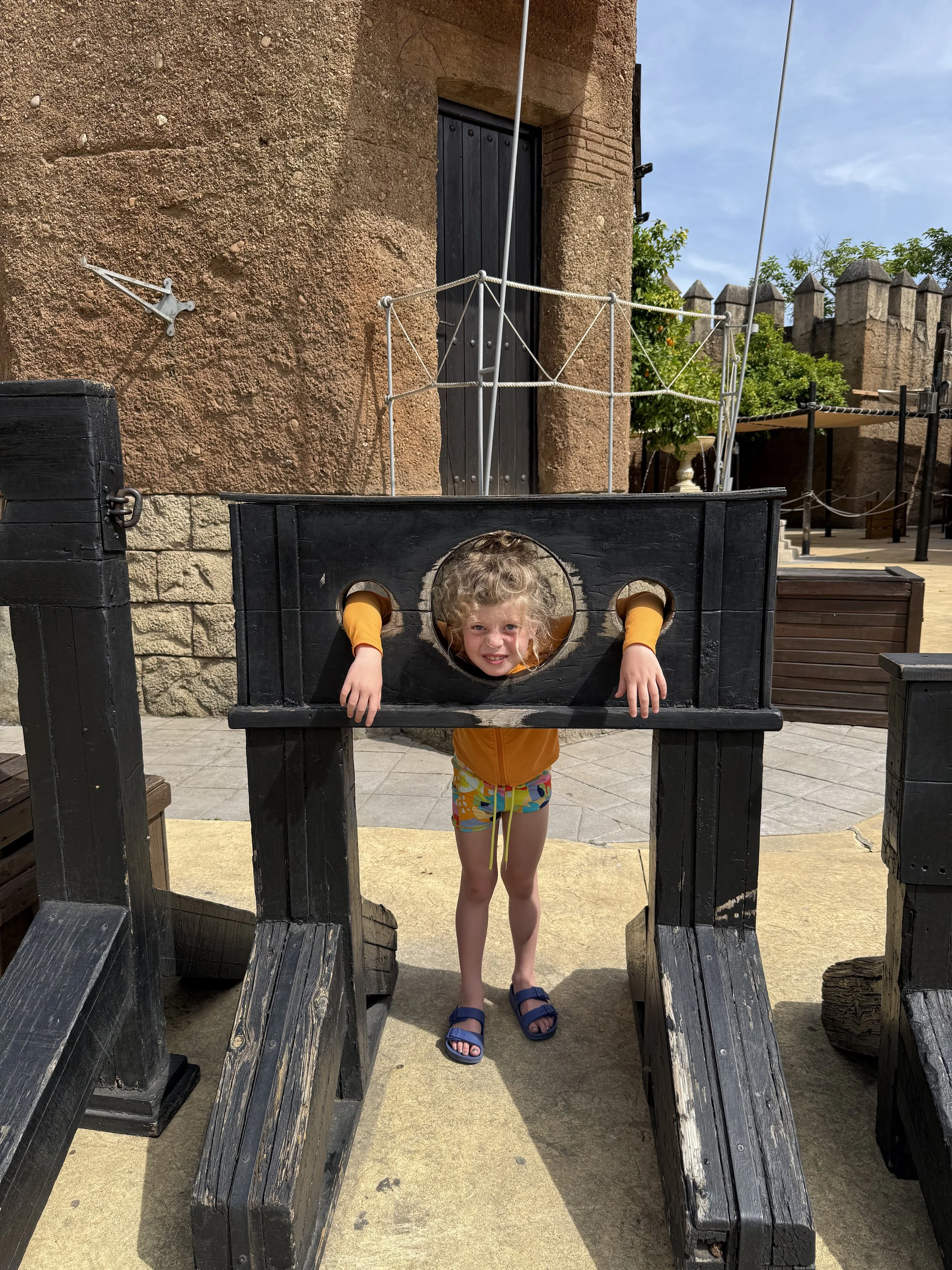 It was heating up so we started to migrate to the water park. On the way we saw a boat ride with cannons that Lenny and I went on. Kayleen and Ollie stayed on a bridge we passed next to. They had cannons that shot water for 1 Euro each via an automatic pump. Lenny and I had cannons but they shot water only as you manually cranked a wheel. Kayleen and Ollie easily reached us as we passed by but no matter how hard we cranked they stayed dry.