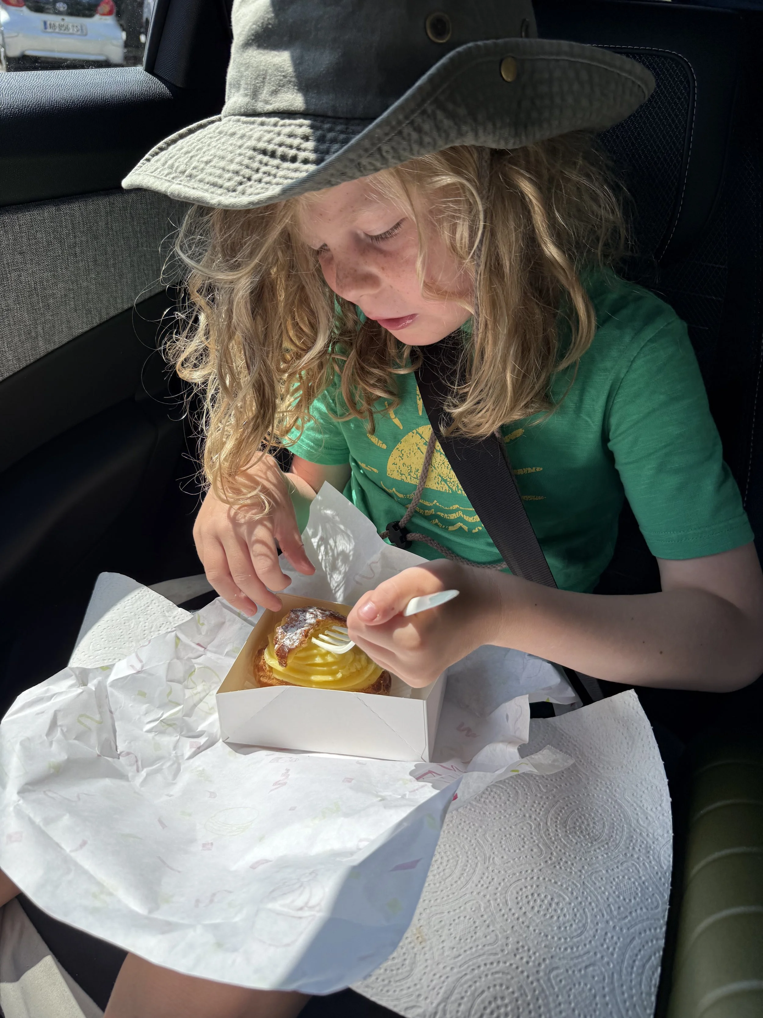 We stopped at a bakery on the way out of town. Kayleen and Ollie went in to grab food for everyone and somehow the language barrier got Lenny and I a slice of pizza instead of ham and cheese on a baguette. Ollie opted for another pastry which he happily ate as Lenny watched, though he did share a bite with him.