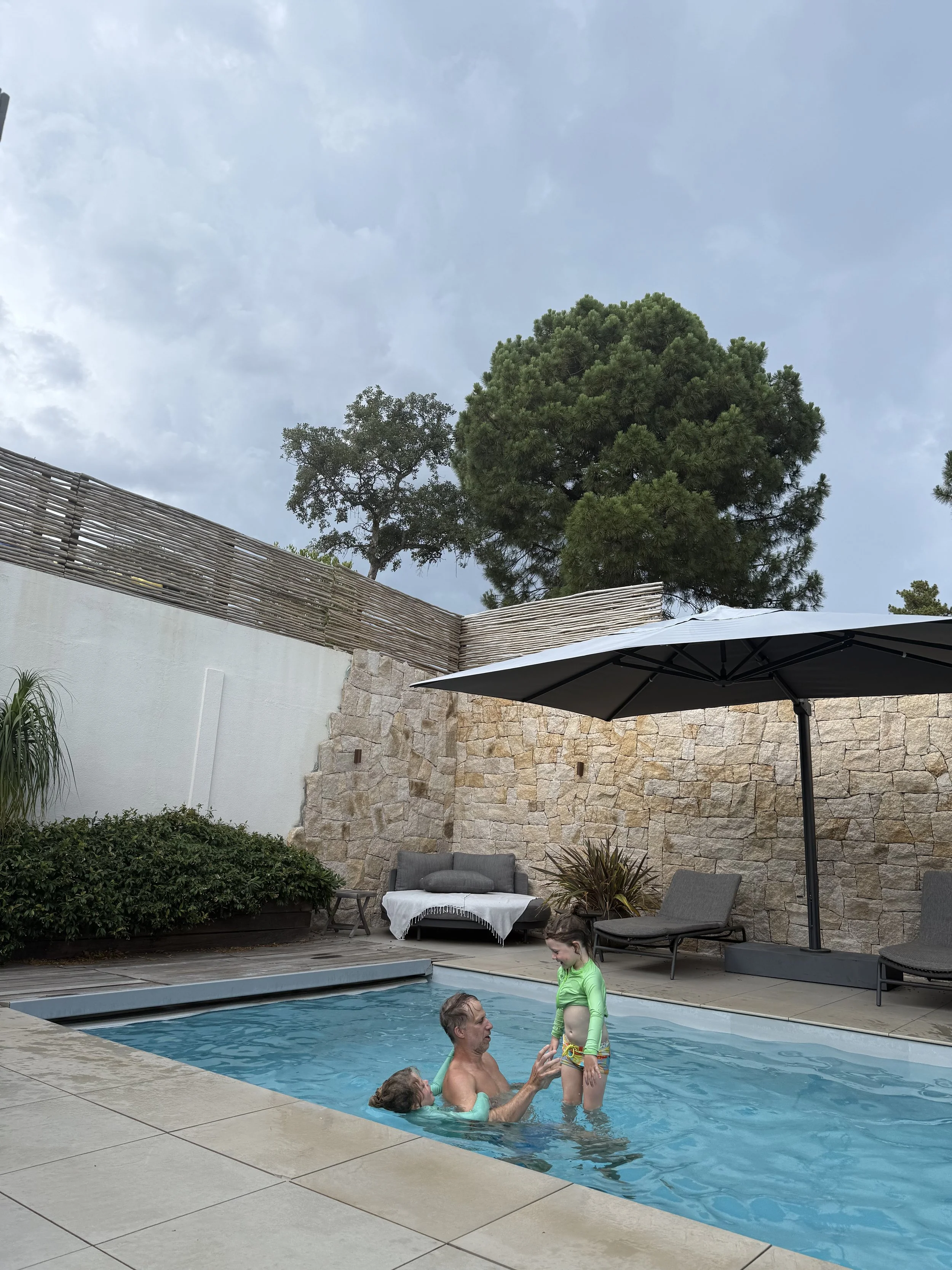 I went in the pool with the boys for a bit before we planned to head to the beach. While we were in the pool a storm rolled in with dark clouds and thunder. Before that forced us out of the pool, and to cancel our planned beach trip, we noticed that Lenny can officially swim!!! Like most things it just clicked and he said “watch this” and could tread water.