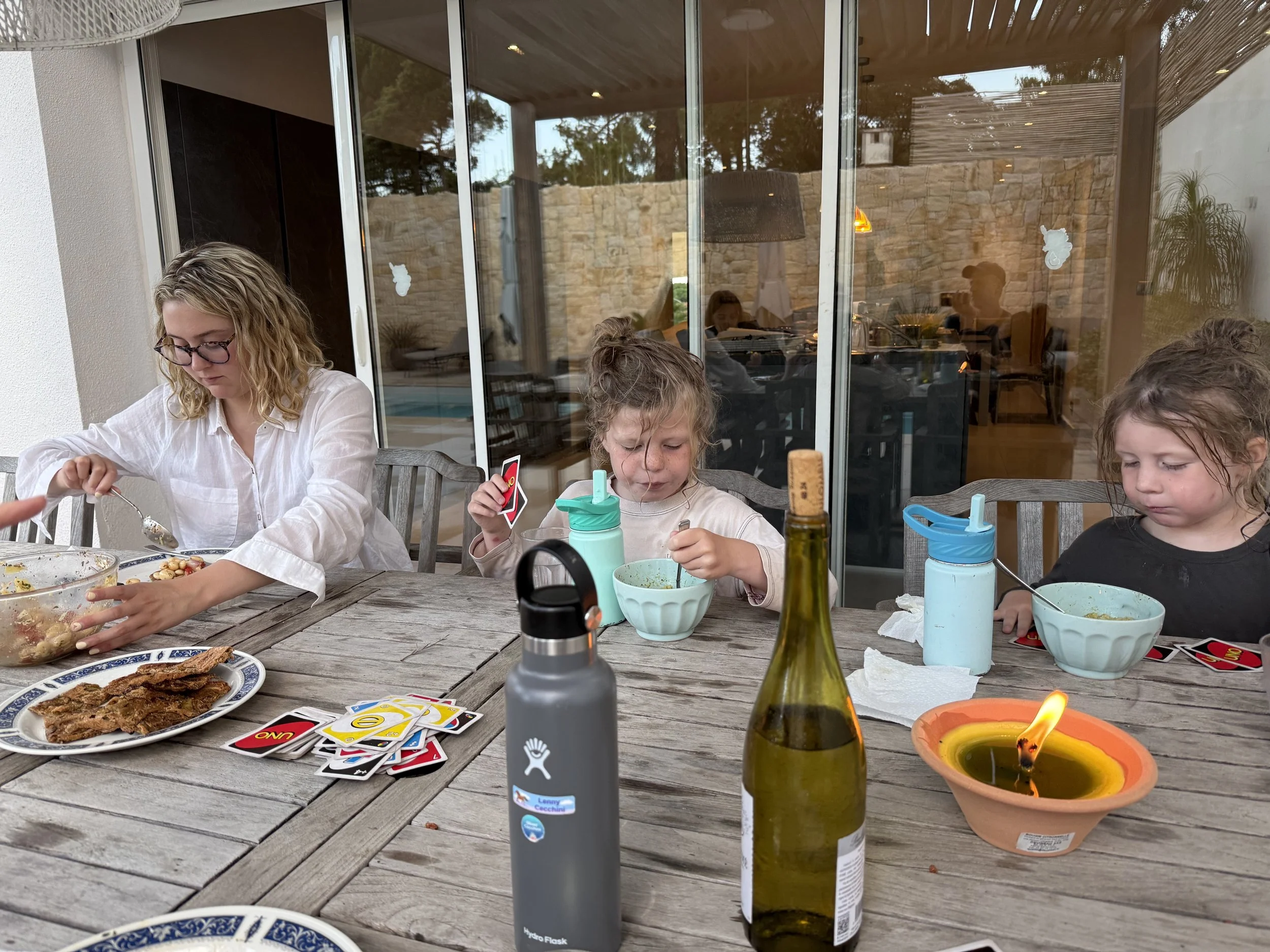 We had dinner at home and got in a game of Uno before the boys devolved. Kayleen made pesto pasta for dinner for the boys and bean salad over ricotta toast for the adults. It was very good and we also munched on the scarpaccia she had made during our movie time.
