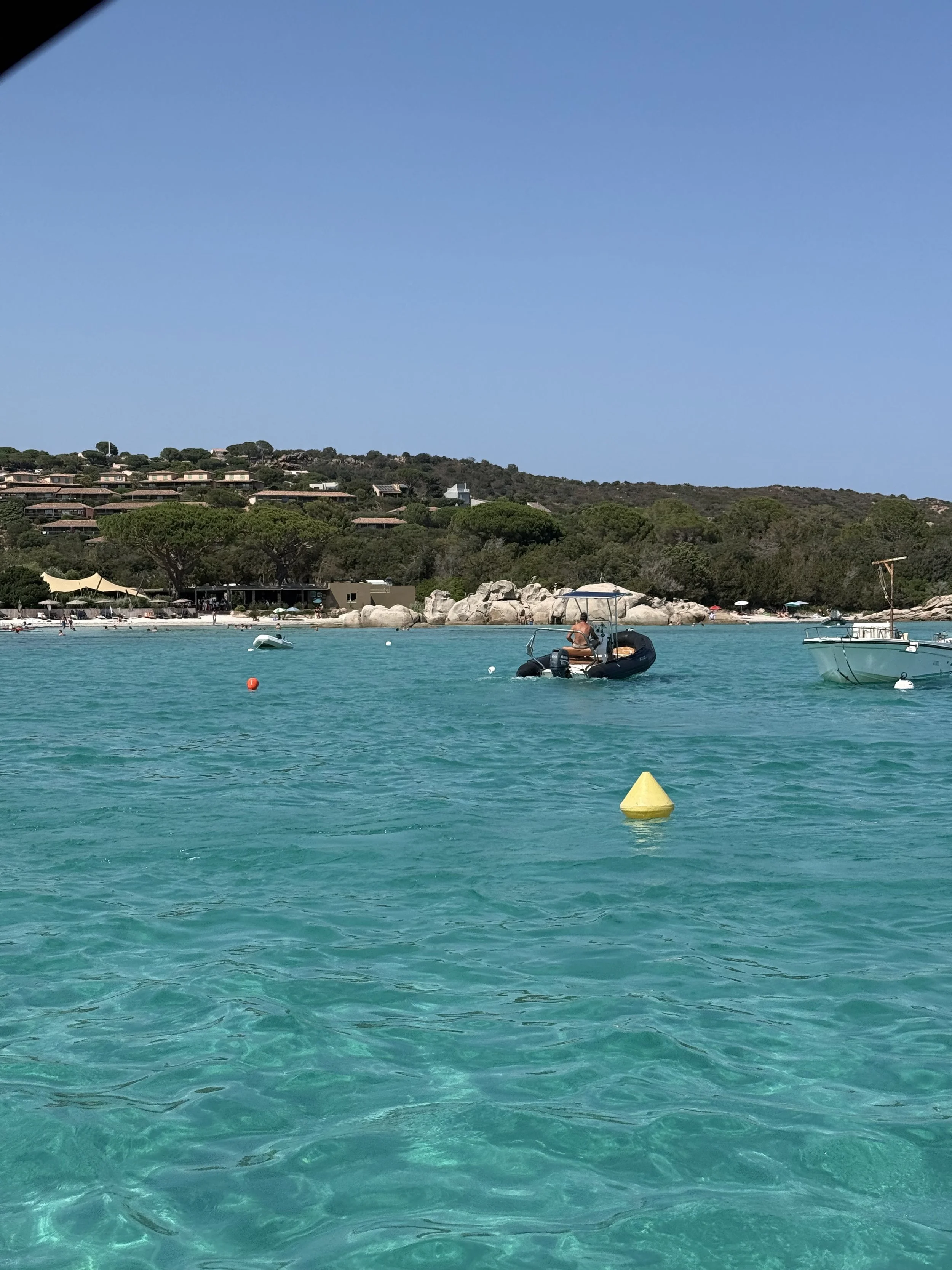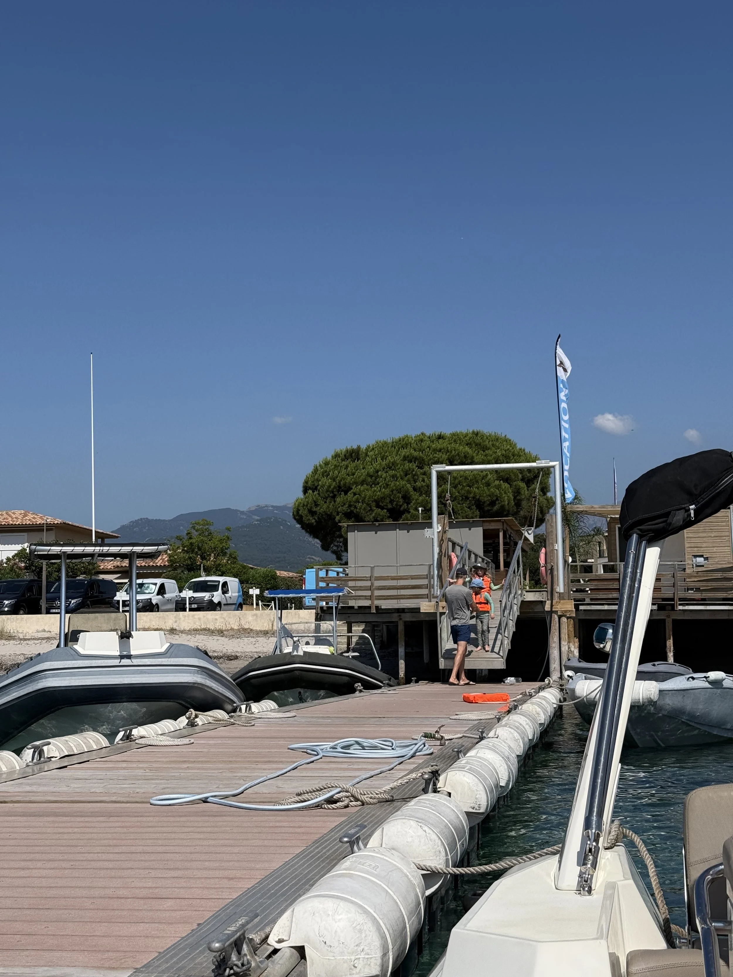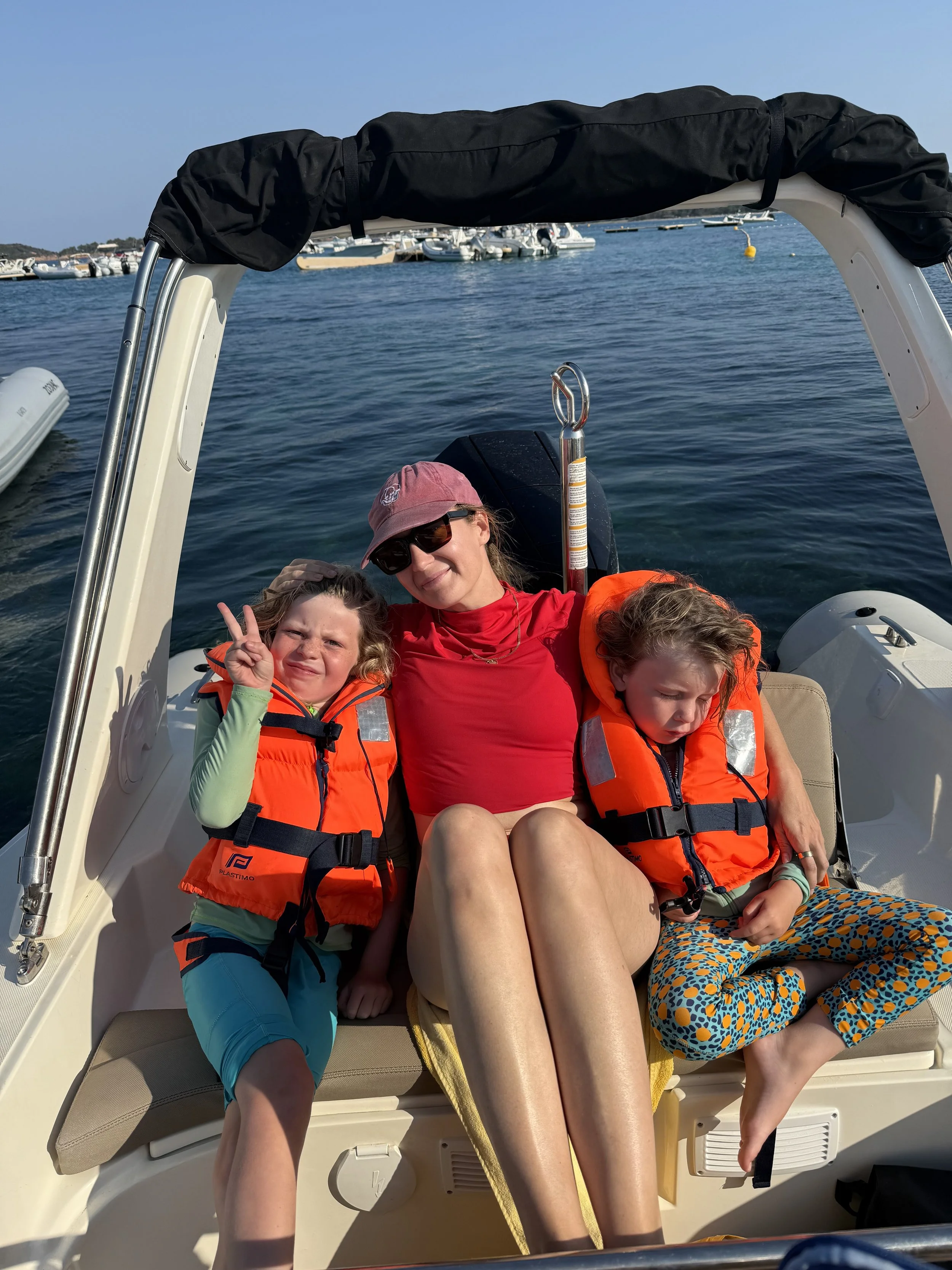 Everyone was up on the earlier side today to head to the dock to start our boat day. Kyle rented a Zodiac boat from a nearby marina that was just a 10 minute walk from our house. He also rented a sea scooter that you can hold in your hands while it propels you through the water. We had used something similar, a sea bob, a few years back in St.Martin and loved it. Both kids had the confidence that they’d be able to drive it alone but that didn’t happen.