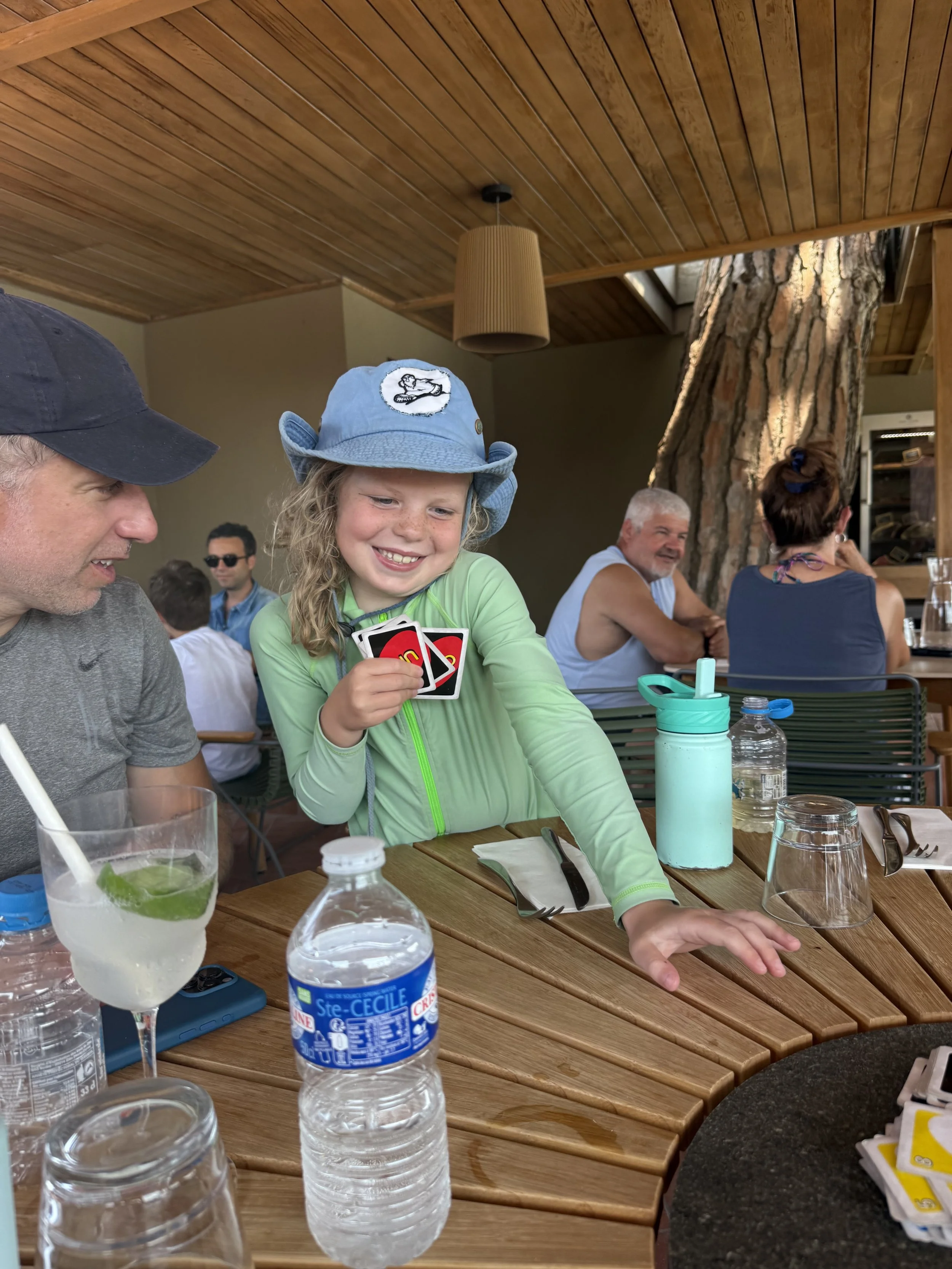 Next we headed another 30 minutes south to Santa Guilia which looked super busy as we arrived. The water was also filled with people and new to us water devices to rent like a peddle boat with a slide on top and a stand up paddle board with an under-board motor. Thankfully there was an easy to reach dock where we parked the boat for a bit before walking ashore in search of lunch. We went to Trois Deux restaurant for lunch at the recommendation of the gentleman who rented us the boat. The food was fine but the margarita was the most memorable– each of the adults only had 1 but it was sneaky strong and surprised us. We played a game of Uno before the kids snuck off to the water to play while we finished our meals and waited on their kid’s meal ice cream.