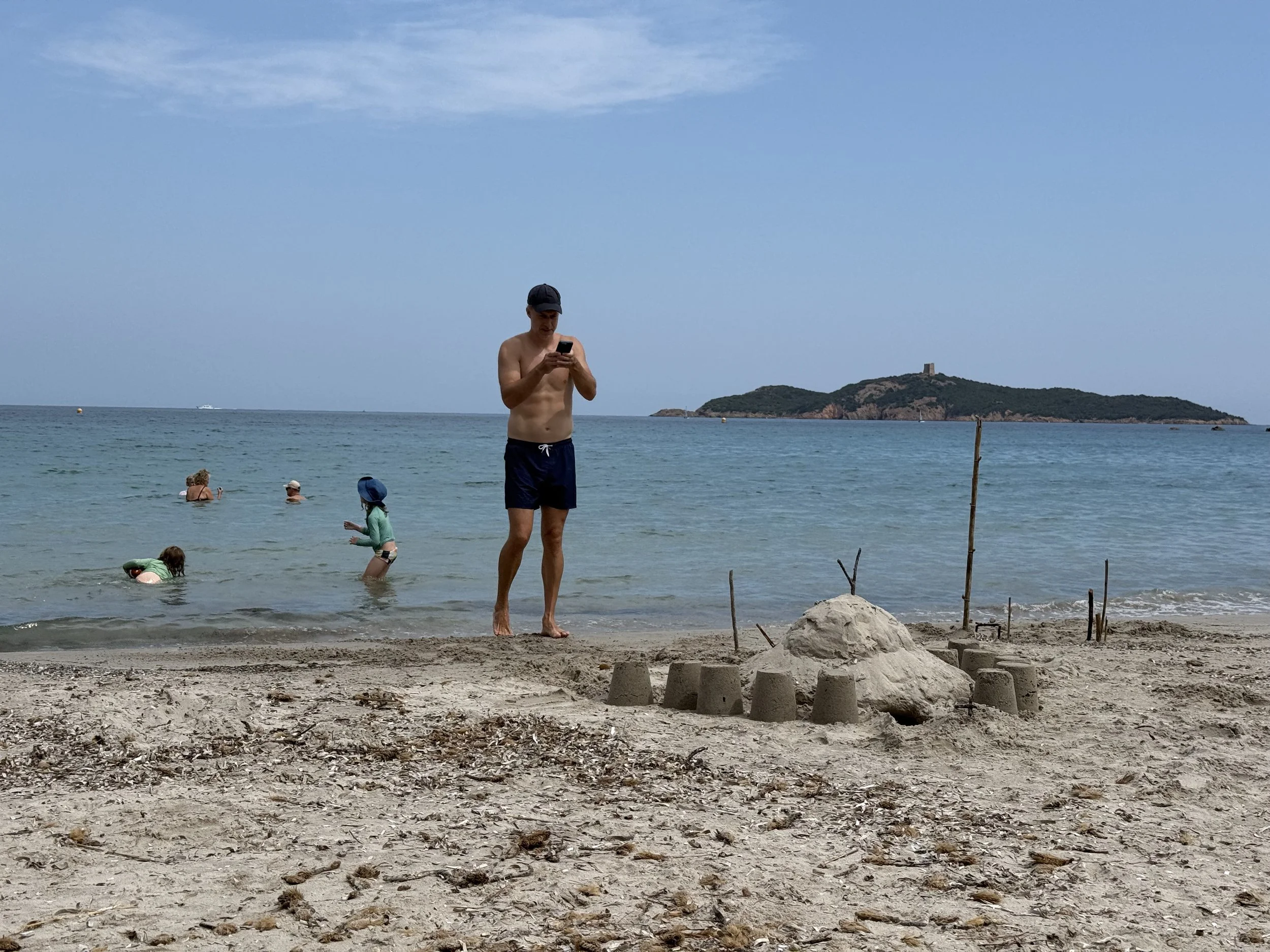 Once back Ollie and Kayleen had joined us at the beach. Ollie was keen to play football again but I told him first Lenny and I were going to rebuild our castle. The tunnel underneath was still there and only covered by a little sand which was easy to remove. I put castles all around the mountain and re-dug our moats while Lenny gathered sticks to make “lighthouses” everywhere to warn passing ships.