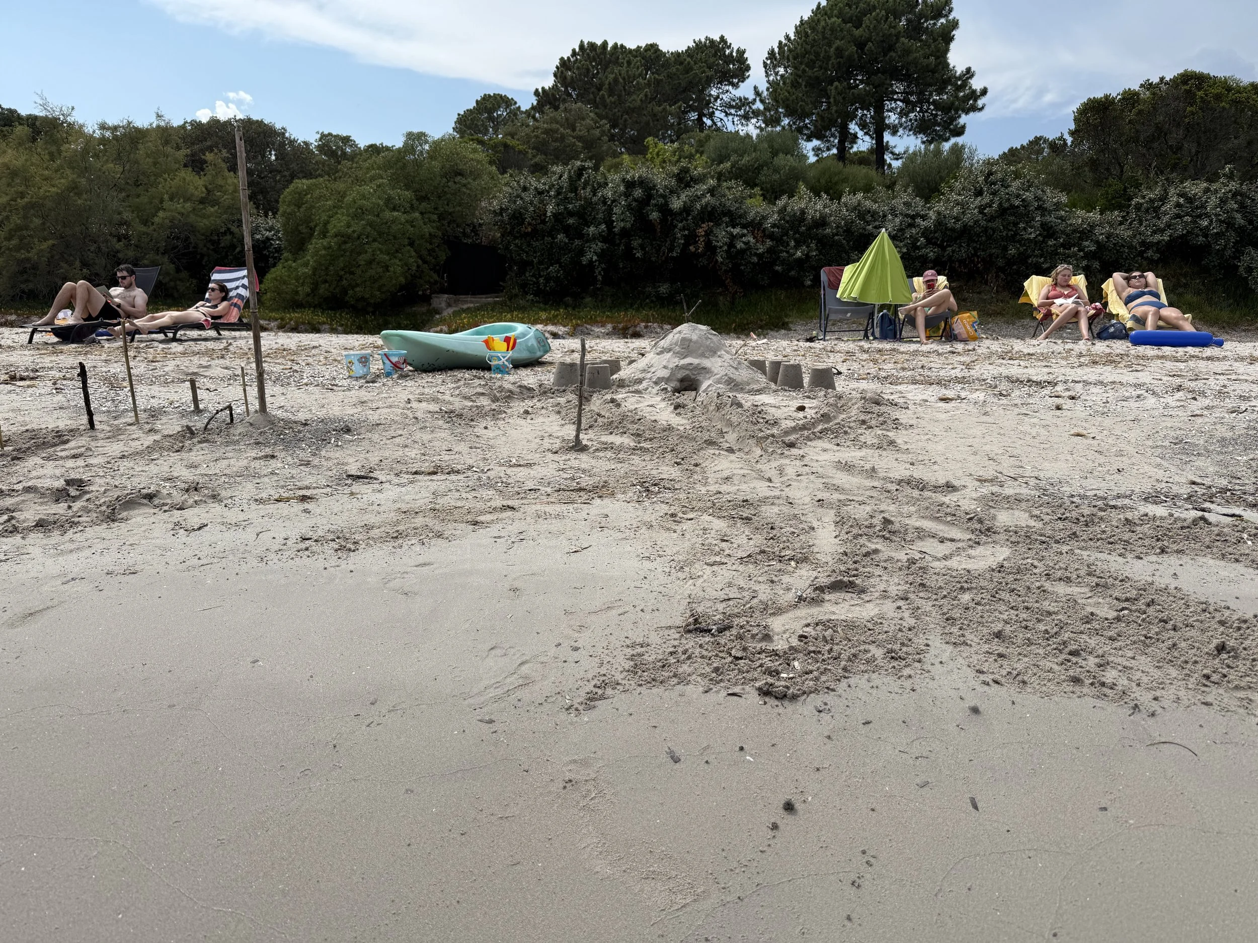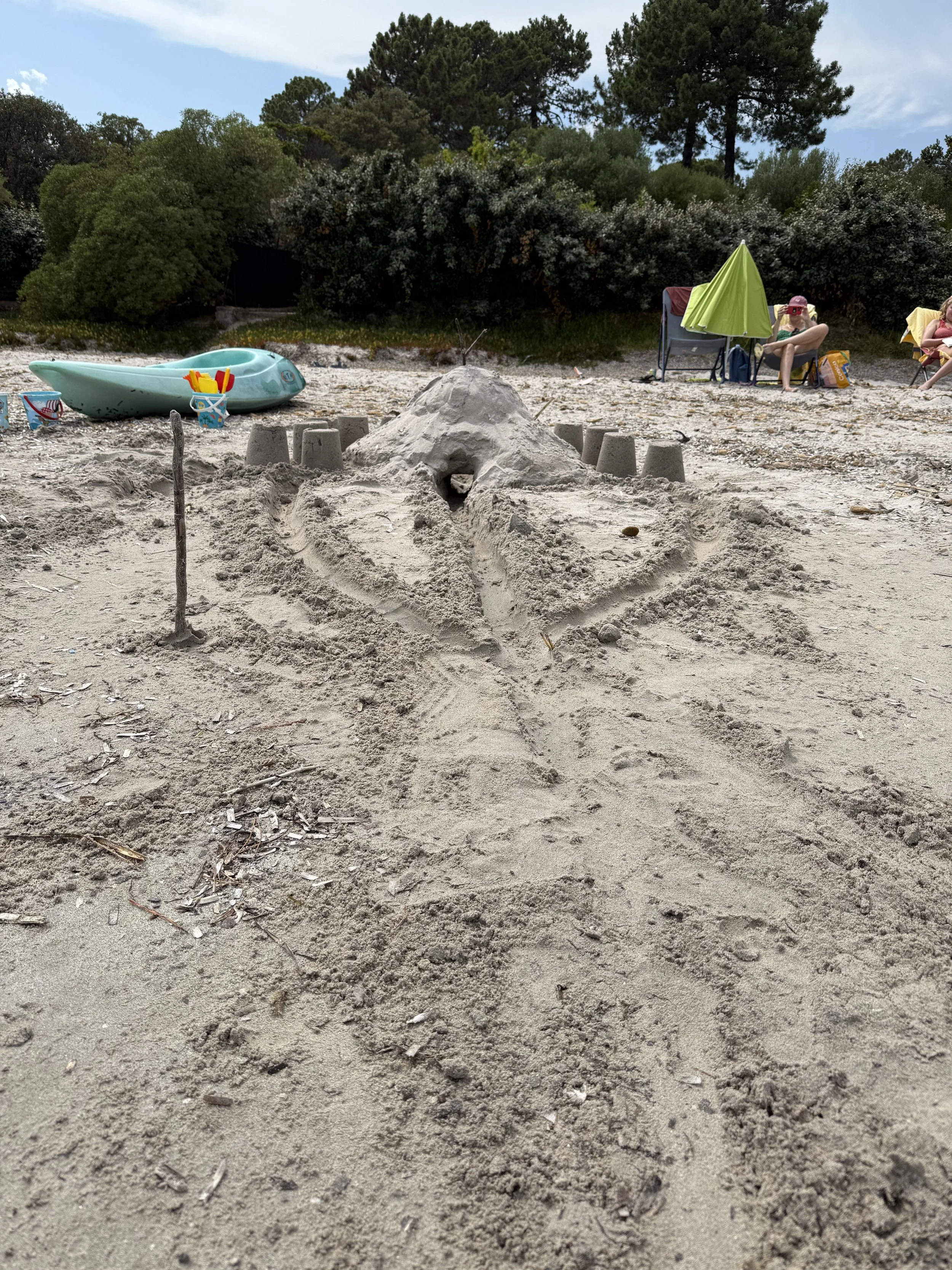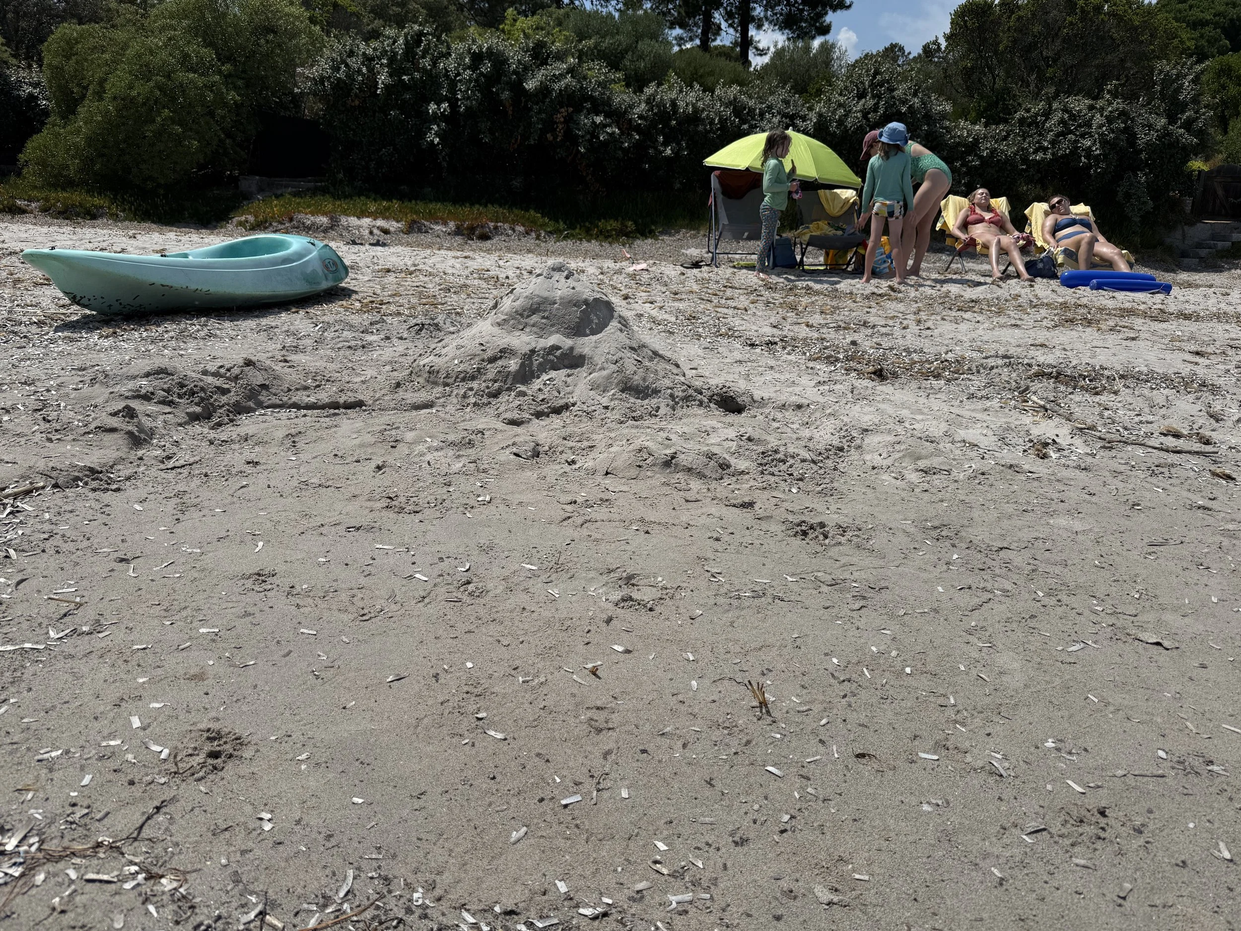 Eventually it finished and the boys went in the pool for a bit while we had some quiet time. Bri and Amanda had headed to the beach and Lenny and I went to meet them with the kayak in tow. We arrived at the beach to find the remains of our last sand castle, mostly destroyed, but the sand mountain was still there.