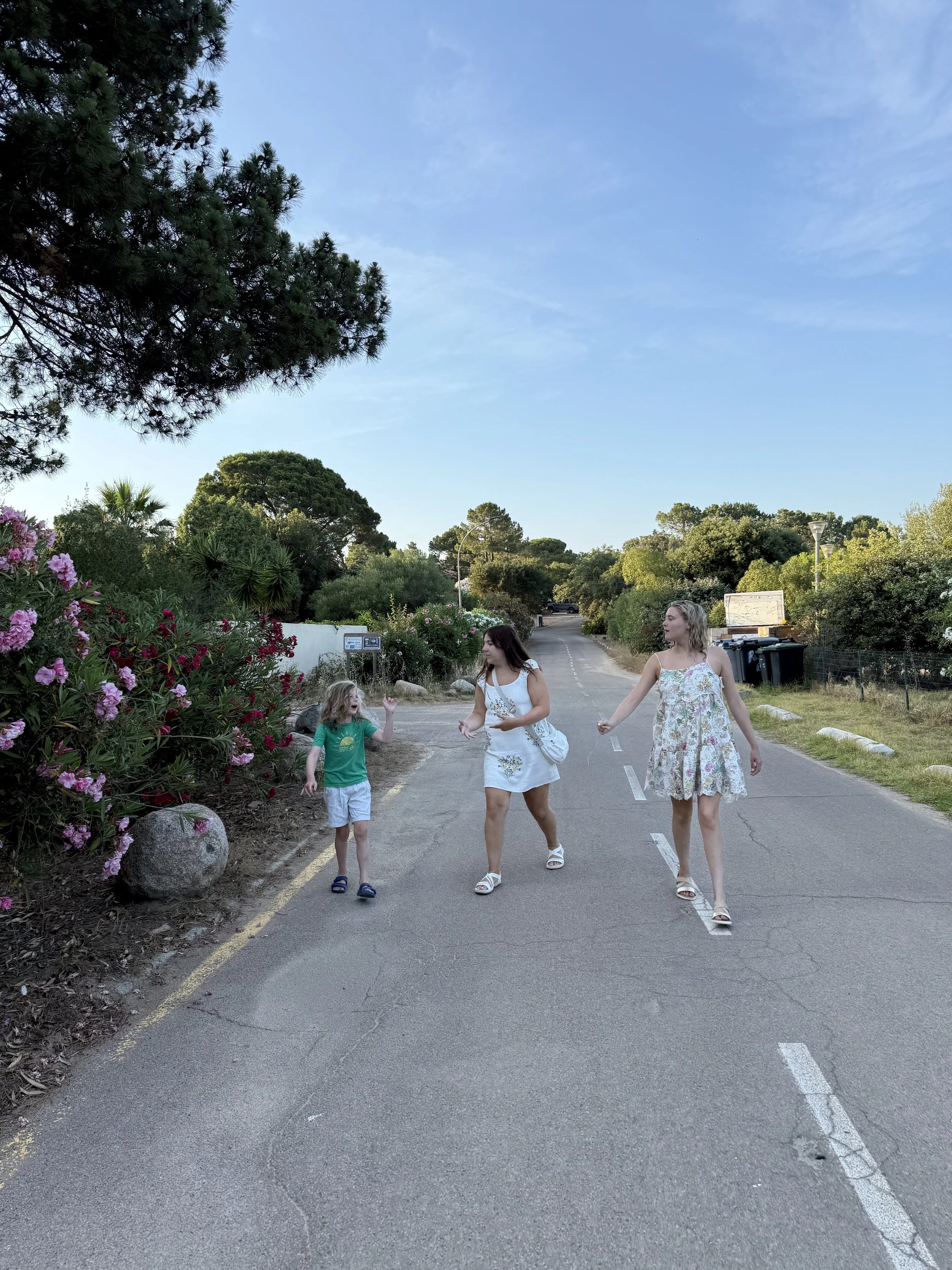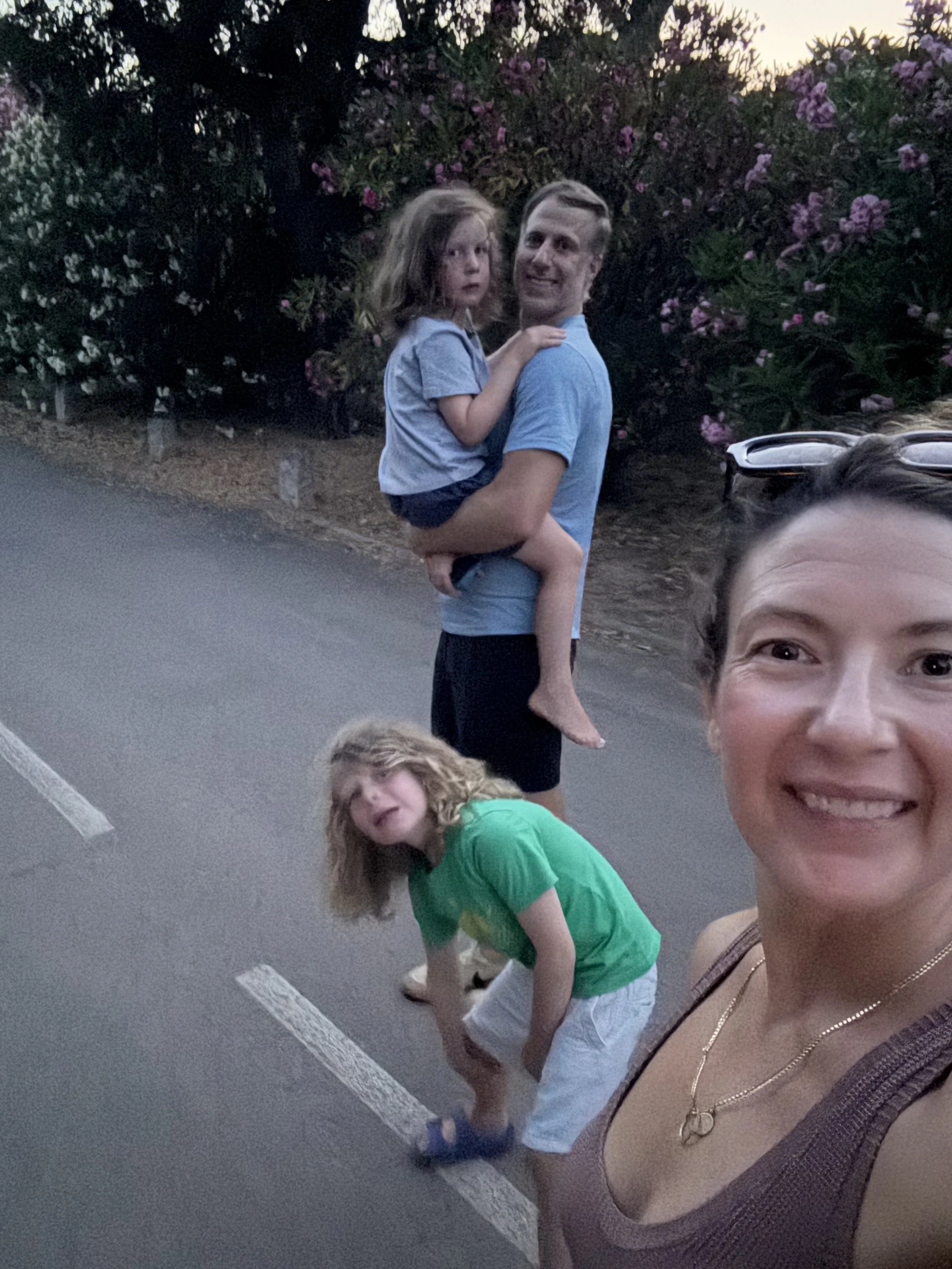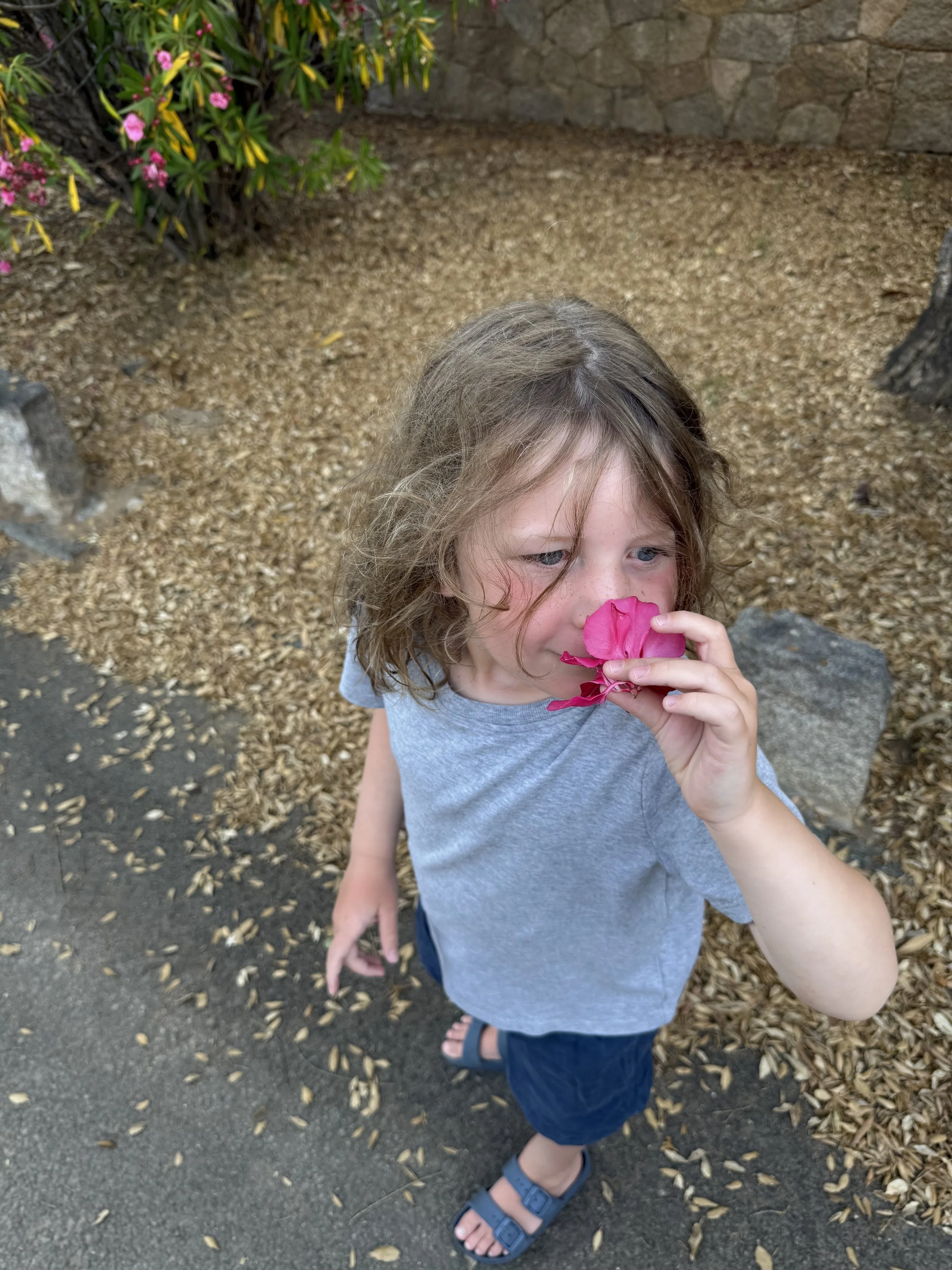 We all walked to dinner together and Lenny is thrilled to smell the flowers along the way and try to get others to as well. Bri had convinced him the white flowers smell like marshmallows the other day so he was keen to tell me and have me smell one.