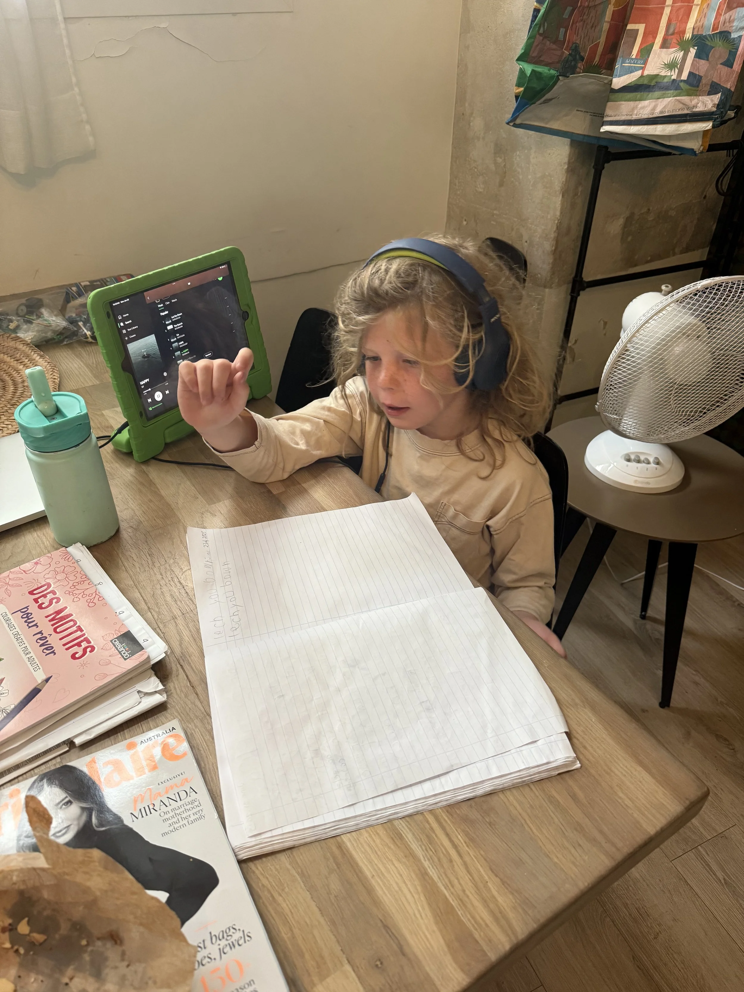 We did some home schooling once they returned to the apartment. Ollie was offered to try and write down one of his rap lyrics instead of writing a letter which he was happy to try. We set him up with Spotify on his iPad to get him a beat to write to. He tried to do it as he would pause the music and restart songs but needed some more one on one help. Lenny was not too excited to do his words this morning as he was waiting for the arrival of Grandma and Nonno.