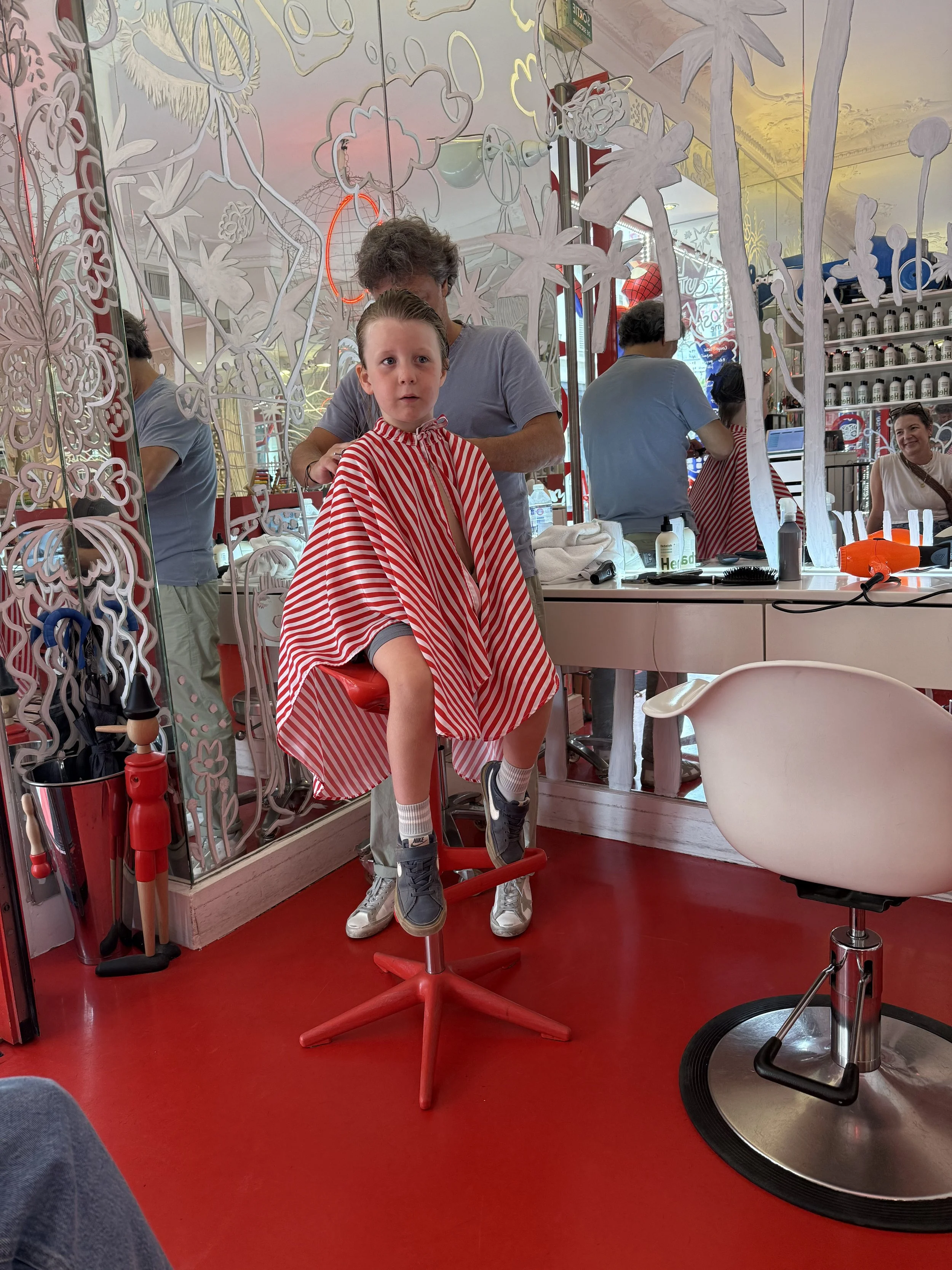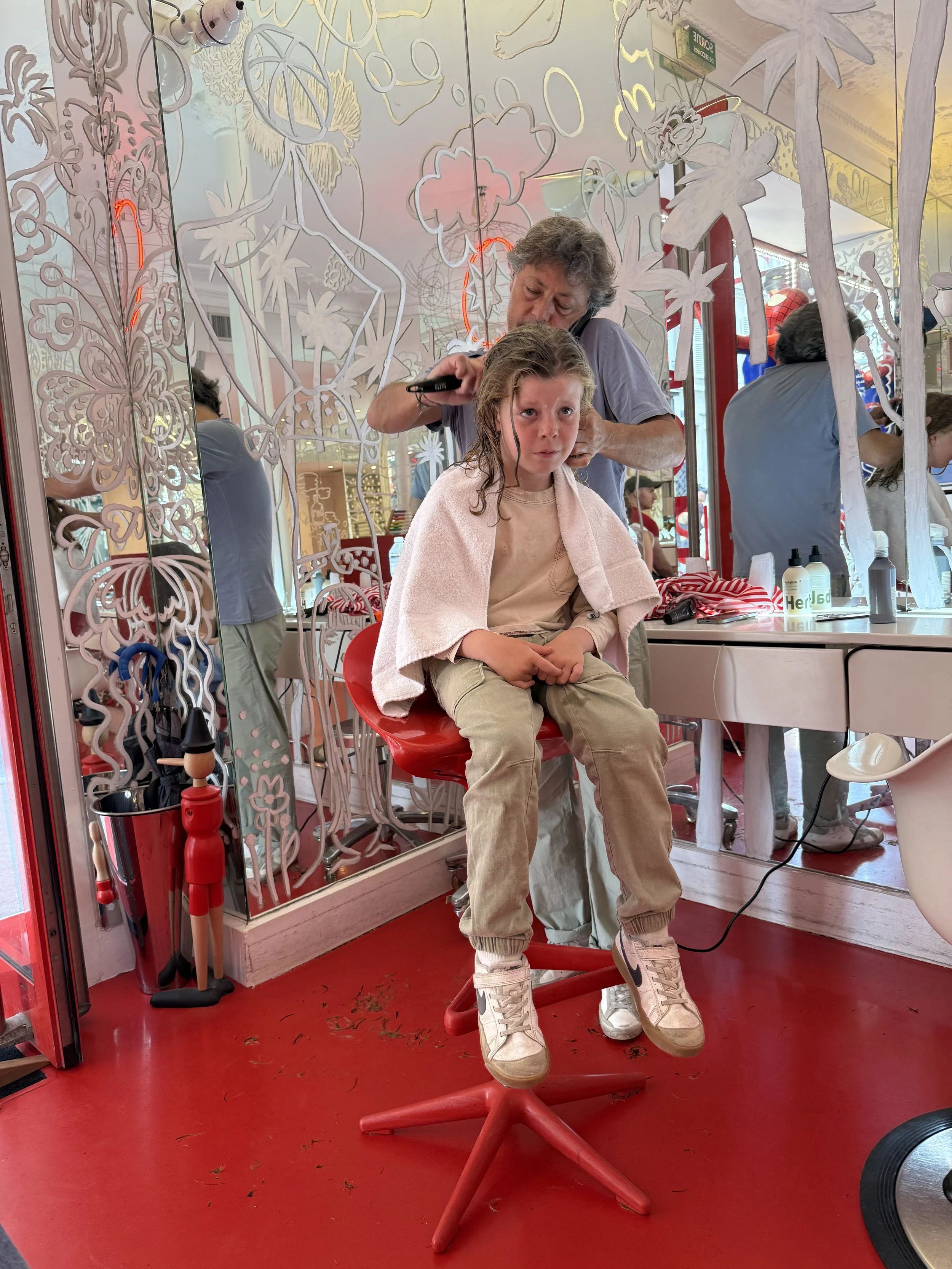 We headed to a haircut place for the boys that we noticed on our hunt for lunch, it had a huge Spider-man in the window. Lenny complained about his knee as we went but the walk was not very far. The boys took turns getting their hair cut with the one waiting happy to watch old silent mickey mouse cartoons on a TV in the shop. There was a brief misunderstanding that almost led to Ollie having most of his hair cut off but that was quickly fixed as even the shop owner thought it couldn’t possibly be what we wanted. Both boys ended with a lollipop much to their delight.