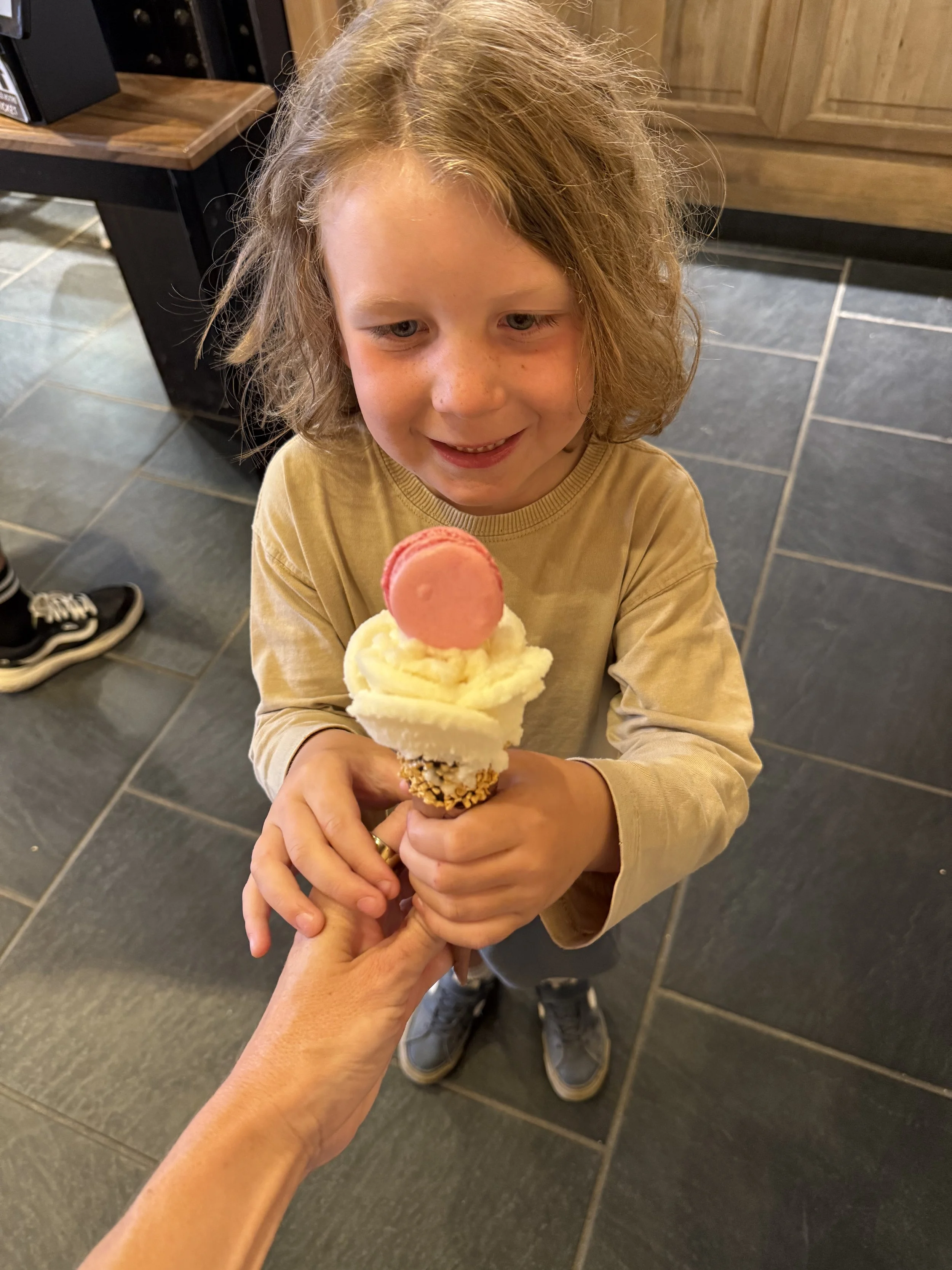 We headed to a gelato shop a few storefronts down and the boys took down their second midday desert. After this stop Lenny was complaining a lot about his leg and limping as well. The limp convinced us it was not being faked so I agreed to carry him home.
