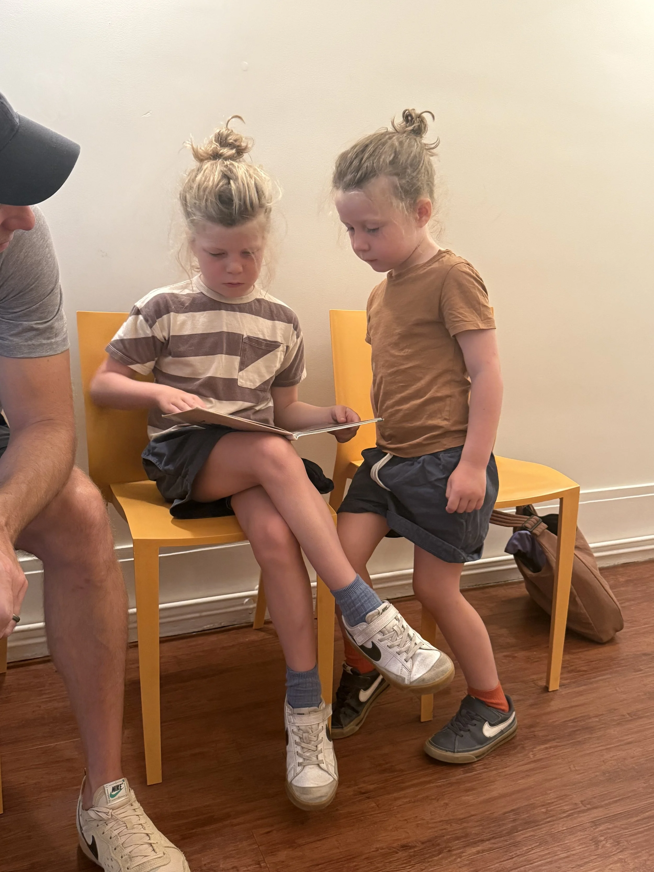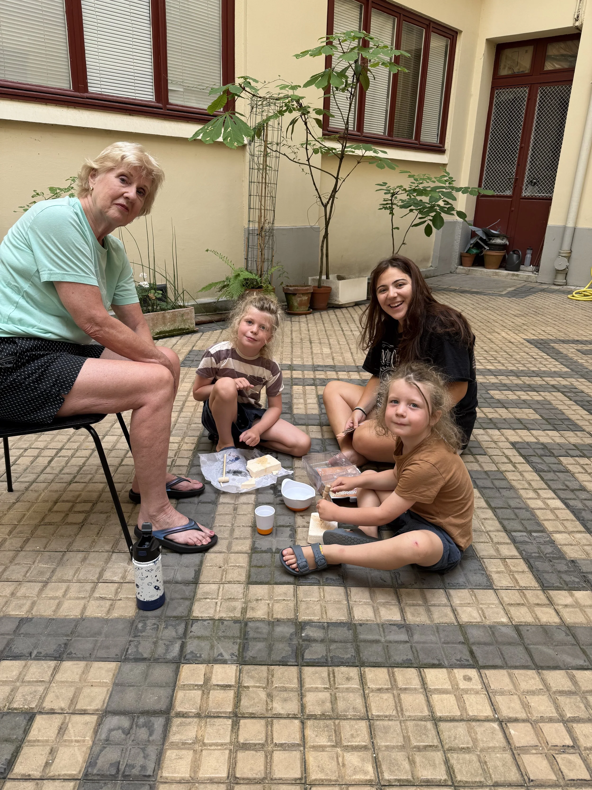 For dinner we went around the corner to a little Greek place with one table called Esti that did take away. We bought most of the food they had left, which was awkward as two people walked in behind us and half jokingly asked us to not buy everything. It was very good and we all ate inside our apartment and watched Inside Out 2. A big storm came through during the movie with very loud thunder, pouring rain, and strong wind. Everyone was happy to be eating at home. Grandma put the boys to bed which they now very much prefer as she will spend much more time on the process than Kayleen or I will.