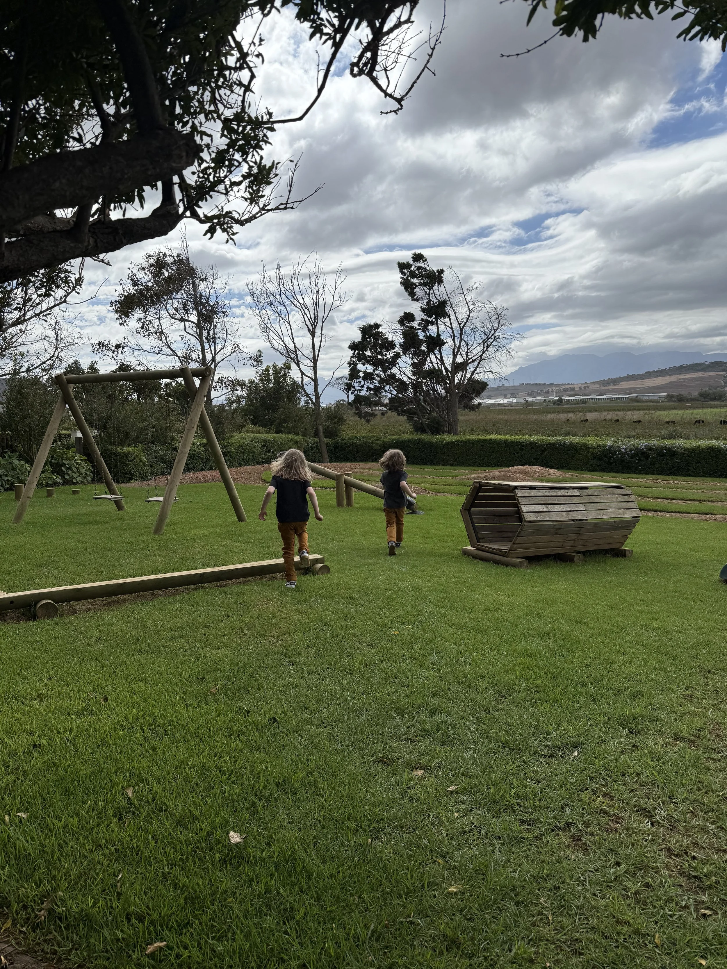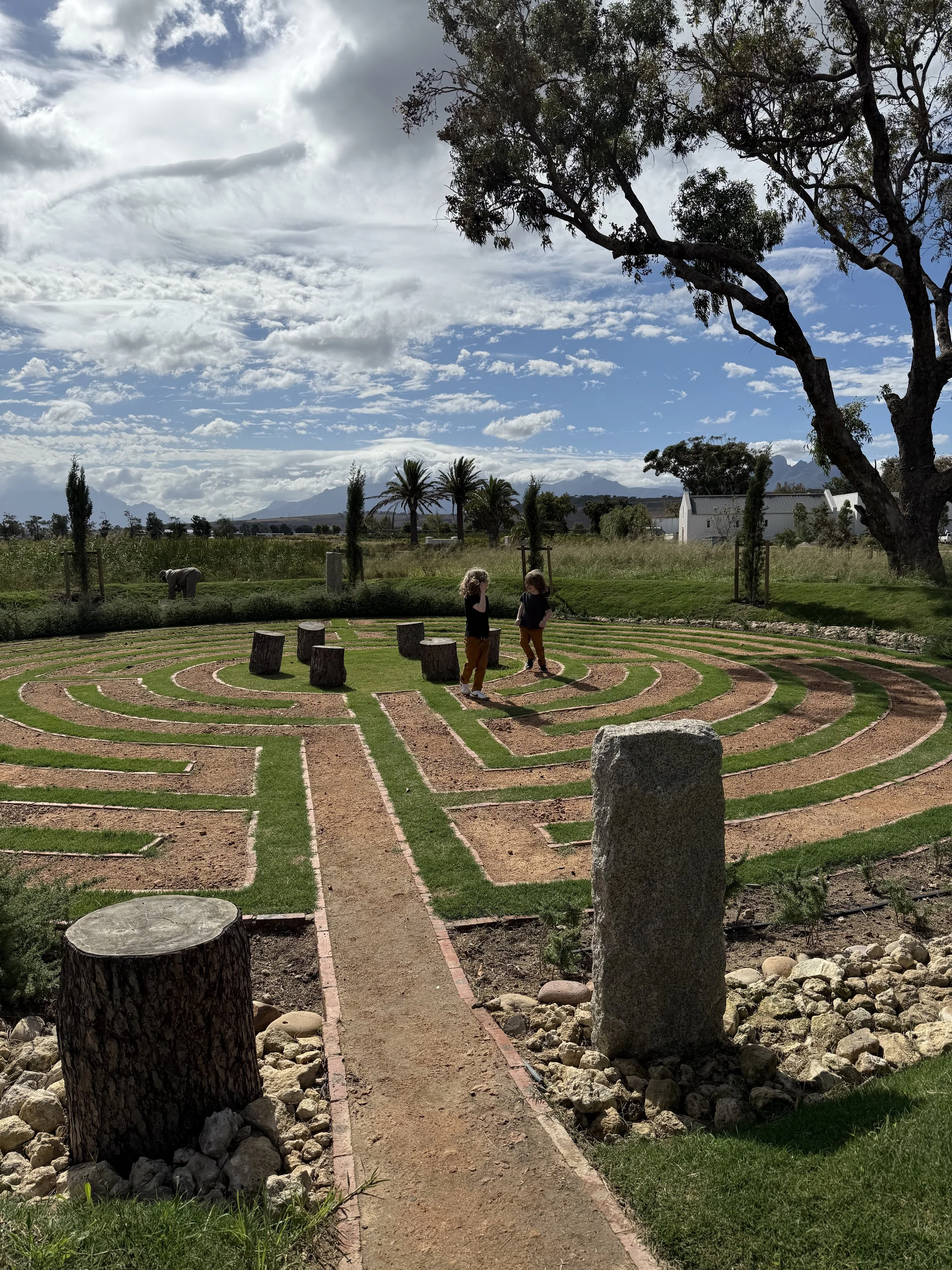 We stayed at Vergenoegd Löw to do the art walk. We hadn’t known about this, but felt like a good idea to let the boys stretch stretch legs and for us to get moving after our big morning of eating delicious food. The art walk included 12 different installations across the property. It wasn’t designed this way, but we treated it like a scavenger hunt which helped to get Ollie and Lenny into it. Ollie’s favorite part of the entire day ended up being the labyrinth maze. The playground was not a part of the art tour, but the seesaw within was Lenny’s favorite part of the entire day. This area was just in sight of the patio where where me and Kyle did a wine tasting. The kids didn’t think we could see them so they would end up “battling” (really rolling and wrestling on the ground) much of the time.