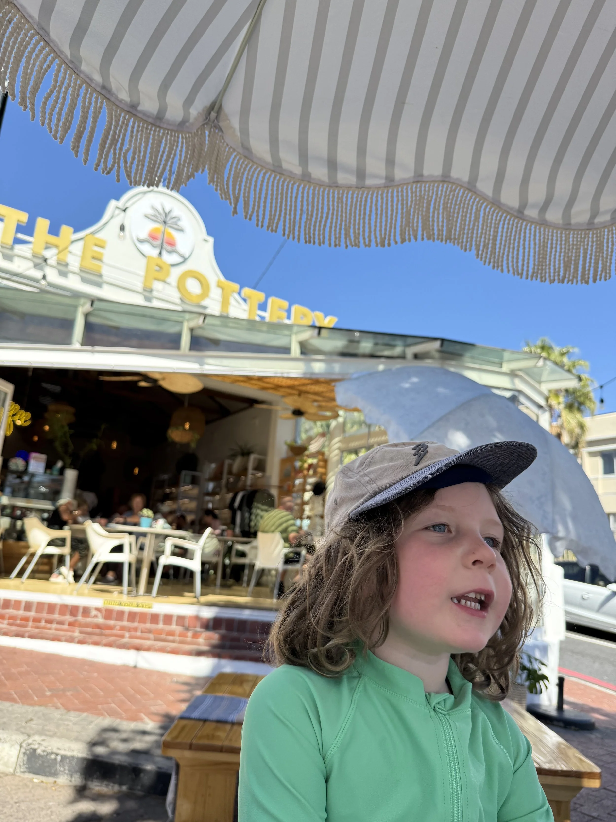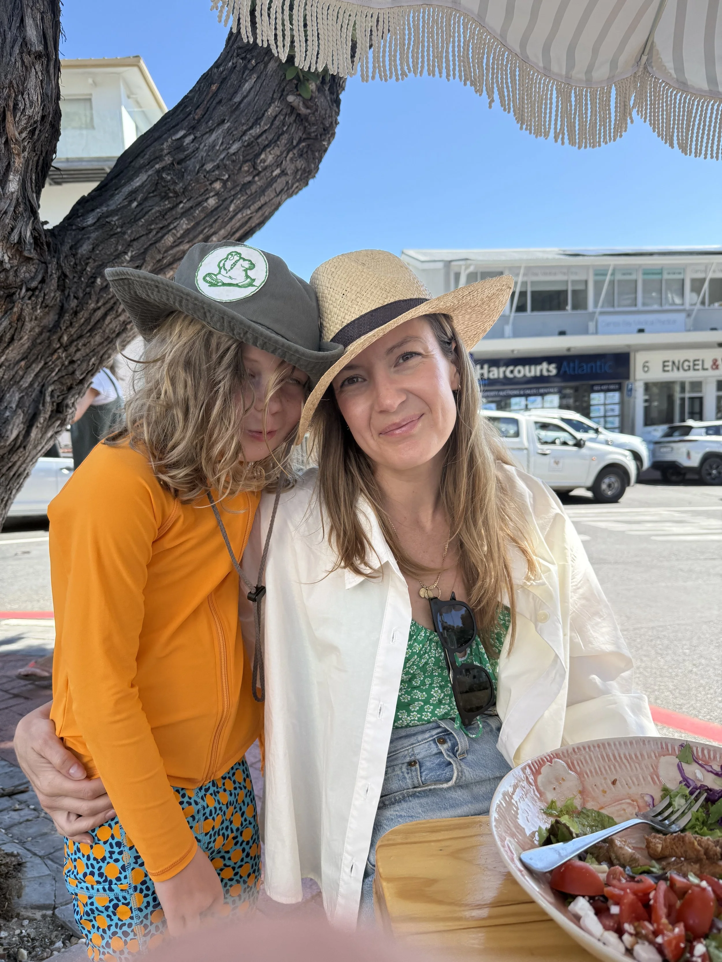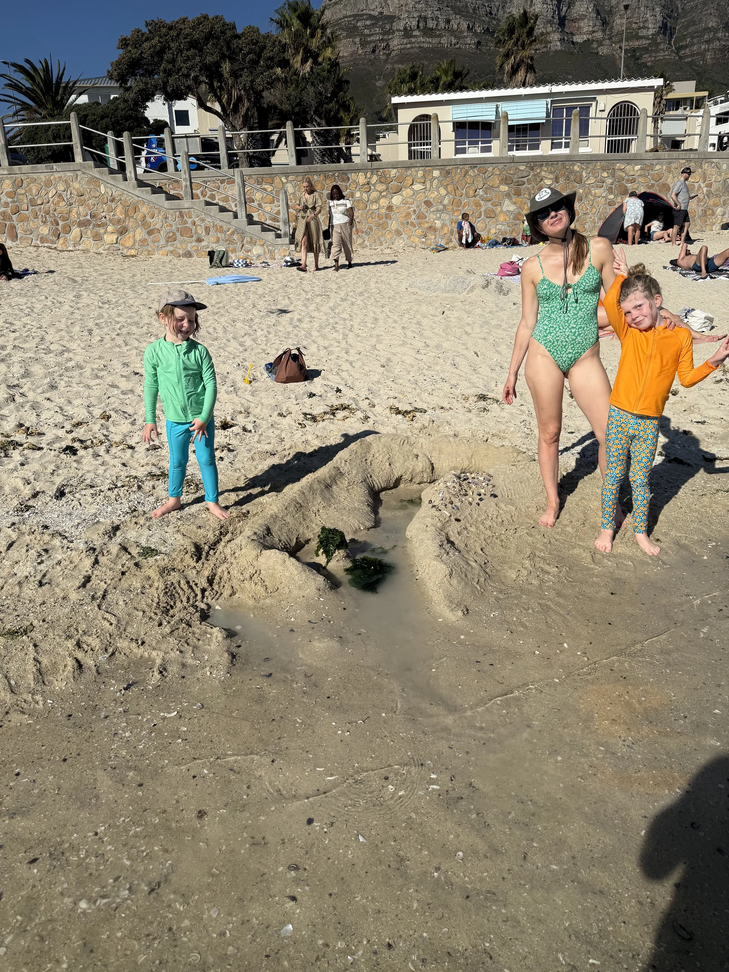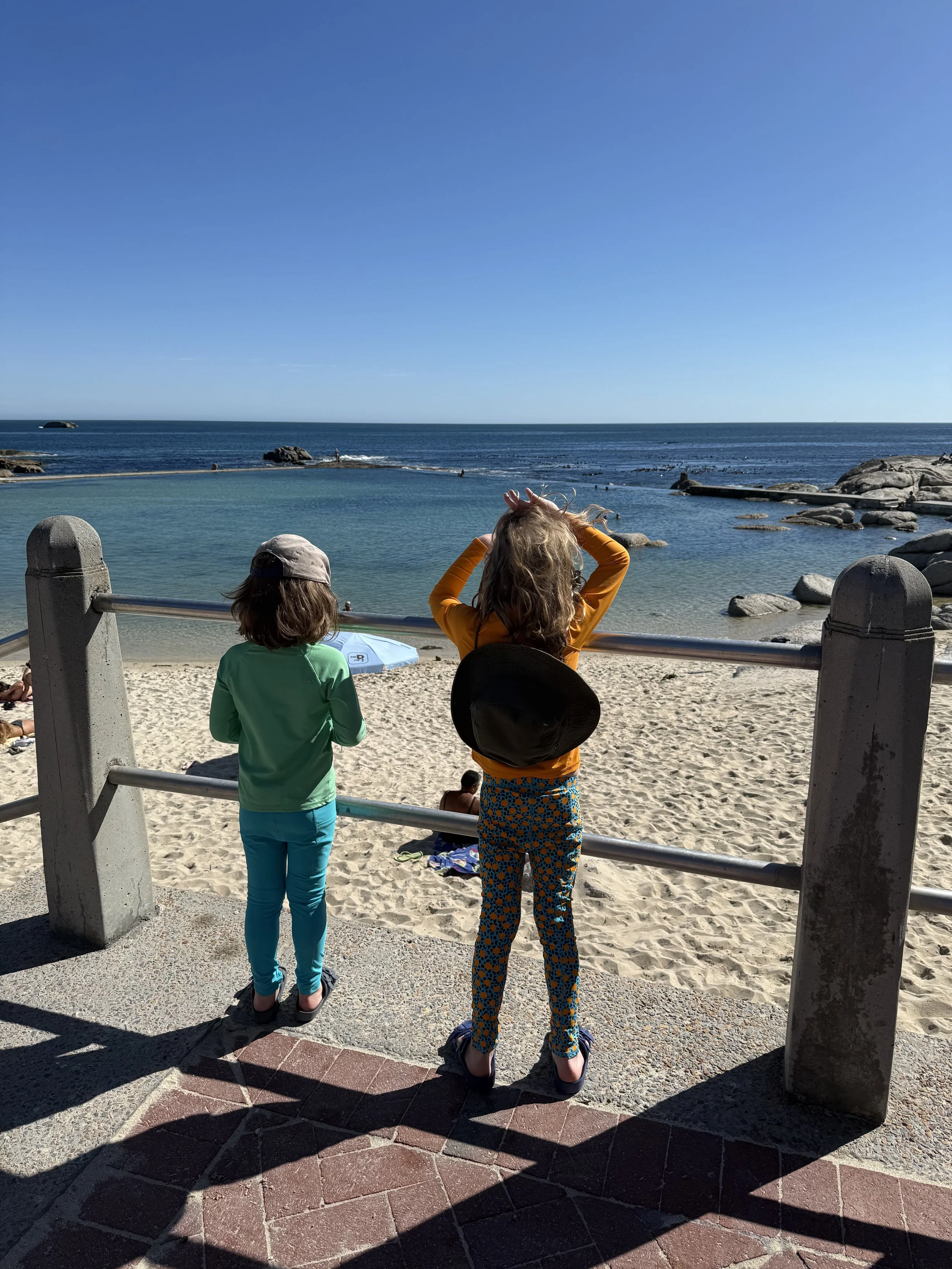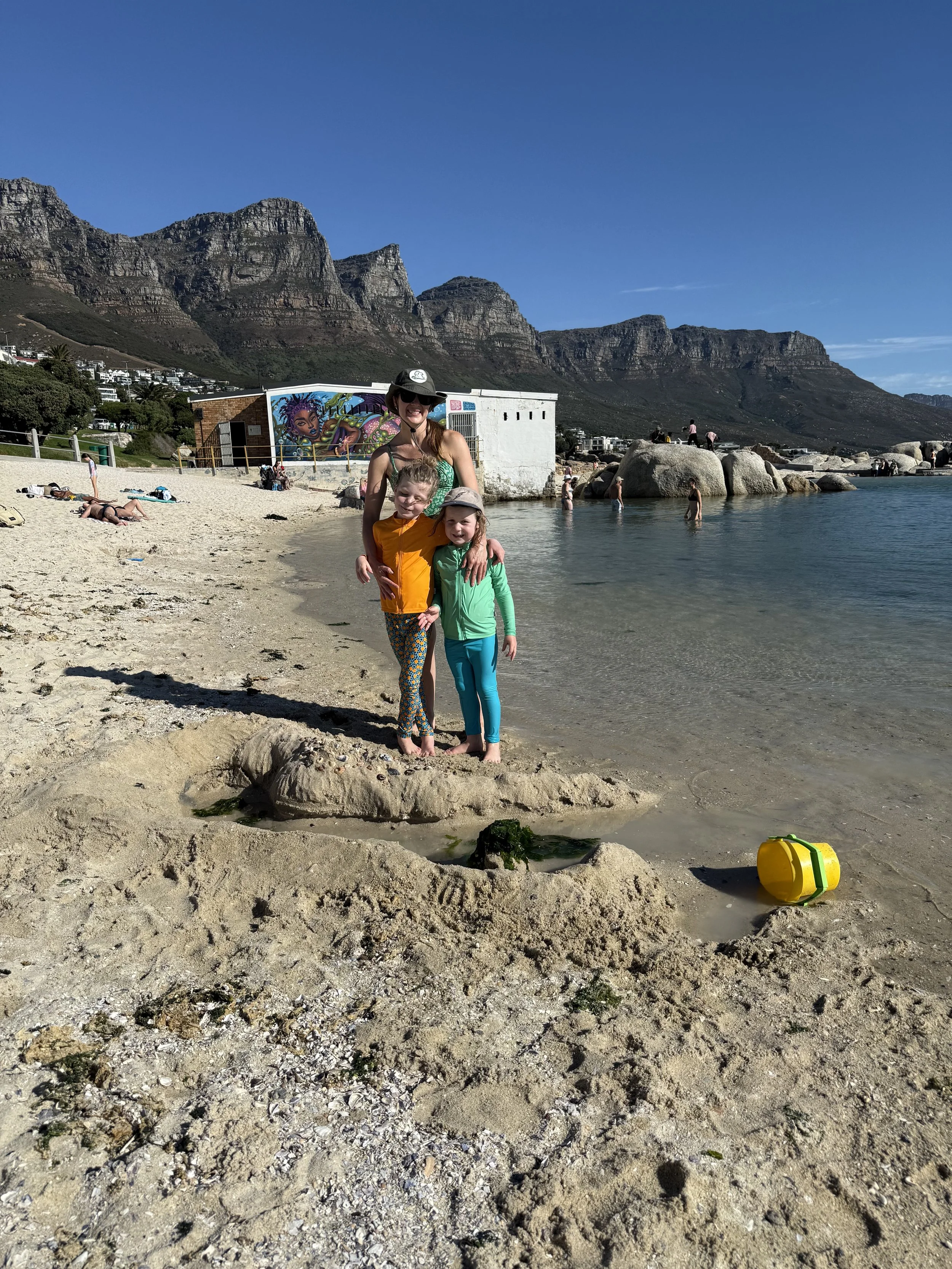 We were off to Camps Bay to hit the large tidal pool they have right on the beach. We had spotted it on our bus tour a week ago and vowed to come back on a hot day. Only a 10 minute drive from our house. But first we needed to eat lunch. We ate at a little cafe called The Pottery a block from the beach. The boys were getting feral at the end, being forced to sit when they could see the ocean.