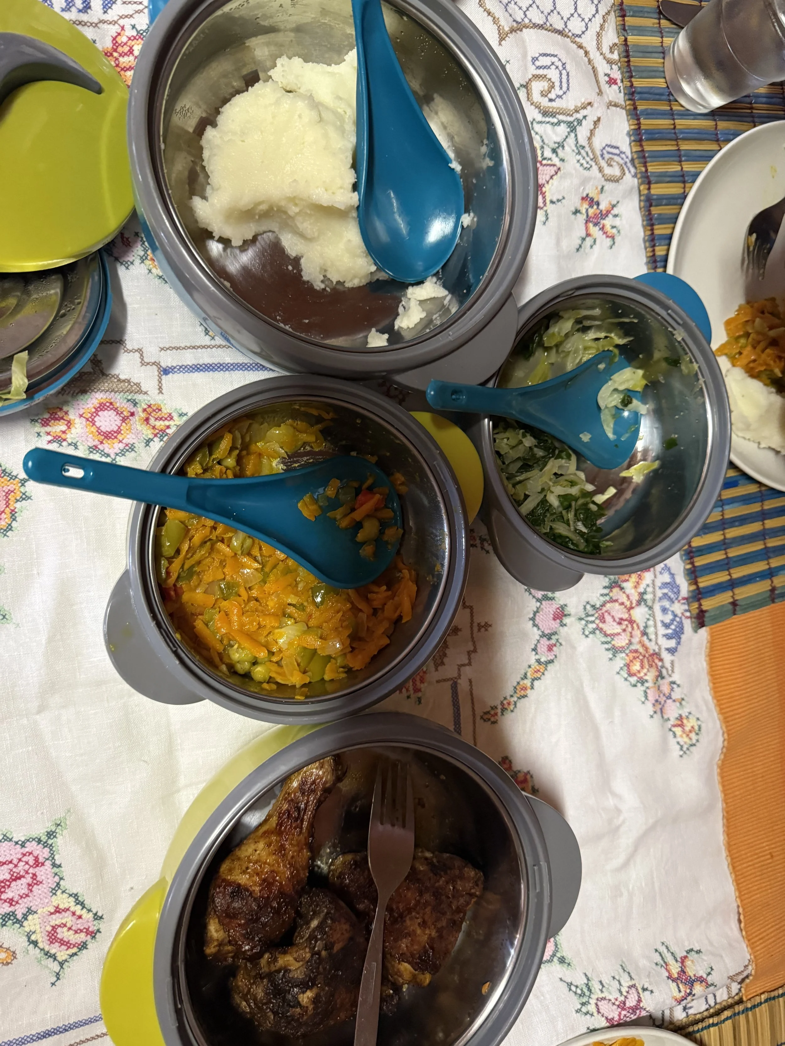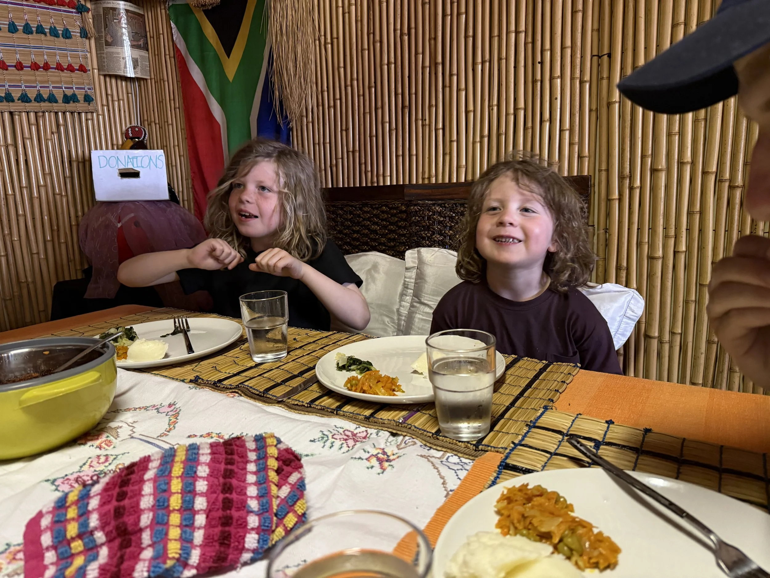 Next we went to mama Nombulelo’s house for a late lunch. She was a kind women in her 70s who cooked some traditional dishes for us. A meal of pap, chakalaka, chicken spice chicken and cabbage with spinach. The boys misheard “pap” and thought she said pepperoni which made them chuckle. Lenny thought the pap tasted cheesy and he requested seconds and thirds. Ollie tasted all of the foods but agreed the pap was his favorite.