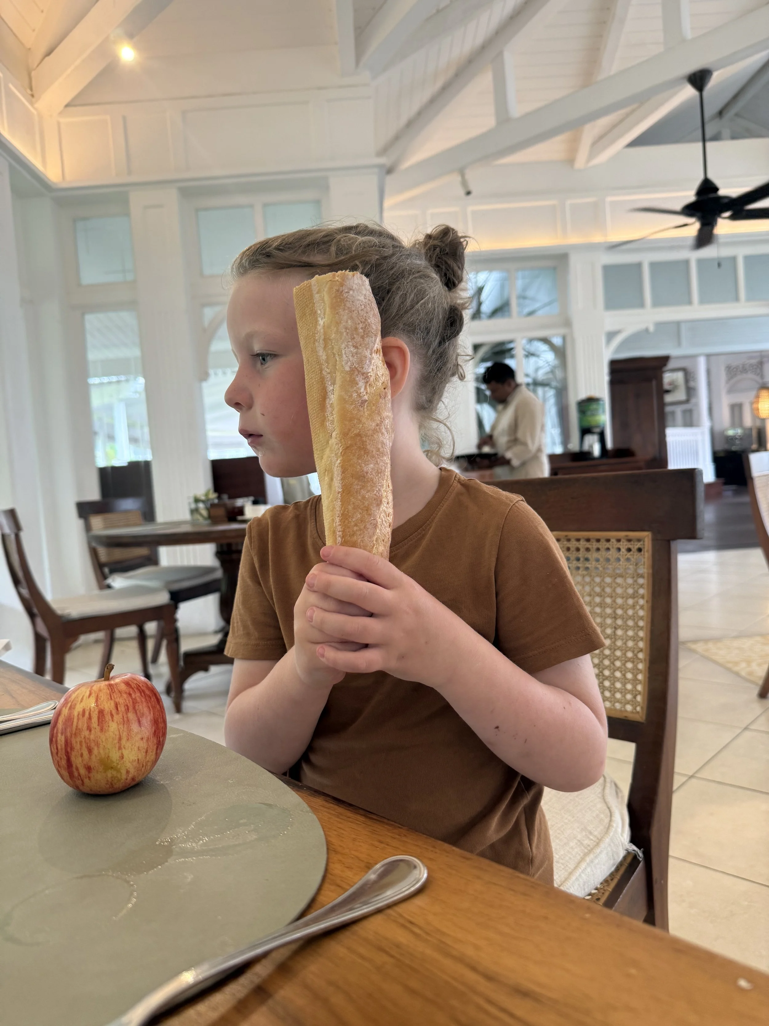 Our final full day at the resort in Mauritius! We decided to try to change it up a bit and venture outside of the resort to see some sites since it is unlikely we ever return to Mauritius given its distance from the US. We had our normal breakfast and Lenny thought he was being funny taking half of a giant baguette from the buffet. We scolded him for this but it ended up being really useful, but he didn’t know it would be!