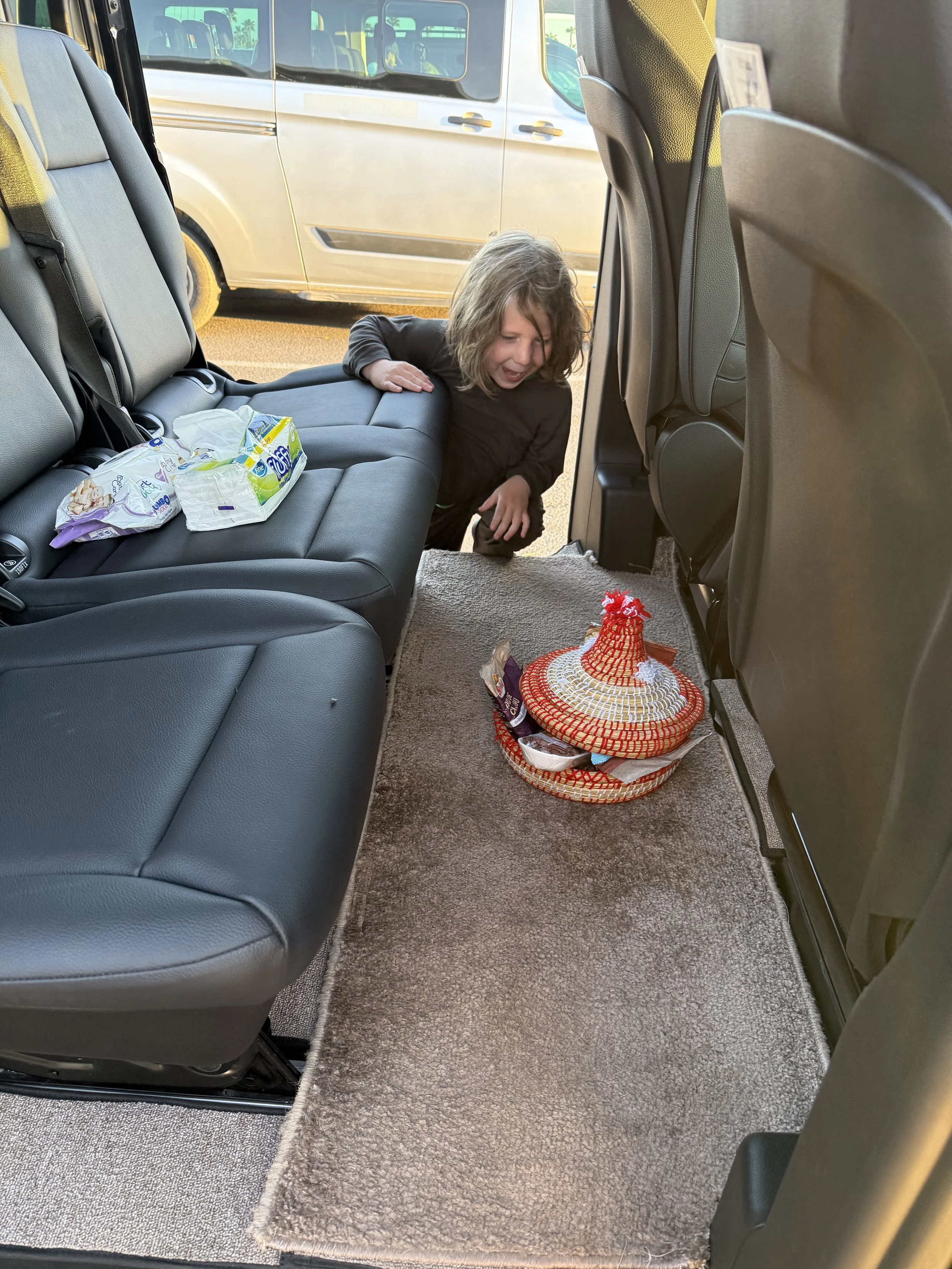 We booked our Morocco trip through a tour company and will be pretty heavily supported and handled during our time here. Abdul, our driver for the next 9 days, picked us up in a huge sprinter van equipped with Wifi, mini fridge for water and a basket of snacks. He also gifted us shoulder bags with our names written on them in Arabic. The boys immediately took to peppering their new friend with questions. Lenny led with, “Are those palm trees coconut trees?” Sadly they are not coconut palms but date palms. We had lots of dates in our snack basket and I’m hopeful we can turn the boys into date fans during our time here.