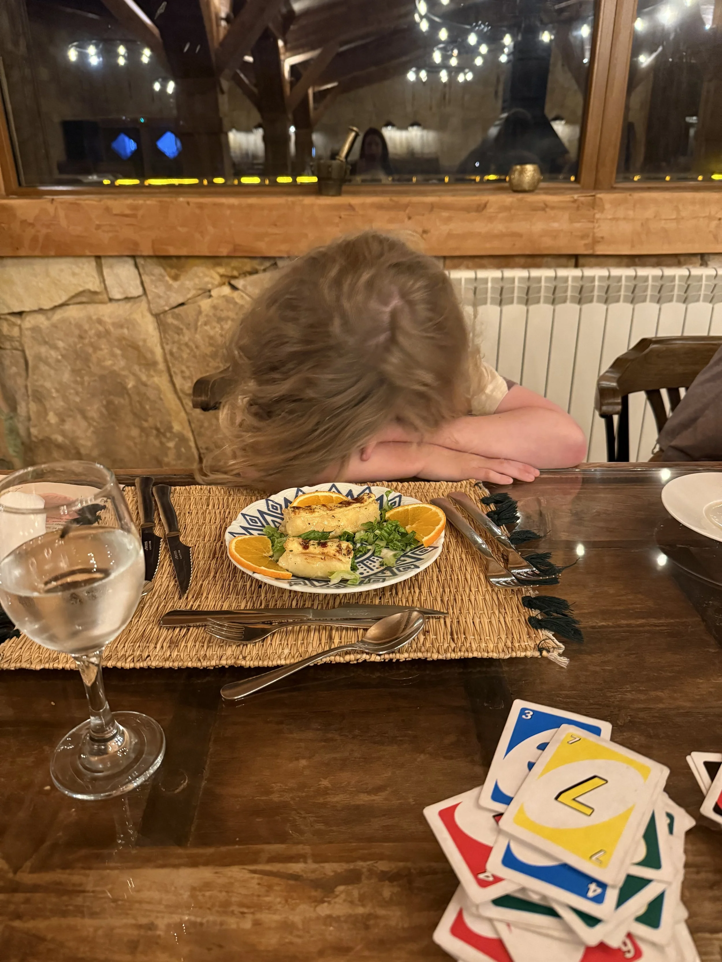 By the time dinner arrived the boys were a mess. They claimed they were hungry but barely ate and where clearly very tired. They did have energy for hide and seek in the massive dinning hall. Normally this would have been trouble but we were the only ones there so we let them have at it. It felt a bit like The Shining as Kayleen put it. Once we survived dinner it was off to bed with the boys excited to sleep in their beds in the loft of our room.