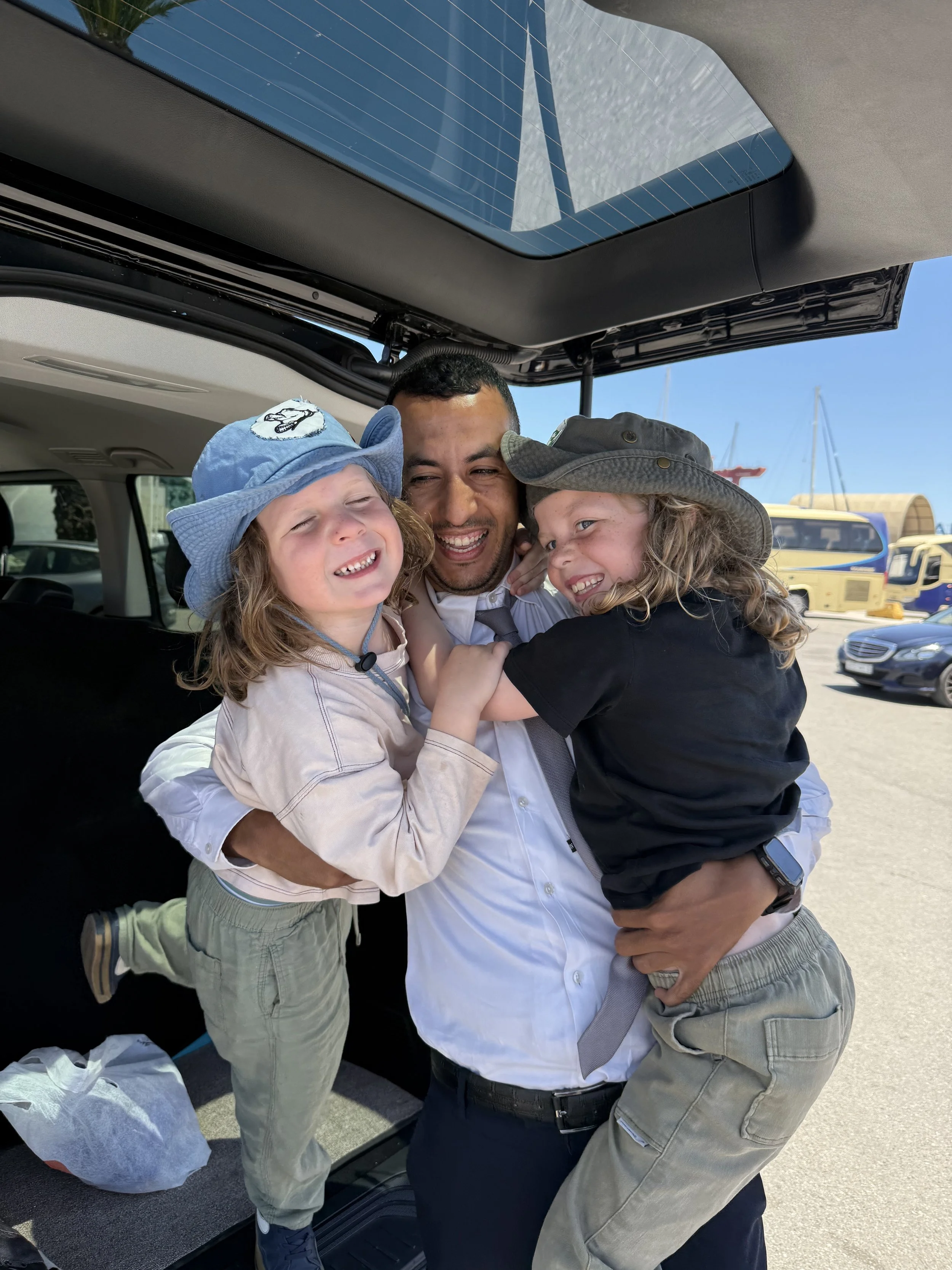 Abdul picked us up to get us to the ferry for our 3PM boat but before that Ollie needed to use the bathroom, #2. We went upstairs to a not so nice restaurant bathroom. After 5 minutes he yelled to me that there was no toilet paper. Sadly for me no one that worked at the restaurant spoke much english so I had to act out what I was looking for... I got it and we made it out to the car for our last drive in Morocco, only 2 minutes to the ferry. We said goodbye to Abdul and the boys gave him a big hug. Hopefully he will come to the US and we can show him around NYC one day as we promised we would.