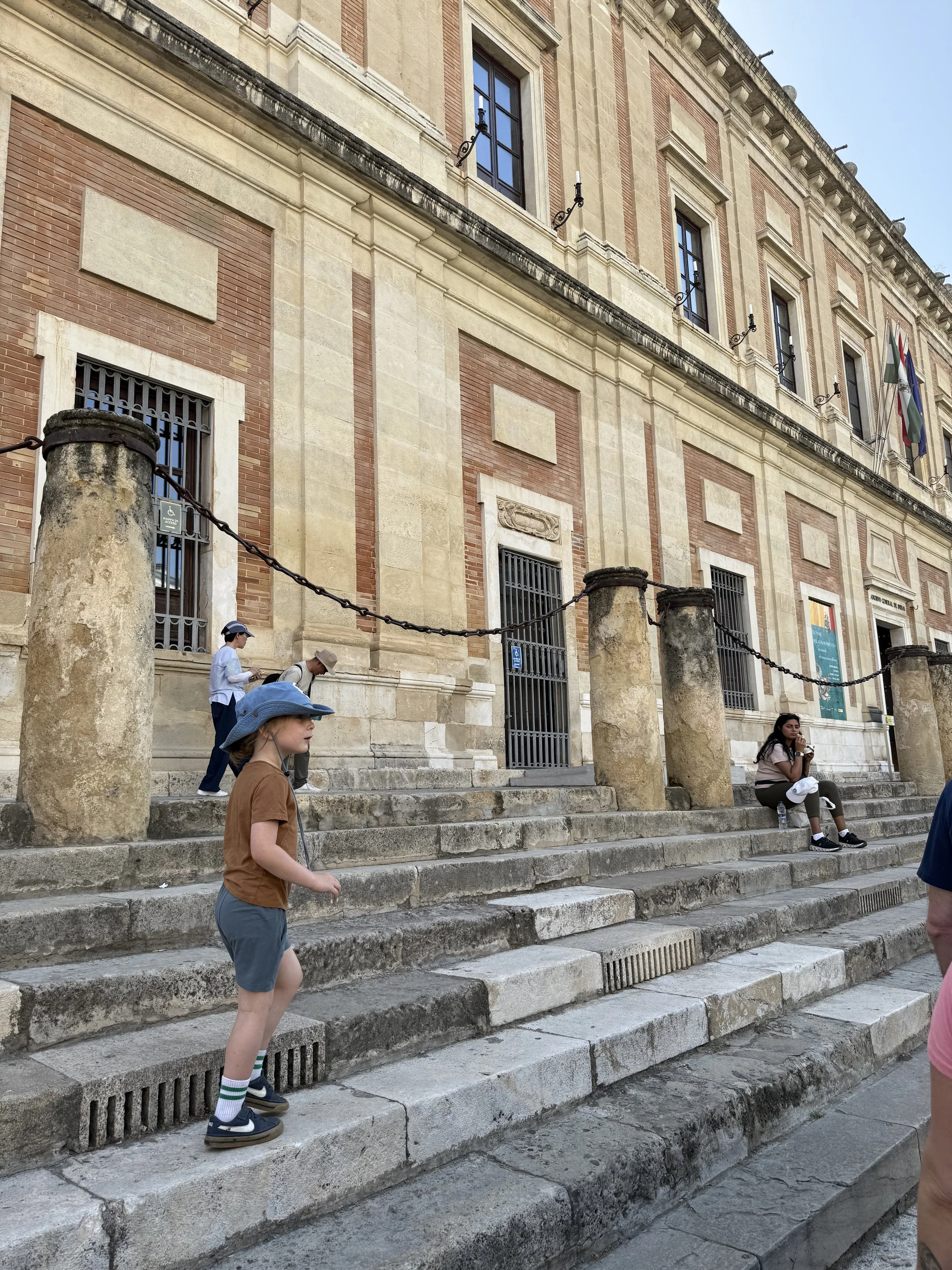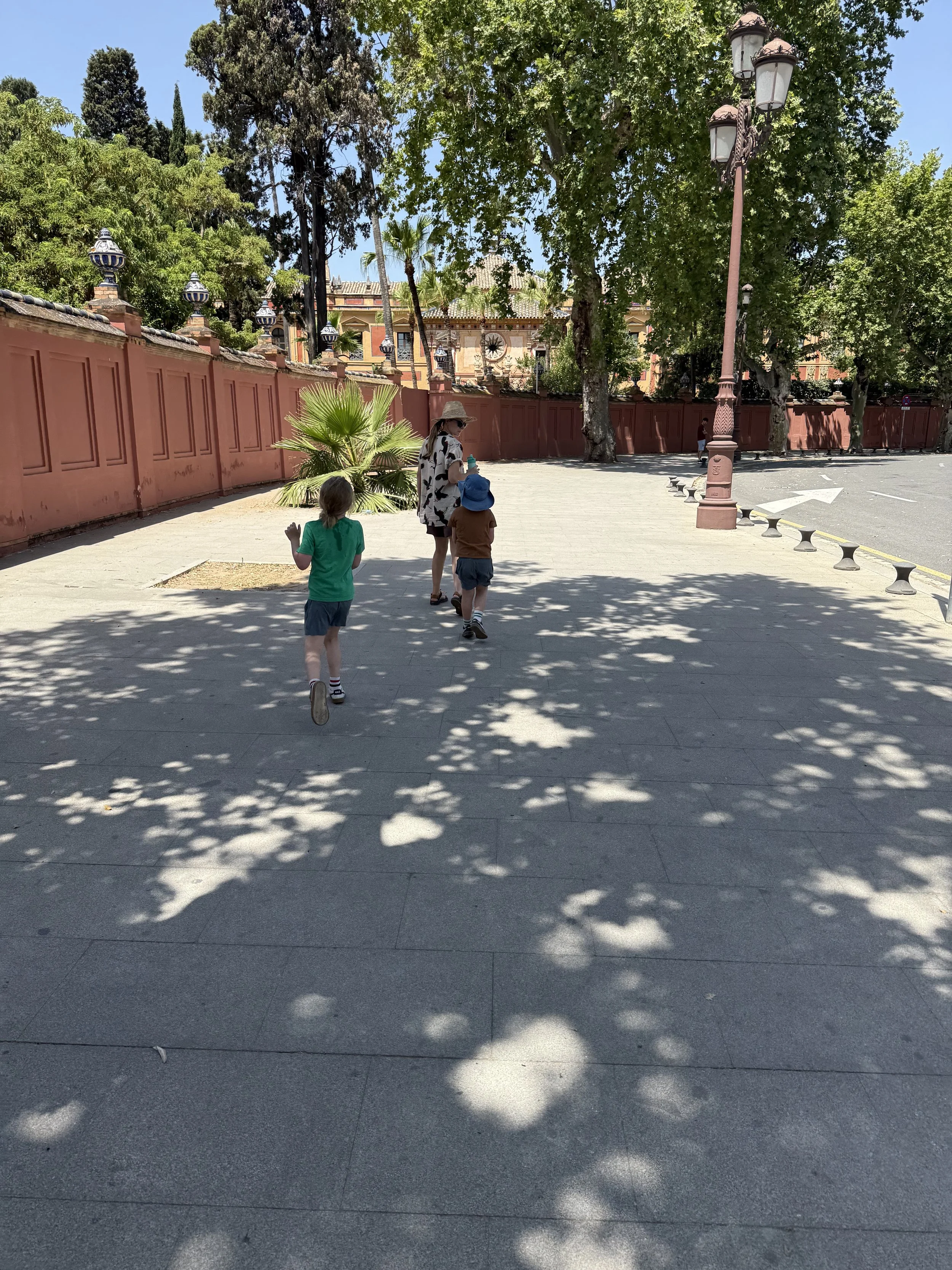 We grabbed pastries and sandwiches at a small cafe and then started our walk south to La Plaza de España and Parque de María Luisa. Today was our 9 year wedding anniversary and the kids were excited to take turns taking pictures of Kyle and I to varying degrees of success. We spent part of our honeymoon in Seville and when planning this trip it was lost on both of us that we’d be in this city for our anniversary. Its been a fun teaching the boys about what an anniversary is and reminding Lenny that he was in fact not at our wedding multiple times. We all loved the purple blooming Jacaranda trees so made sure to capture those. At the playground, Len got the hang of pumping his legs on the swing and was terribly proud of himself. His new ability has not seemed to reduce his requests for extra pushes, though.