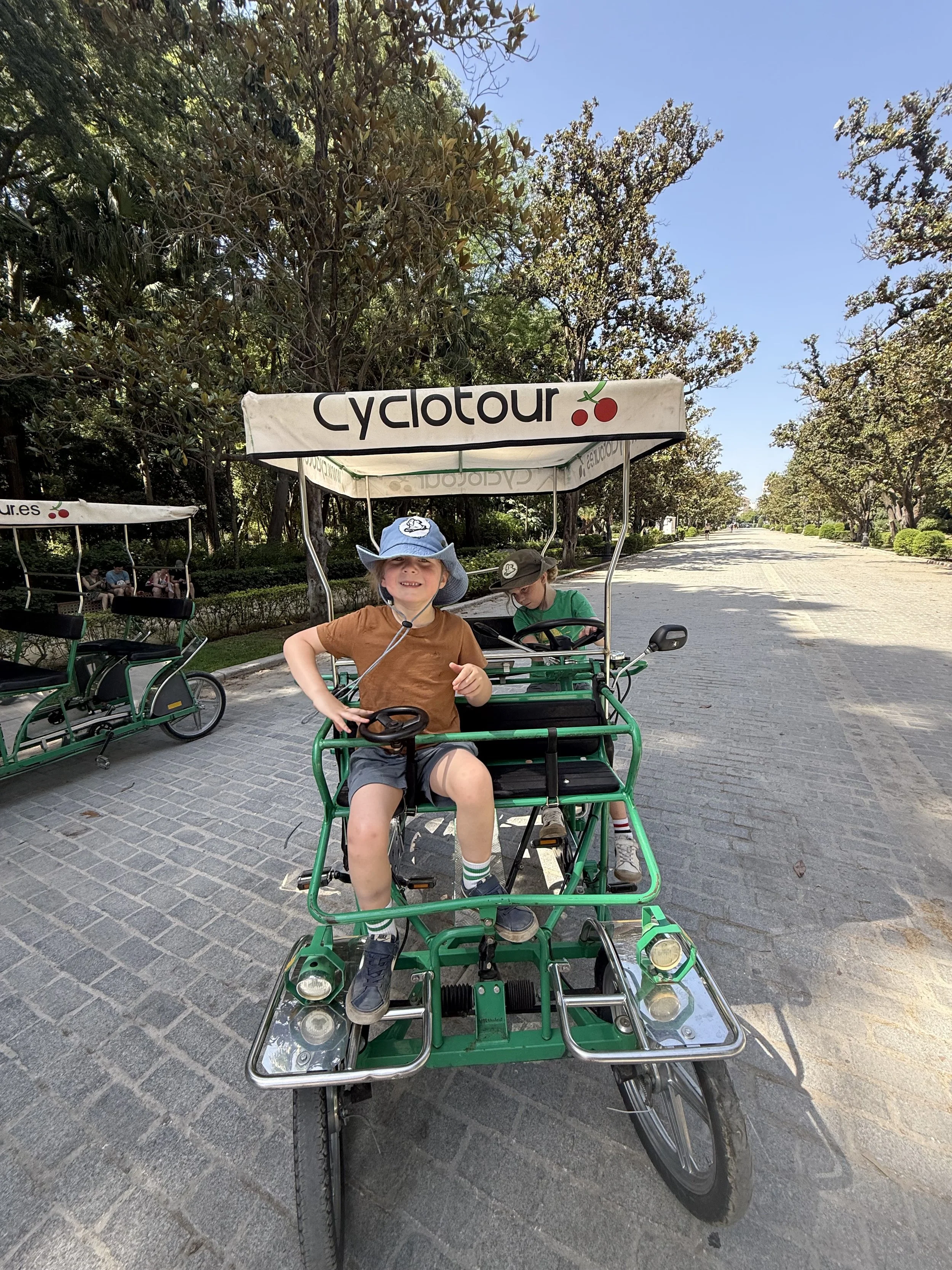 When we arrived at Plaza de España, it was nearing noon and the temperature was rising. We soon found these 4-person bikes to rent and immediately booked one for our crew. Len was happy (at first) to sit in the front and act as captain while Ollie was less than thrilled to sit between Kyle and I without a job. He tried to pedal for a bit, but his legs were just barely too short. We stopped for ice cream pops at one point, the boys choosing the small bag with 5 mini pops in each. I got a small lemonade slushy and Len probably had more than half of it.