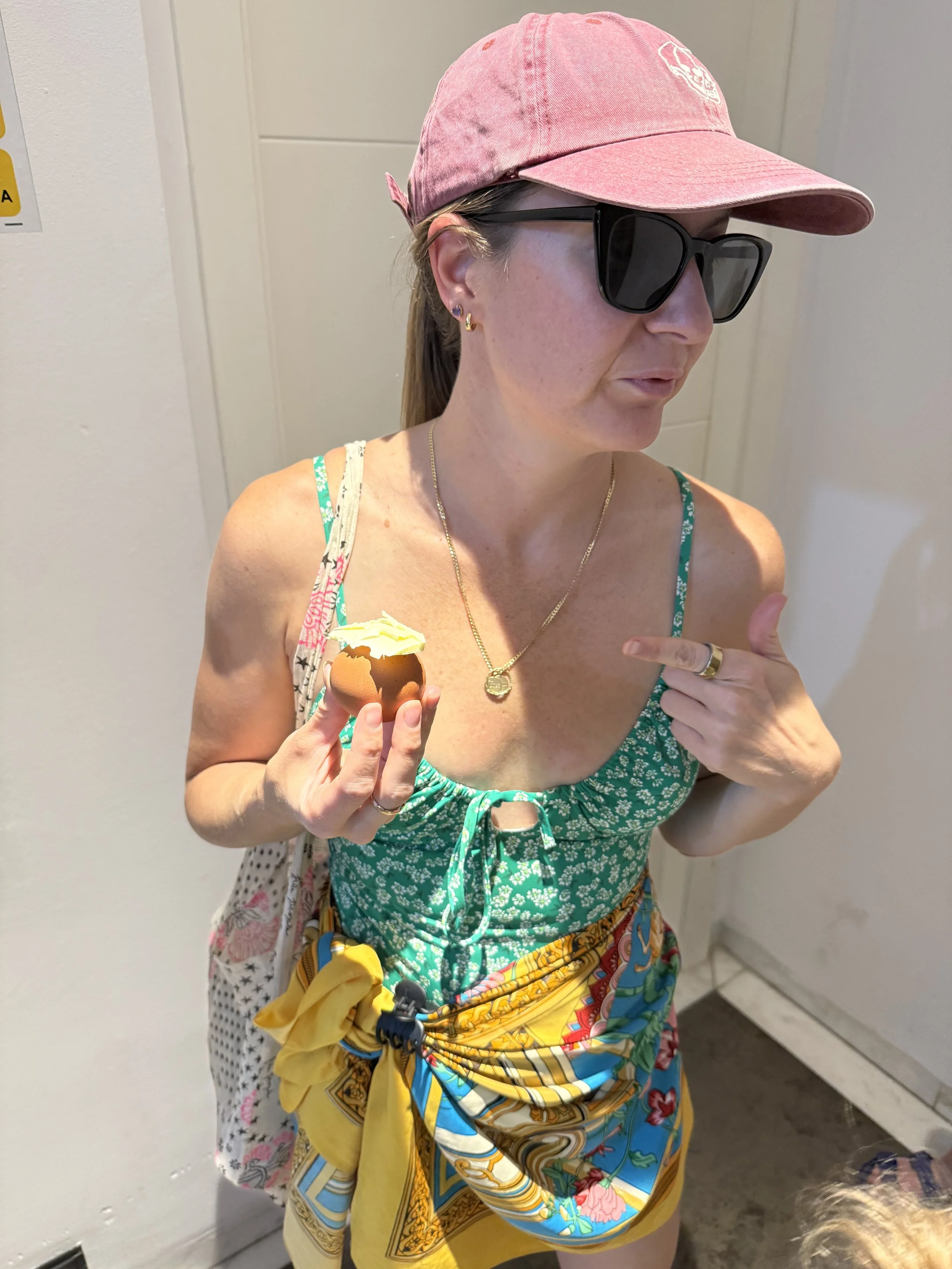 We promised the boys a rooftop dip when we got back so we made our way upstairs. Before jumping in the water though, we started our egg cooking experiment. Before going to the aquarium, Kyle left the pan on the roof to heat up in the sun. Kyle had told the boys that it was hot enough to cook an egg outside this week and they asked to see the proof. We added butter to the pan, cracked the egg and then watched absolutely nothing happen. The butter melted, but the egg white remained clear. We left the egg in the sun while we swam and it seemed to cure or dry rather than cook. Google showed egg protein needs to be 140F ish to coagulate or cook so we likely fell short and the cheap AirBnb pan didn’t help.