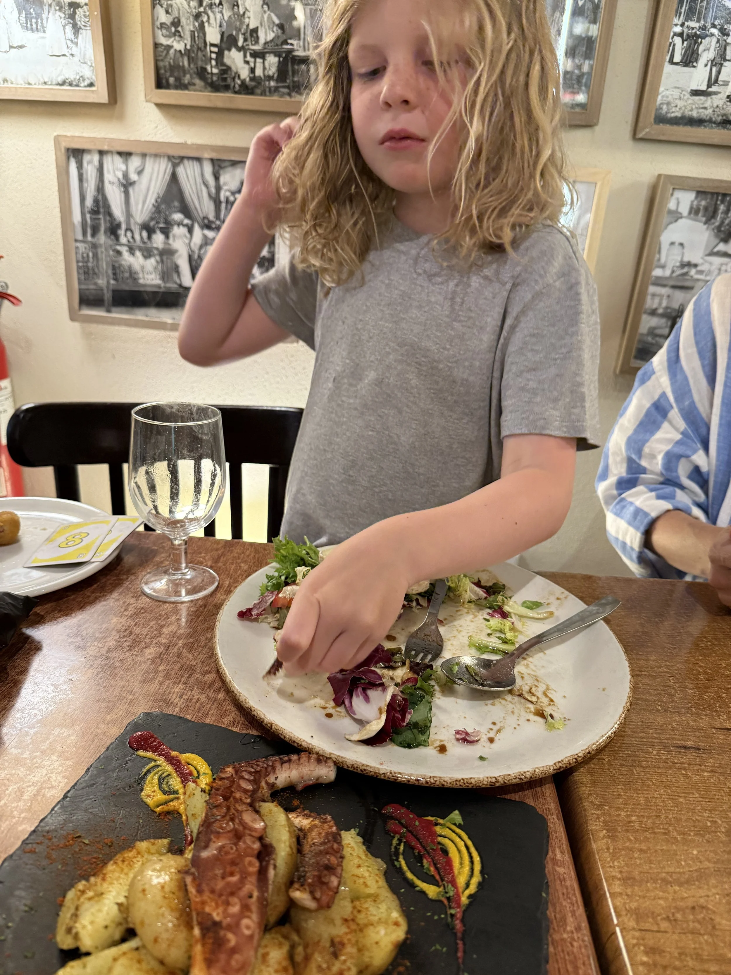 We went to dinner at a restaurant ~50 feet from the door to our apartment. The boys were wrecked and antsy from the jump, even with Uno. The food was fine and provided an opportunity for Ollie to try octopus for the first time (he wasn’t a fan). We also ordered ham croquettes that Ollie crushed on our first day in Spain only for him to ignore them tonight in favor of bagged breadsticks and french fries. Len subsisted on hummus and french fries tonight.