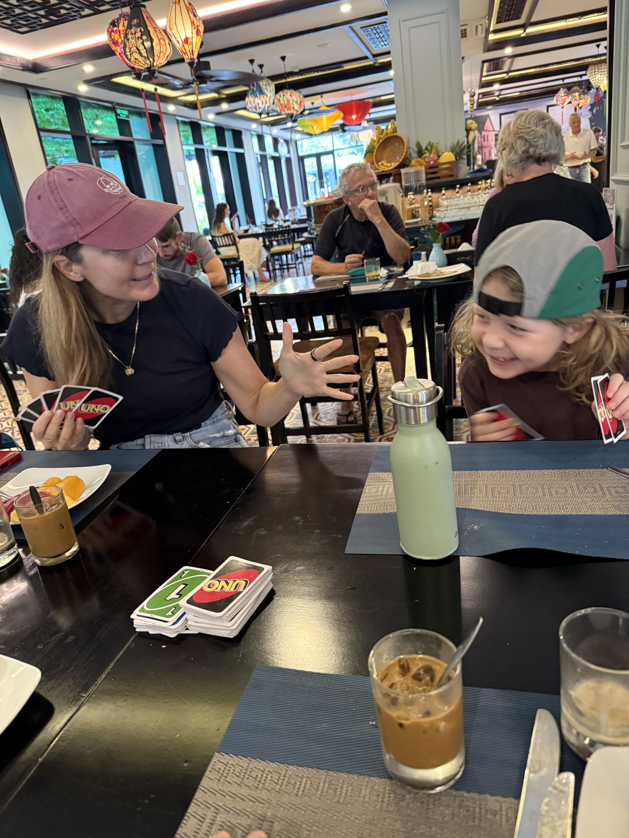 A day to explore on our own and the plan was to continue our motorbike adventures. There was a shop right next to the hotel that rented them but before we got to that we did our normal morning routine. Breakfast is now filled with Uno requests as the tournament heats up on our final full day. The boys both love the competition but I have a good lead at the moment.