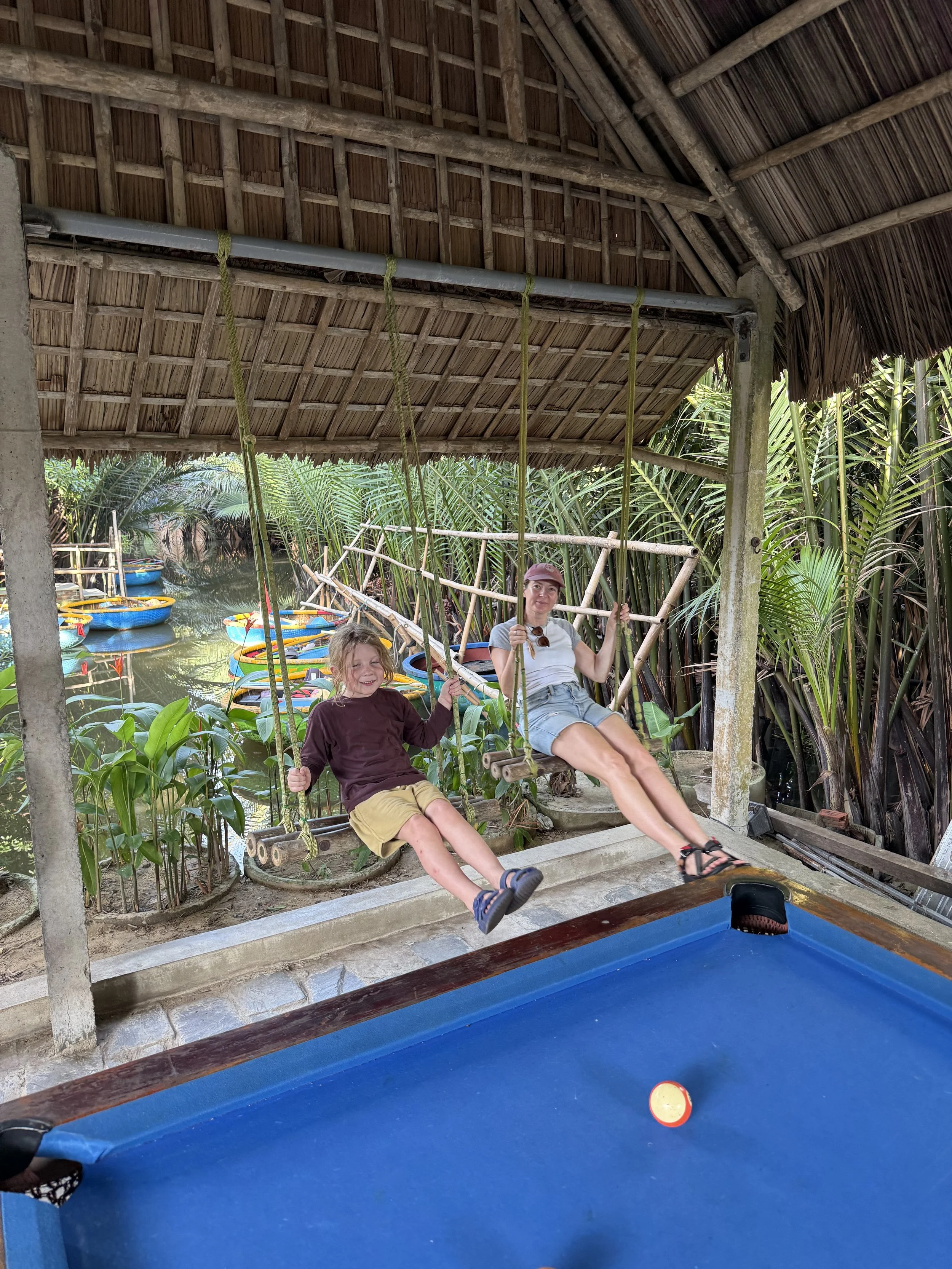 We headed back to the hotel to drop off all our nice new linen clothes and cool off in the room briefly. The one thing left we wanted to do in Hoi An was ride in a coconut boat. The drive to get to the area where they all leave from was ~25 minutes away. Driving around is pretty enjoyable so we took off to a place that Kayleen found which was supposed to be a bit less overrun with people. When we arrived it was just that, we were there with one other couple. They had a small bar and restaurant along with an old pool table that Ollie was very interested in. We squeezed in one game where Lenny was on my team and we used the bridge on every shot. Lenny was happier to attempt running swings on the three swings that went out over the water into the coconut mangroves. Somehow, he came away without any serious injuries though he ignored Kayleen and I telling him to stop many times.