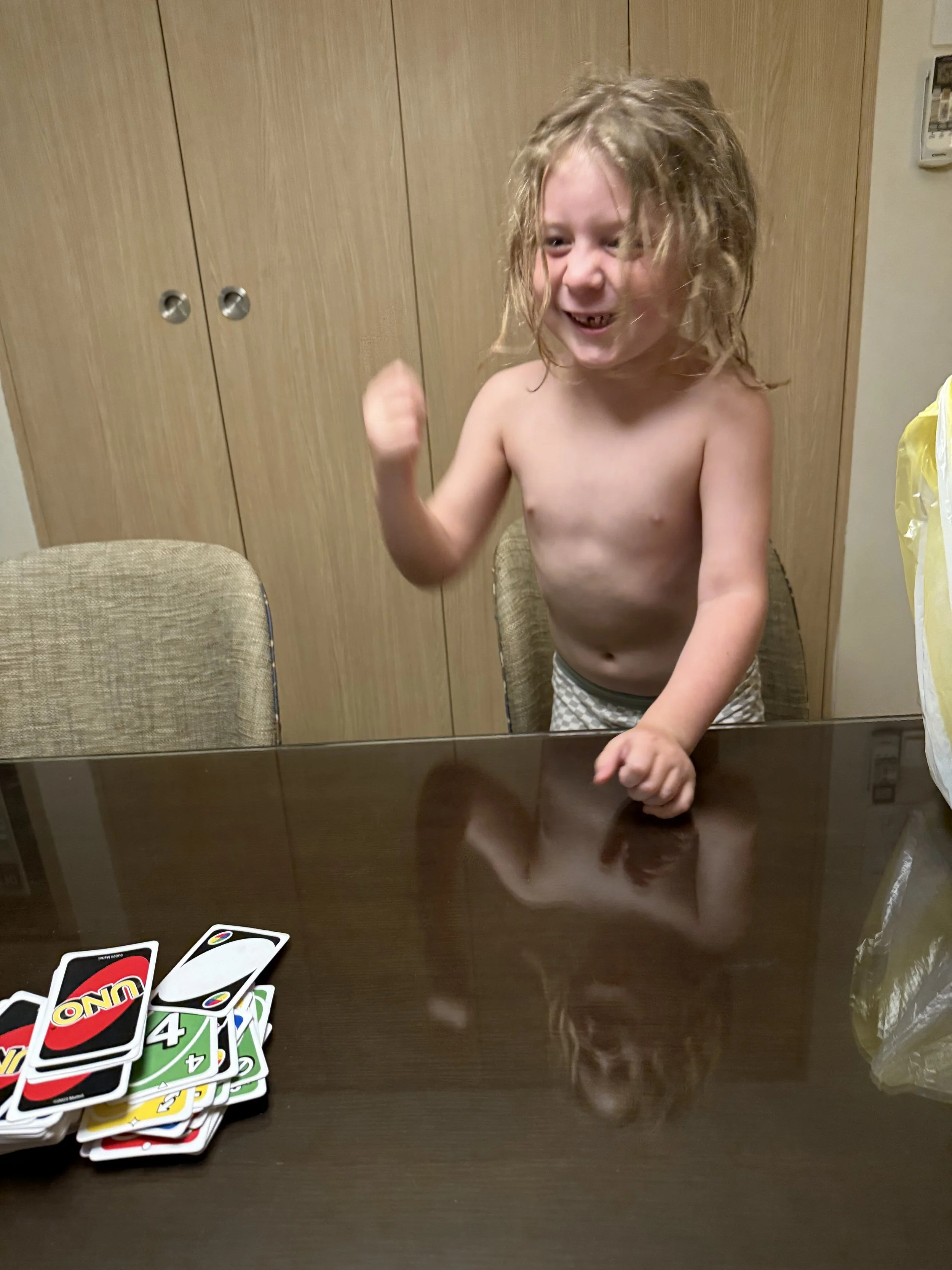 The concept of an Uno tournament has really reignited the boy’s interest in the game. Len continues to be sly whenever possible and has taken to taking multiple cards when he has to pick up and then puts back the least desirable card. We’ve implemented the “cheating penalty” more than a few times where he has to get an extra card each time he is caught. We snuck in a round after breakfast and, despite a few penalties, Len and Kyle remain neck and neck for the lead.