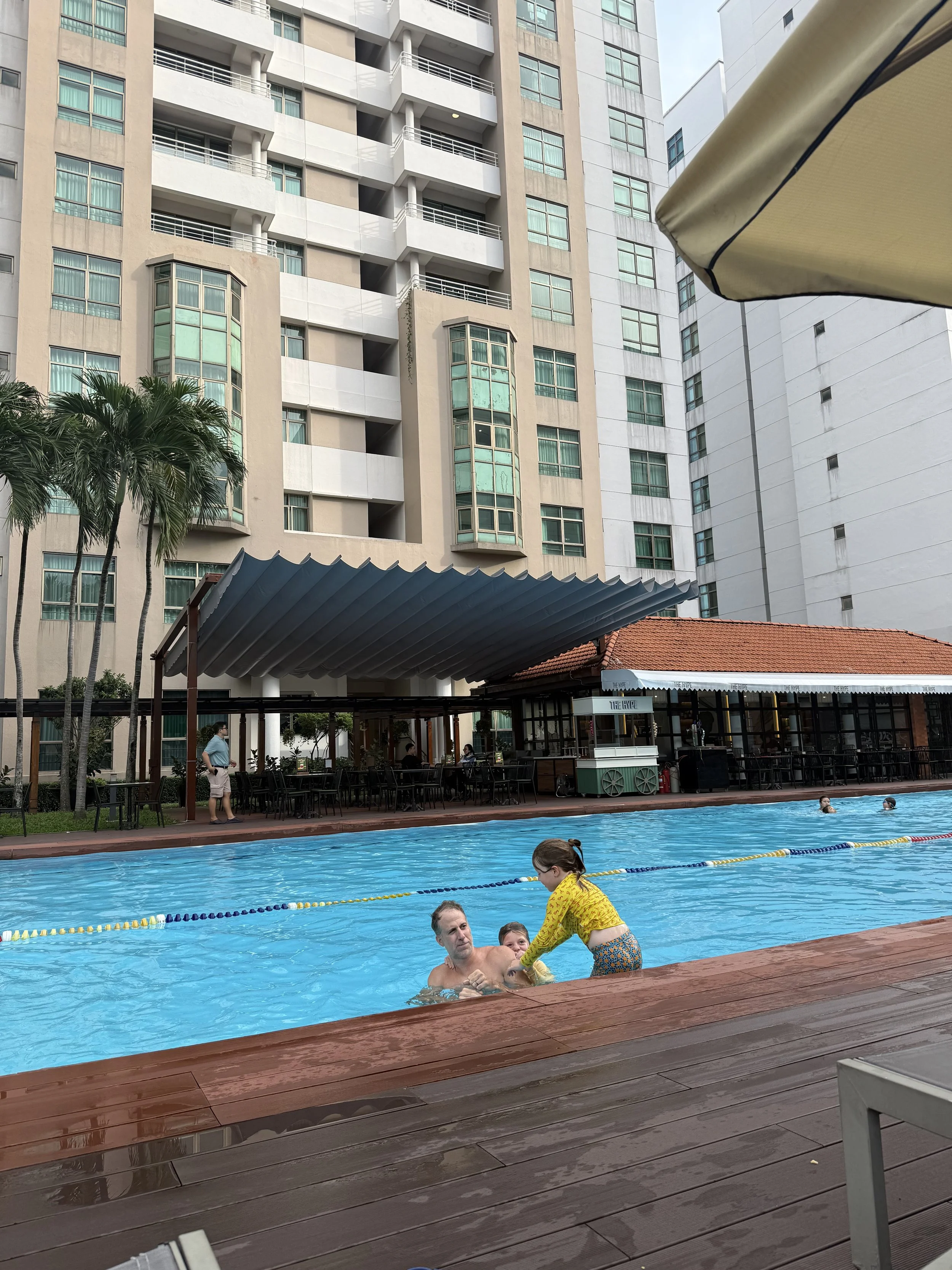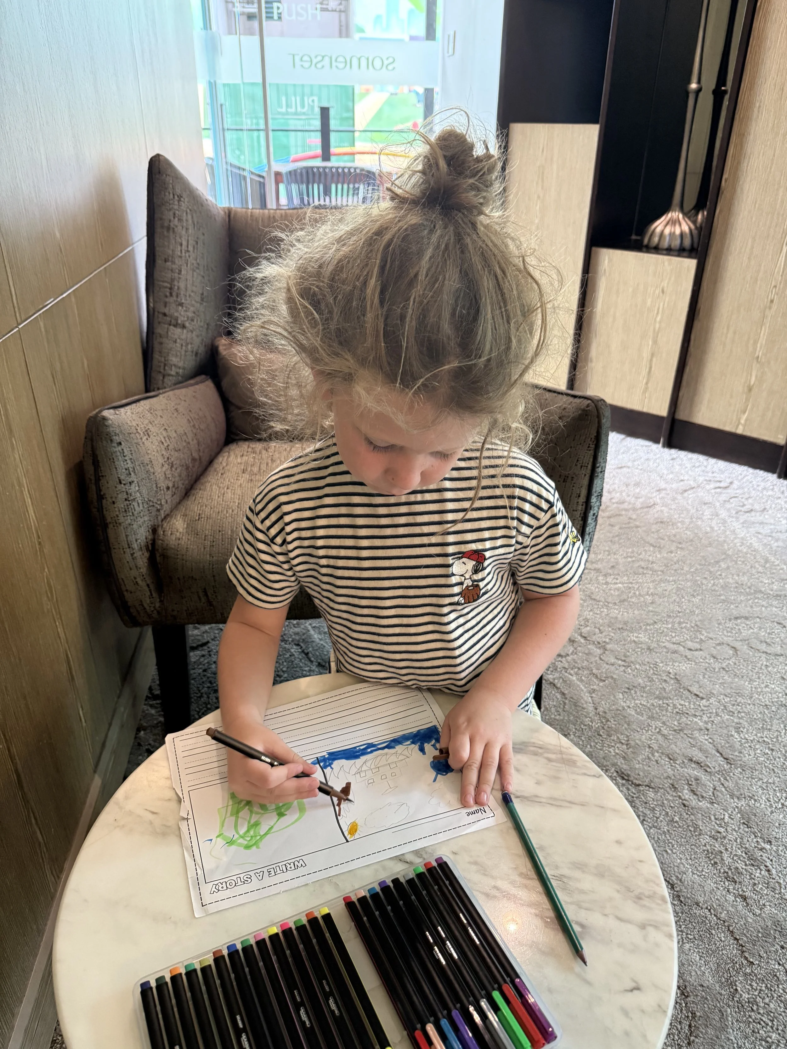 After some free time and life admin in the room, we went to the hotel’s business center for homeschool. Ollie did some creative storytelling and drew a made up scene that he then added narration to. I could tell he was completely making it up as he went but he had fun with it. While he was drawing, we each took an ear bud and listened to a bit more Harry Potter 6 which delighted him. He likes to remind me that early on in the trip, I told him I didn’t think we’d get halfway through the Harry Potter series but now it looks like we might finish the whole thing. We initially started the trip with me telling him he’d have to wait a few years before we let him watch the later movies but now I’m thinking we’d just let him watch them all.