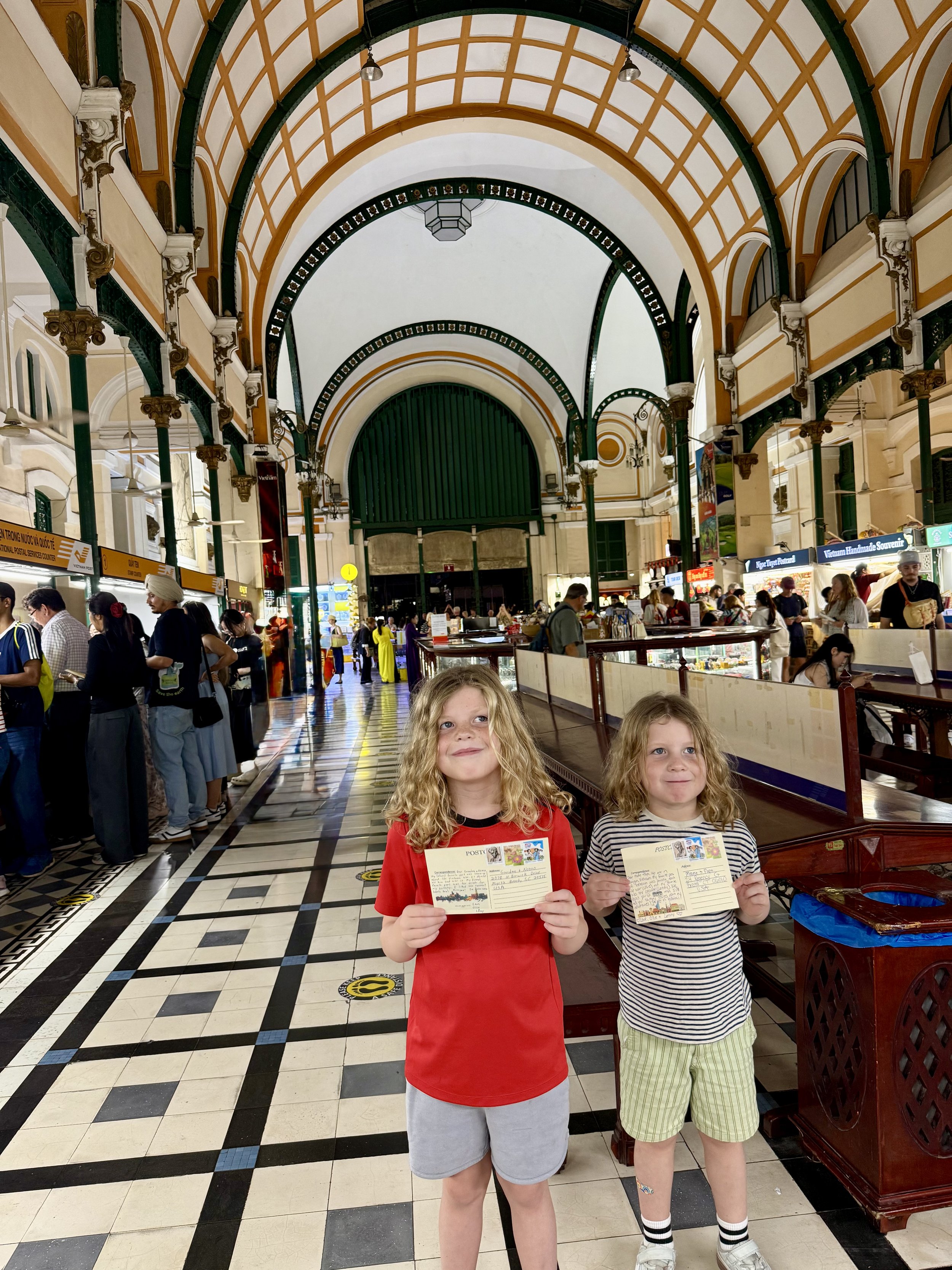 Before dinner we went back to the Central Post Office to actually send some postcards this time. We made it just before the post office closed but the boys were fading fast and getting through just a few postcards was a challenge. After we mailed our postcards, we went in search of new water bottles for the boys. When we got coconut coffee a few days ago on our Saigon tour, we saw a few perfectly sized water bottles for sale at the coffee shop (Cong Ca Phe). Luckily the store had just two bottles left and we snagged them. Kyle and I look forward to getting rid of the kids original water bottles which despite our best efforts have gotten pretty gnarly. We created a challenge where if the boys kept their water bottles clean and in good shape by the time we reached New Zealand we would get them each a new game on their iPad.