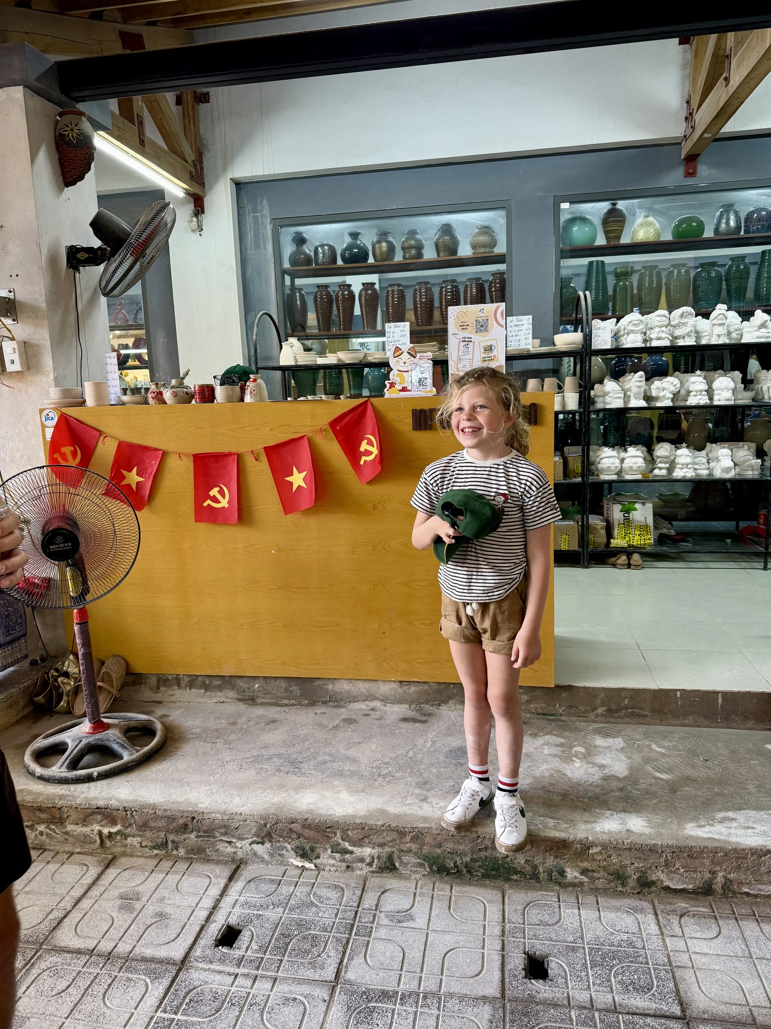We met our new guide, Fifi, in our lobby and we were on our way to Bat Trang Ceramic Village. The first things we noticed looked like mini coffins and we learned that after bodies are initially buried, some families will later dig up the bones, clean them and then place them in the upgraded ceramic coffin where the bones will then be stored. We walked through the ceramic area for 20 minutes and the kids complained they were melting and asking if we were close to the pottery studio incessantly. When we arrived, we got them ice pops immediately to stave off any meltdowns. Fifi also rearranged our schedule to get the kids on the pottery wheels as soon as possible to keep their moods up. We learned that the wheels were neither electric nor foot powered but low sitting hand powered wheels. We were impressed watching the artisan spin the wheel herself to center and stage our clay but we struggled to keep the same momentum. Soon Kyle and I abandoned our own wheels to become human motors for the boys. Len crafted a pot with a lid and Ollie a cricket house with a top. Sadly (thankfully?) these were just for fun as we won’t be taking these with us.