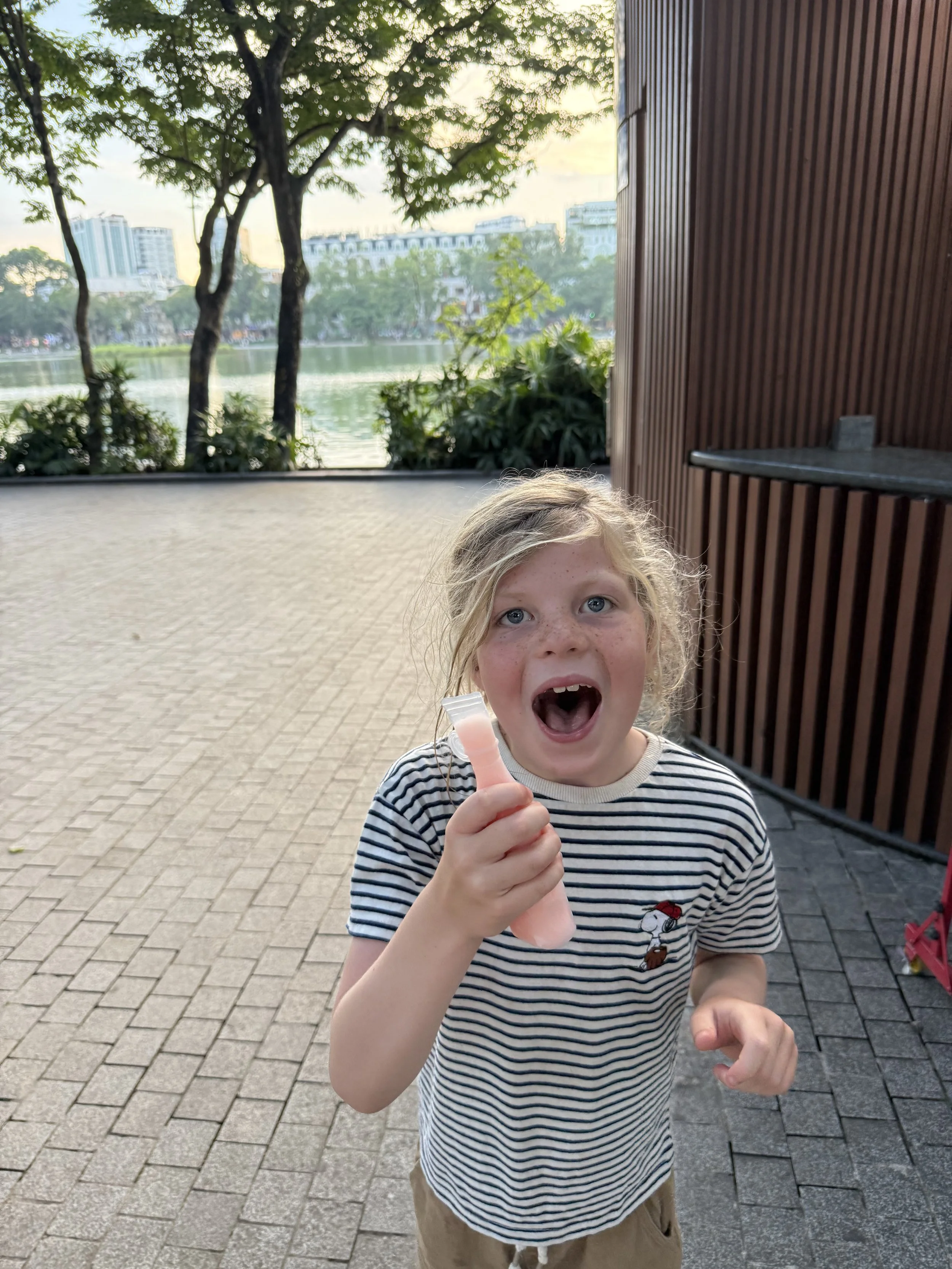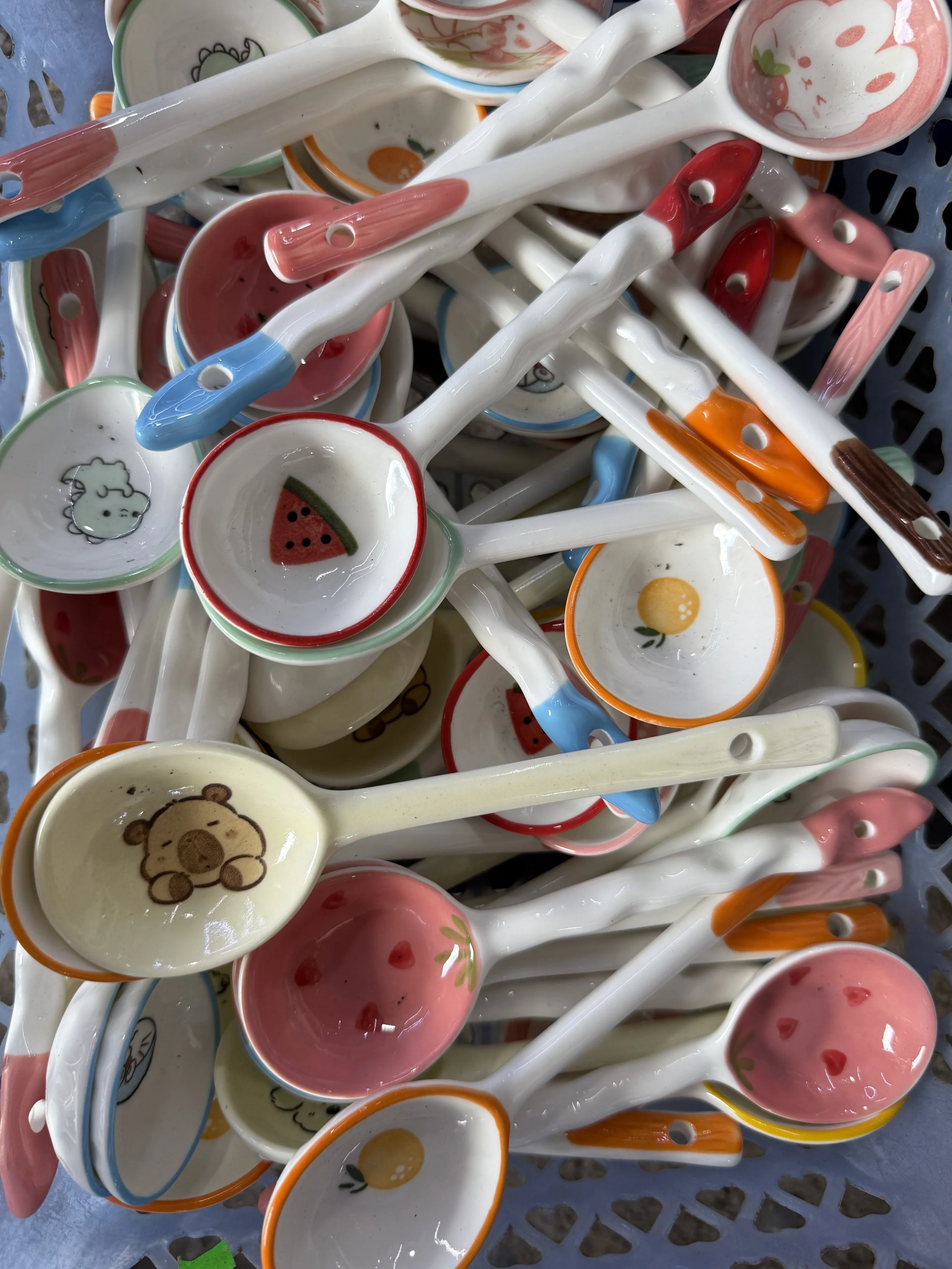 Since it was approaching the Mid-Autumn festival in Vietnam, vedors all over the city were selling special mooncakes and fruits like persimmons. We bought some special mini persimmons to snack on during our walk to the ceramic market but these weren’t a favorite in our group. We used to have a set of ceramic soup spoons and chopsticks that we bought in Hong Kong over 15 years ago. Over the years, all but 2 chopsticks and 1 spoon have fallen victim to the dishwasher or brother battles. We forgot to replace our ceramic spoons in Hong Kong so today was our chance. Len picked out a capybara spoon and Ollie a dinosaur spoon to bring back home. We also made the on the spot decision to buy a crab shaped candy dish that made us all smile so we couldn’t leave him behind.