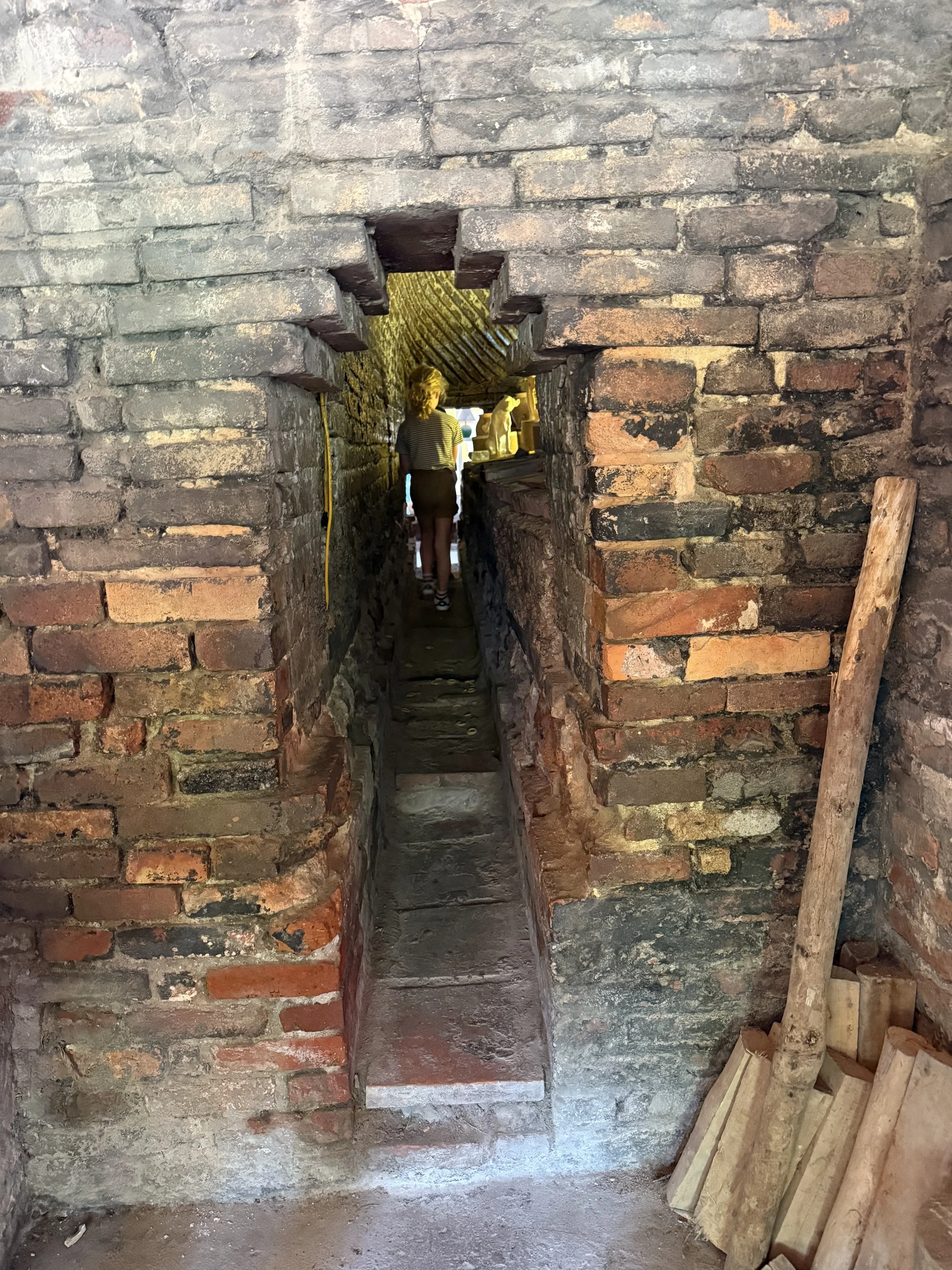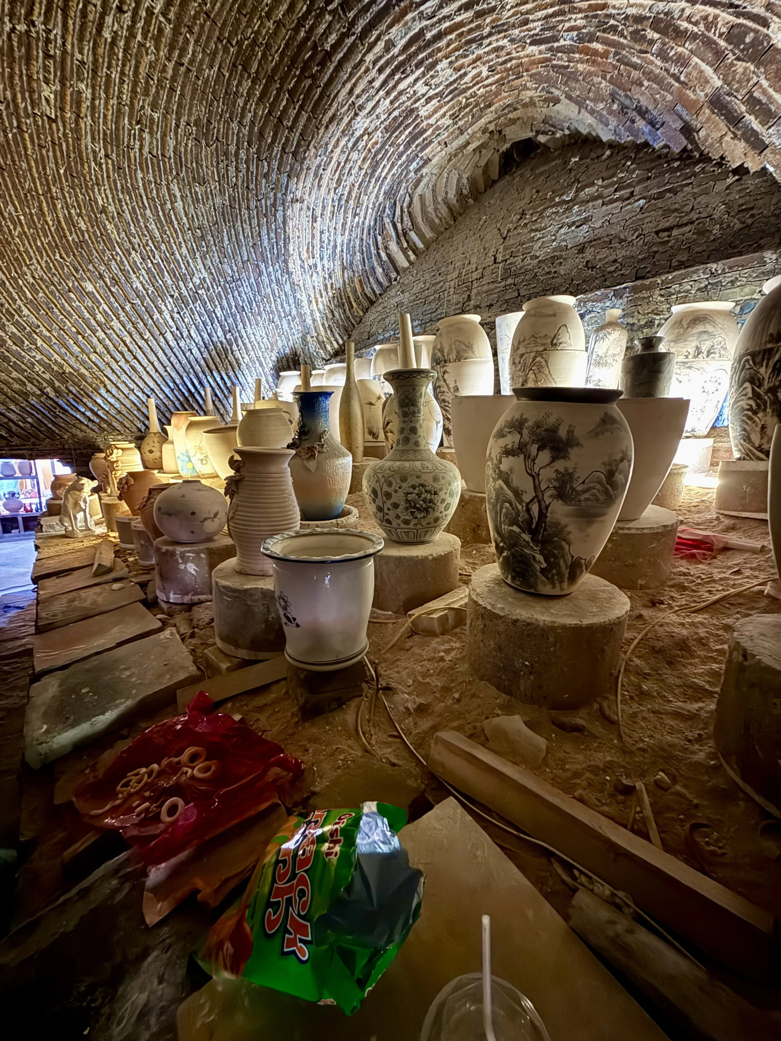 After Kyle and I each got an iced Vietnamese coffee (“Brown coffee”), we briefly toured the ceramic operation. The highlight of this studio was the 100+ year old, massive wood-fired kiln that we were able to walk inside of. At first I found this terrifying but learned the kiln was no longer used. The boys went first and when I followed I heard crunching beneath my feet and realized Len had left a trail of snacks in his wake. We had him go back in to pick them back up.