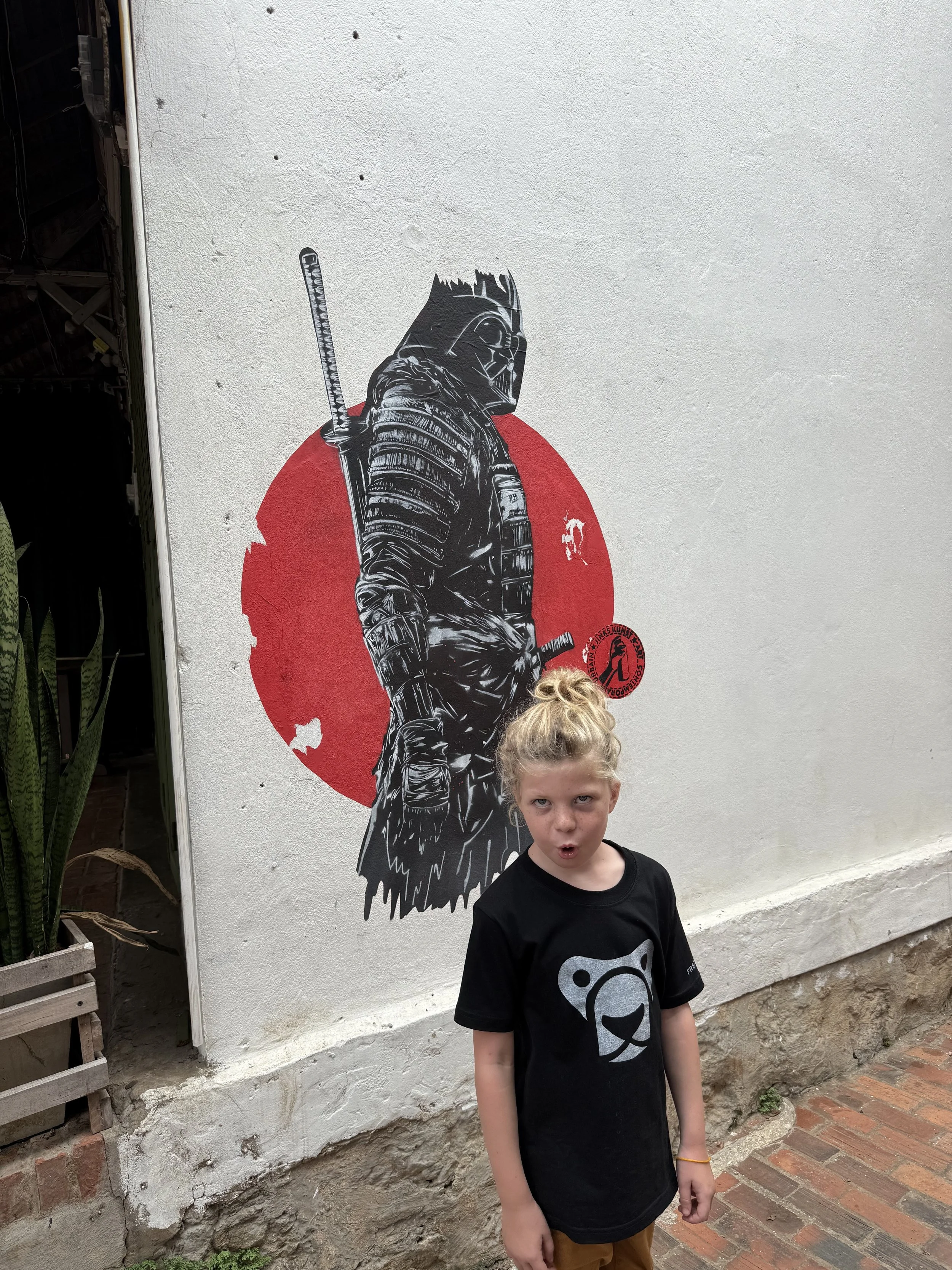 We took home school on the road this morning. Loaded up a backpack with all the school supplies we needed and hopped on the motorbikes to head into town to a bakery/coffee shop Kayleen found. It was Saturday, which we don’t even realize at this point, so it was crowded and we luckily got a four-person table inside. To start we ordered drinks and snacks before we played a few games of Uno but then it was down to home school business. As far as our mobile school attempts have gone this was one of the most successful ones. Lenny practiced tracing letters and doing his words while Ollie drew pictures and made up a story before doing math.