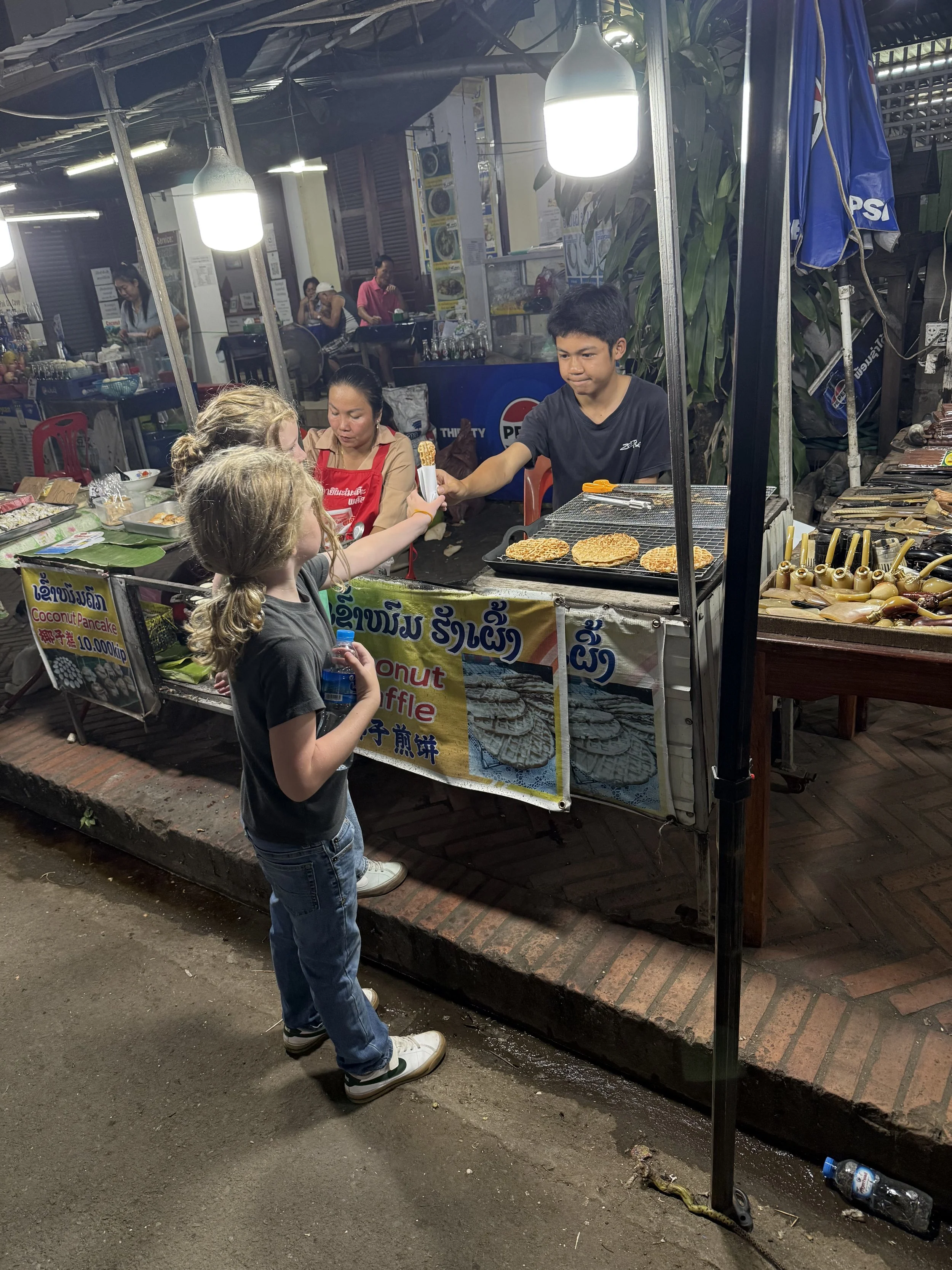 Once we found Kayleen Ollie went up to a vendor and ordered a coconut waffle to snack on as we walked. After being in SE for so long these markets are largely the same. An endless line of vendors all selling slighting different version of the same things; clothes, art, toys, jewelry. We bought two small stuffed Christmas ornaments, at least that is what we will use them as. A small monk and woman in a traditional dress.