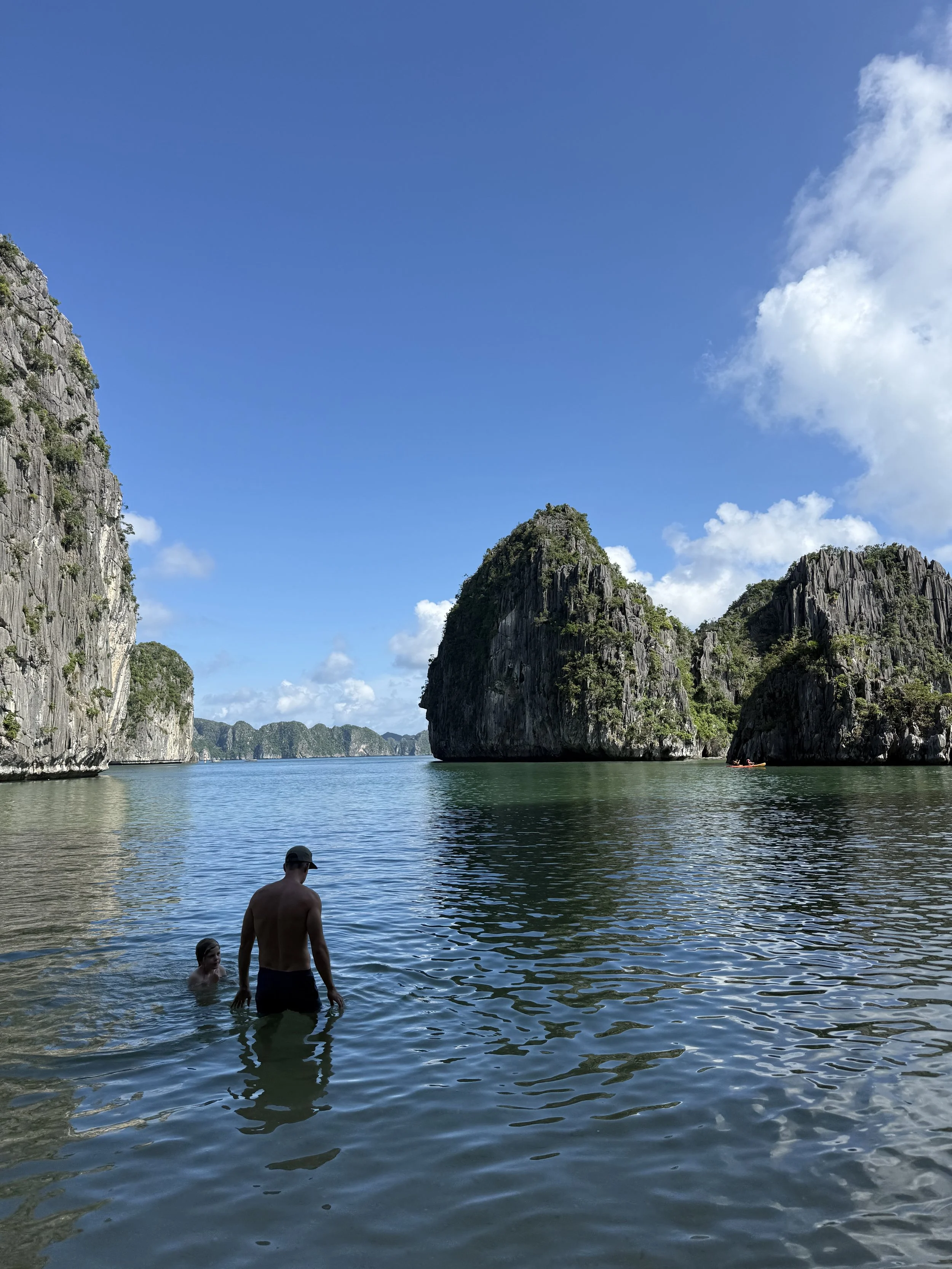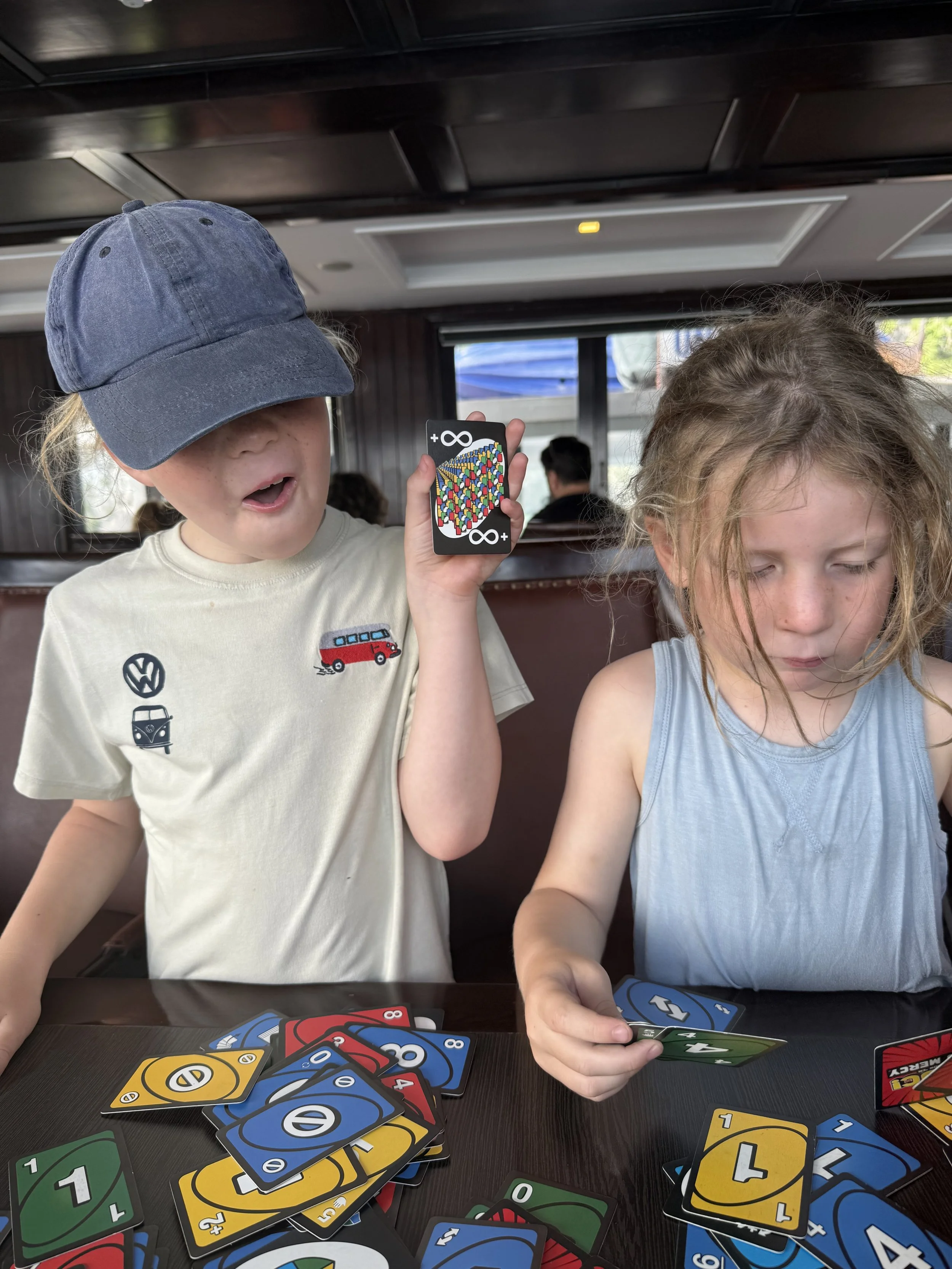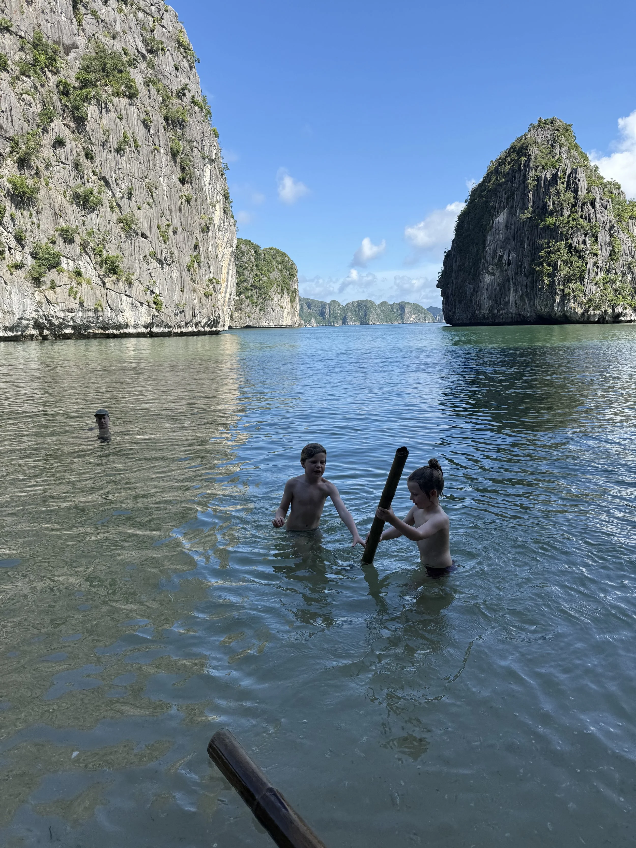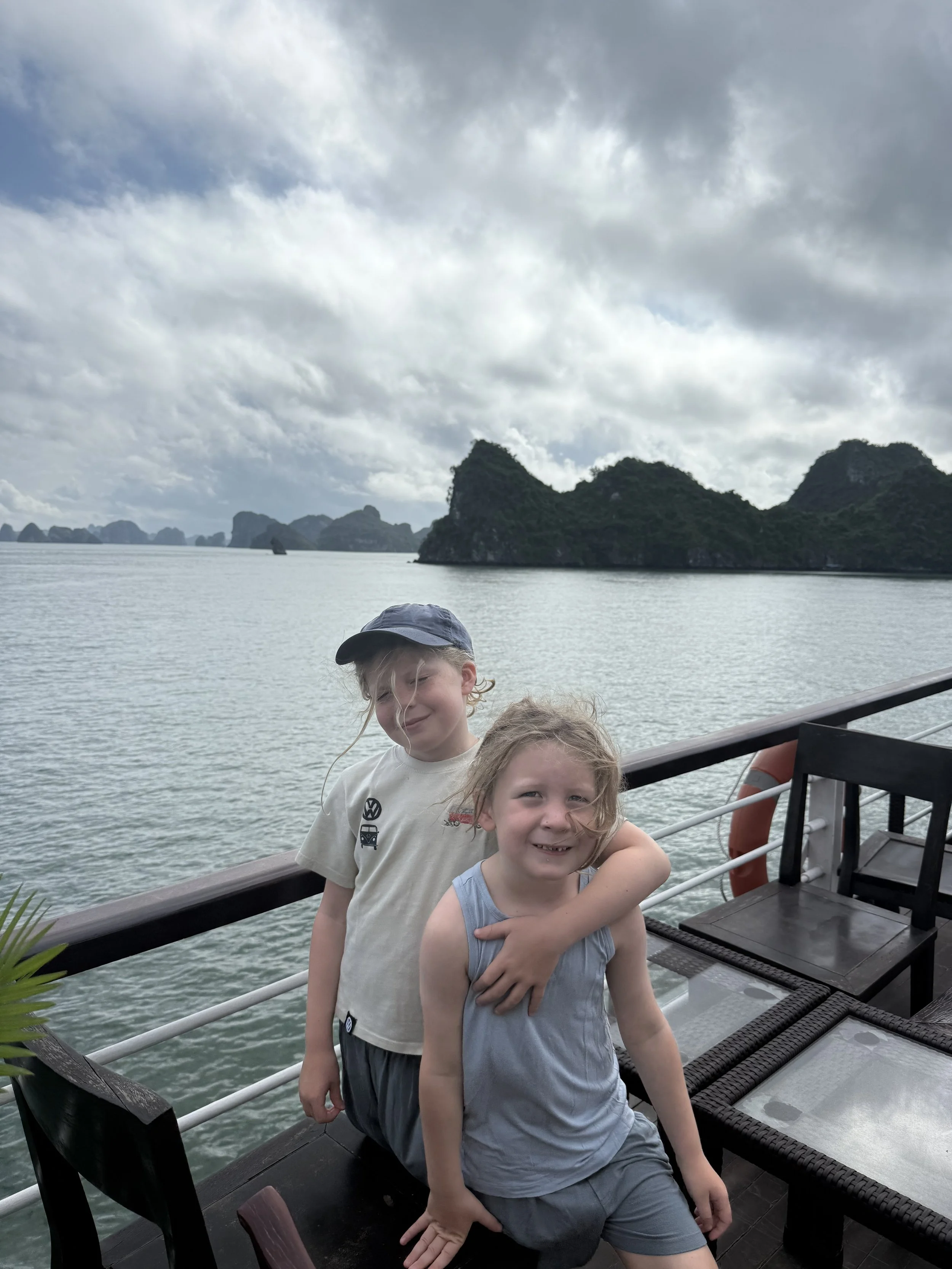 Back on the day boat, while Len was grabbing a Jenga box from the game table, he was invited to play a building game with another little boy. Eventually our family joined theirs and we had a lovely afternoon together. We learned that they were from Tasmania (our second Tasmanian family in Ha Long Bay!) and that their kids were on an extended school holiday. They had two kids- Tom, 6 and Ellie, 9. Ollie and Tom soon broke off from our group to go play chess by themselves. Len tried to insert himself into their game but we kept luring him back to the bigger group to let the boys play chess in peace. Our bigger group attempted to play Uno No Mercy but since the instructions were in Vietnamese and our phones had no service so we couldn’t translate any text, we made up the rules the best we could. We never actually finished the game, though, and some of us ended up with more than 30 cards each.