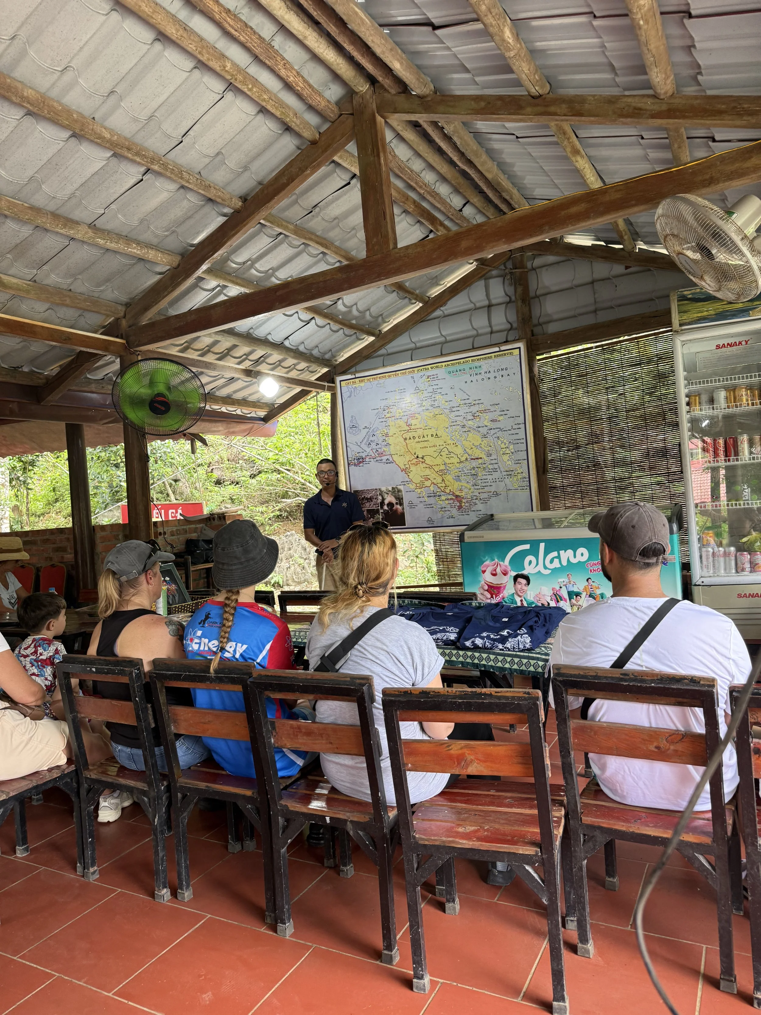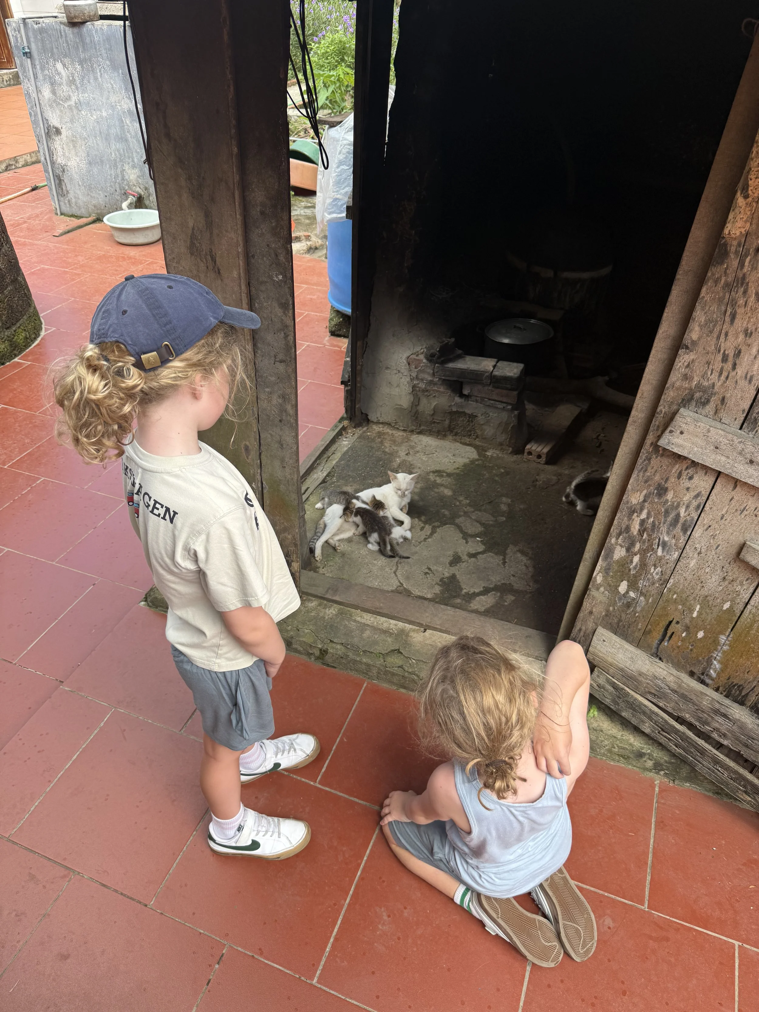 He also shared that most villagers no longer eat dog but some still believe that eating dog will improve their luck so it does still happen. We were offered to try snake or gecko wine and to also take a barefoot walk in the stream where the fish would give us a “pedicure” but we all declined these offers. We then made our way through the village to see traditional mud houses where one had a cat with a bunch of kittens inside. We also met a white fluffy dog and were told his name was “Lunch”.
