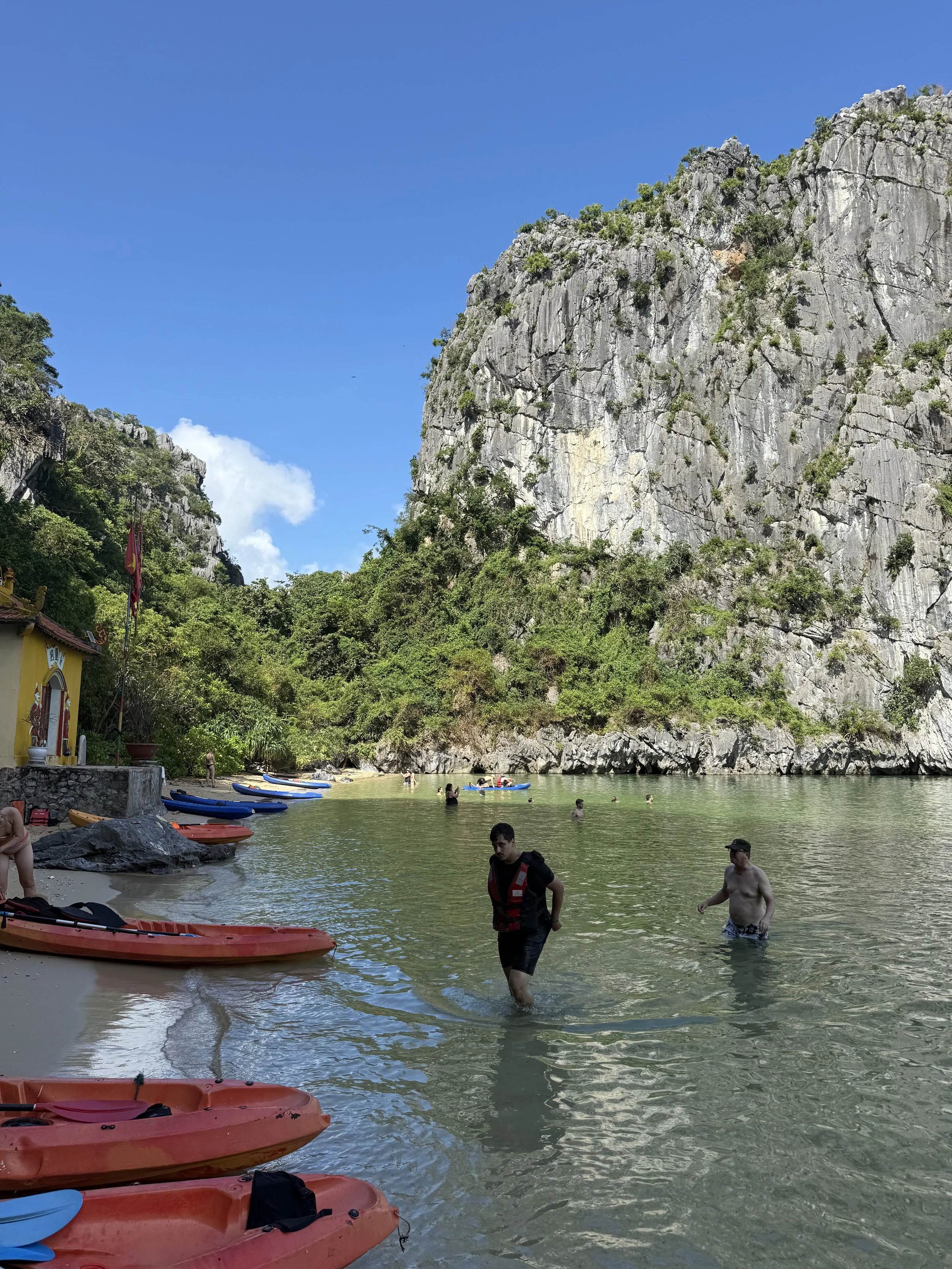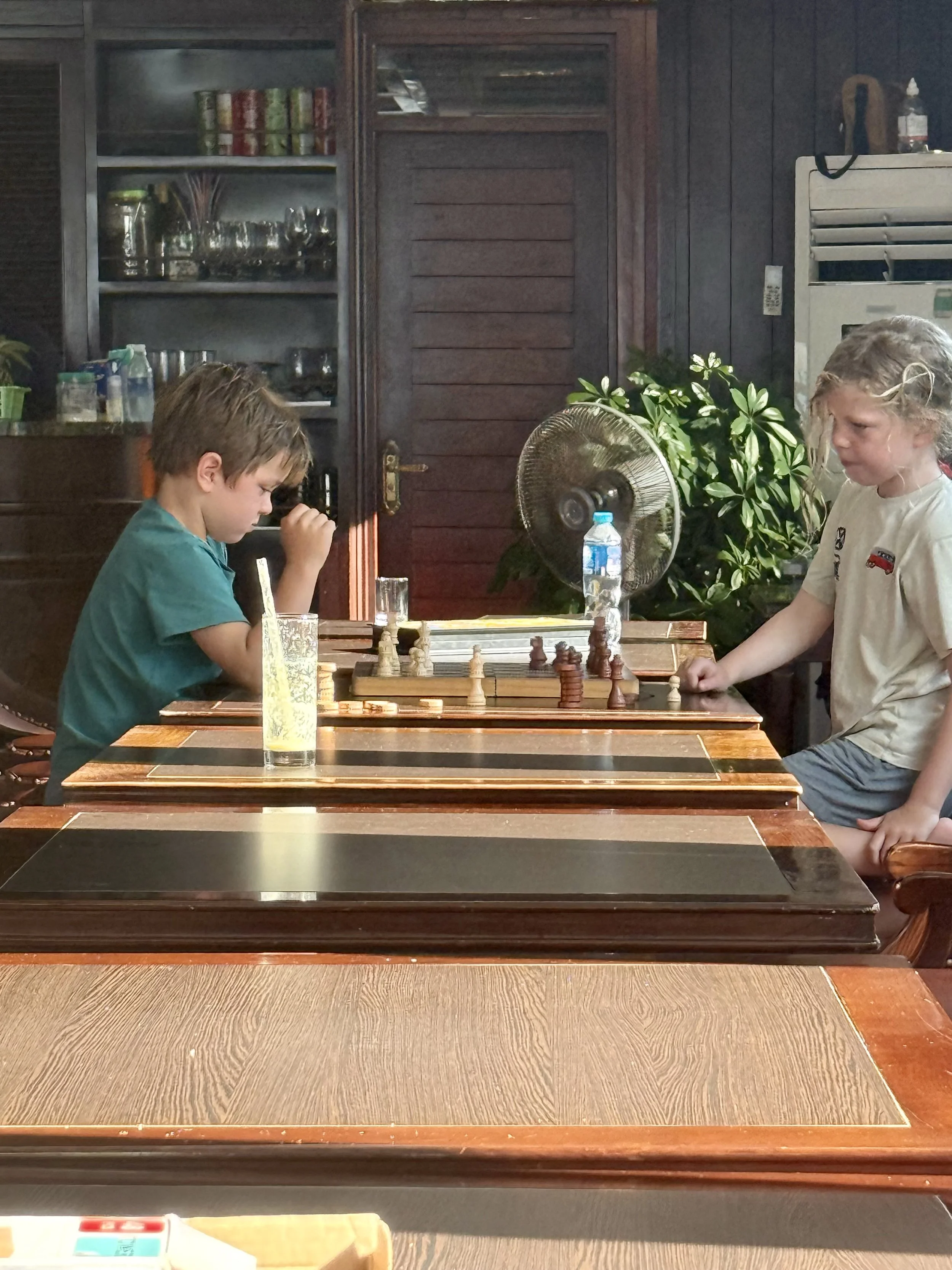 We learned that we’d have a few hours on the day boat in the morning before we would get on a smaller transfer boat to take us to Cát Bà Island, our planned excursion for the day. Thankfully the boat had a ton of board games to keep us all occupied and air conditioning in the dining cabin. We started with Uno but soon split into groups with Ollie playing chess with Kyle and me and Len playing a Vietnamese board game where I fully made up the rules. The made up rules were to simply roll the dice and move your horses around the board and Len absolutely loved this.