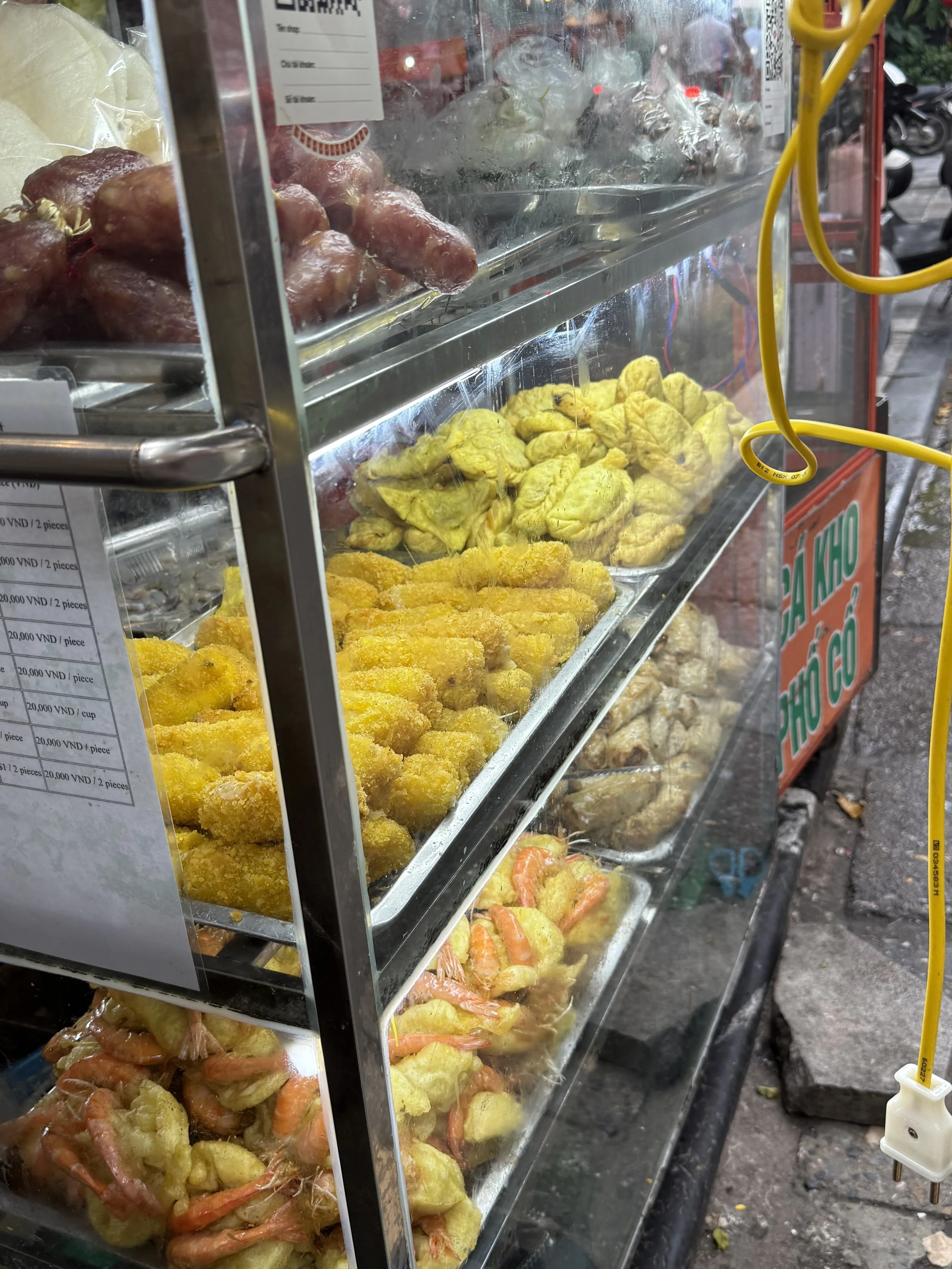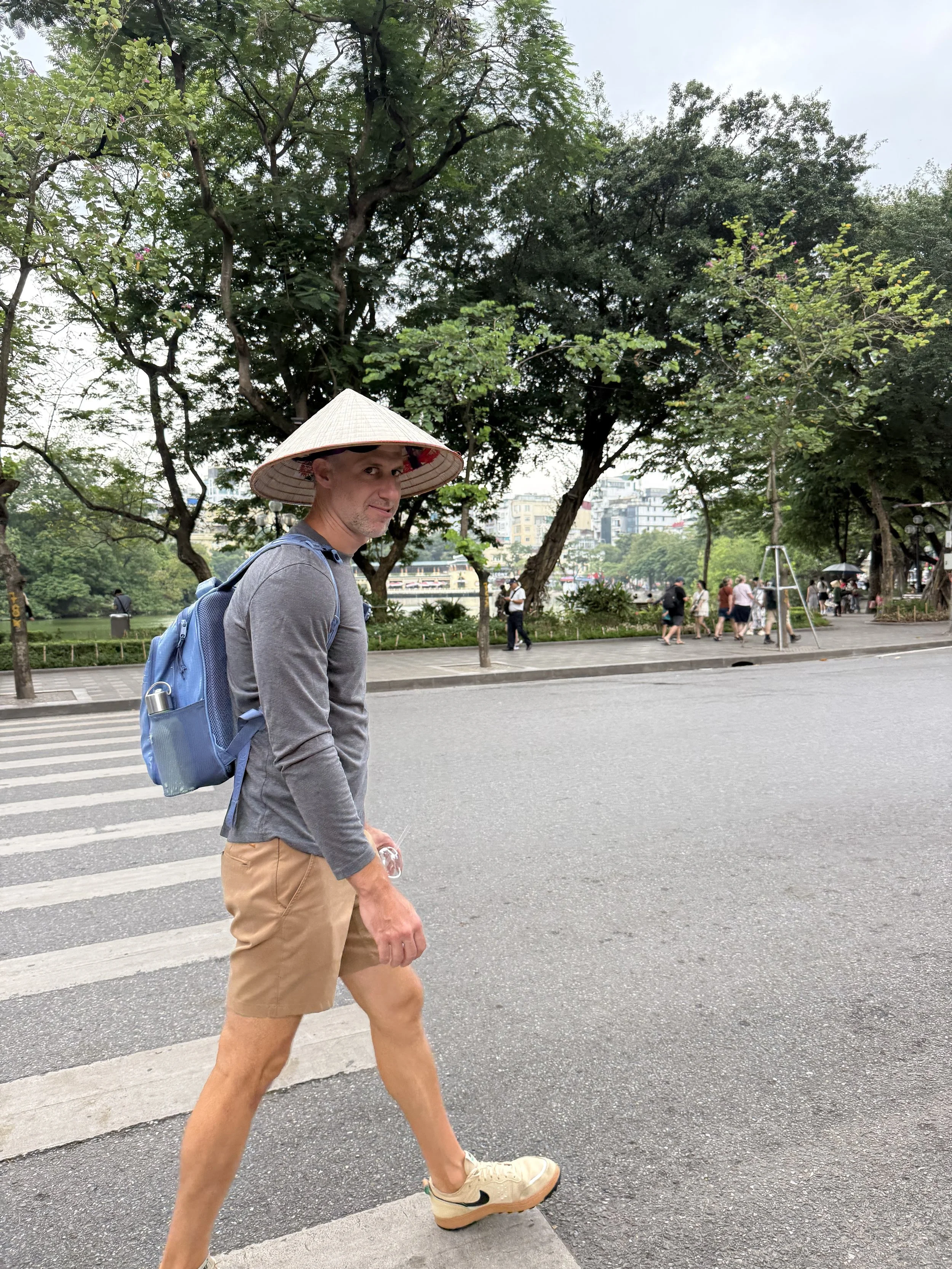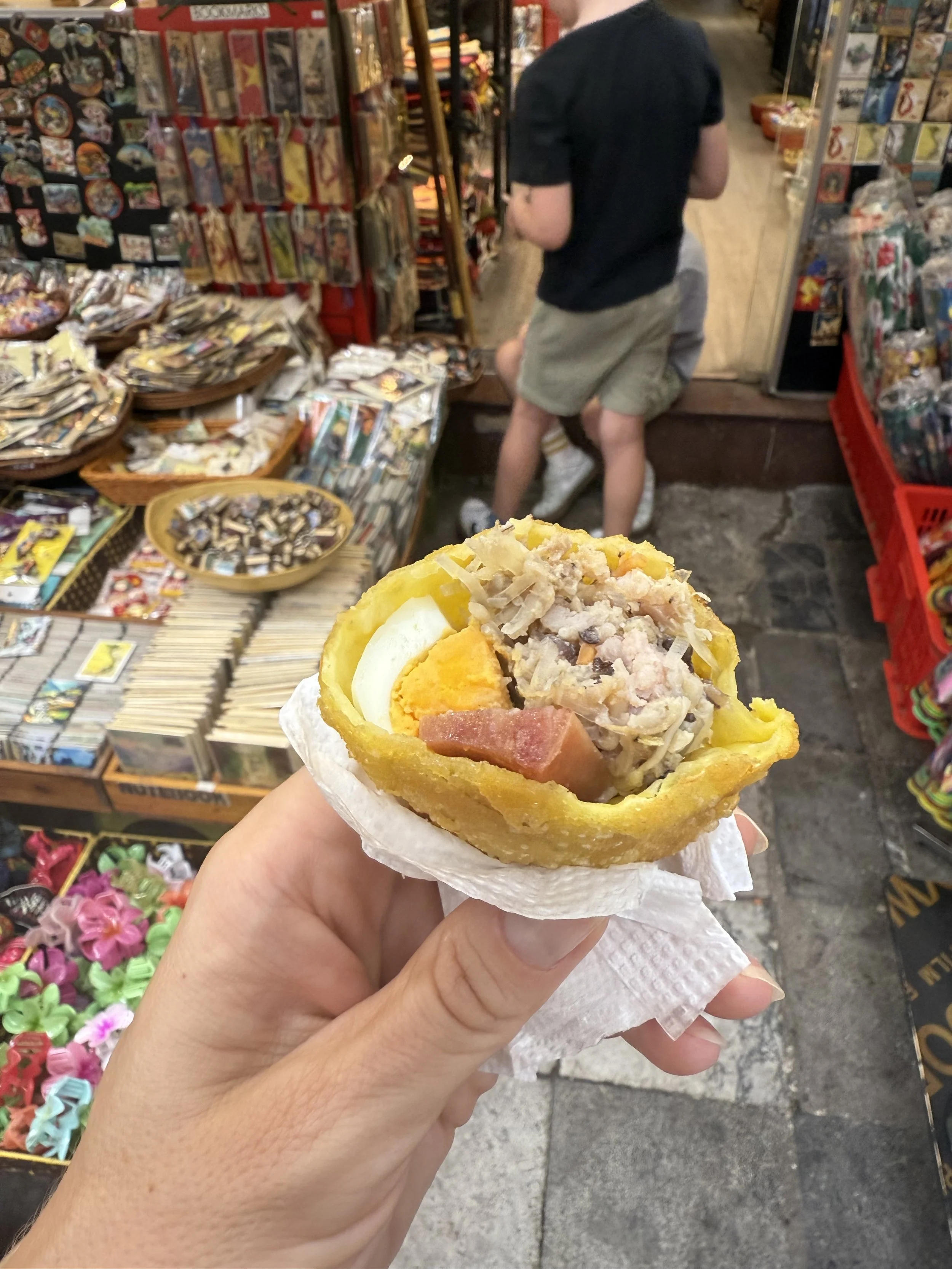 Despite the typhoon warnings, we were relieved to see that it was only drizzling outside when we woke up. We took a Grab to the Old Quarter to meet our food tour guide but before going to the meetup spot, we perused some of the knockoff clothing street vendors. I picked up a pair of knock off Lululemon shorts from a street vendor– $8 USD! I paid the opening offer but imagine I could have negotiated if I was up for it. We met our guide for the day, Ciara, and we were off. Like most people we’ve met in Vietnam so far, she was surprised to learn that the kids were boys and that they were not twins. She brought ponchos and traditional Vietnamese hats (Nón Lá) for us to wear to stay dry in the rain.