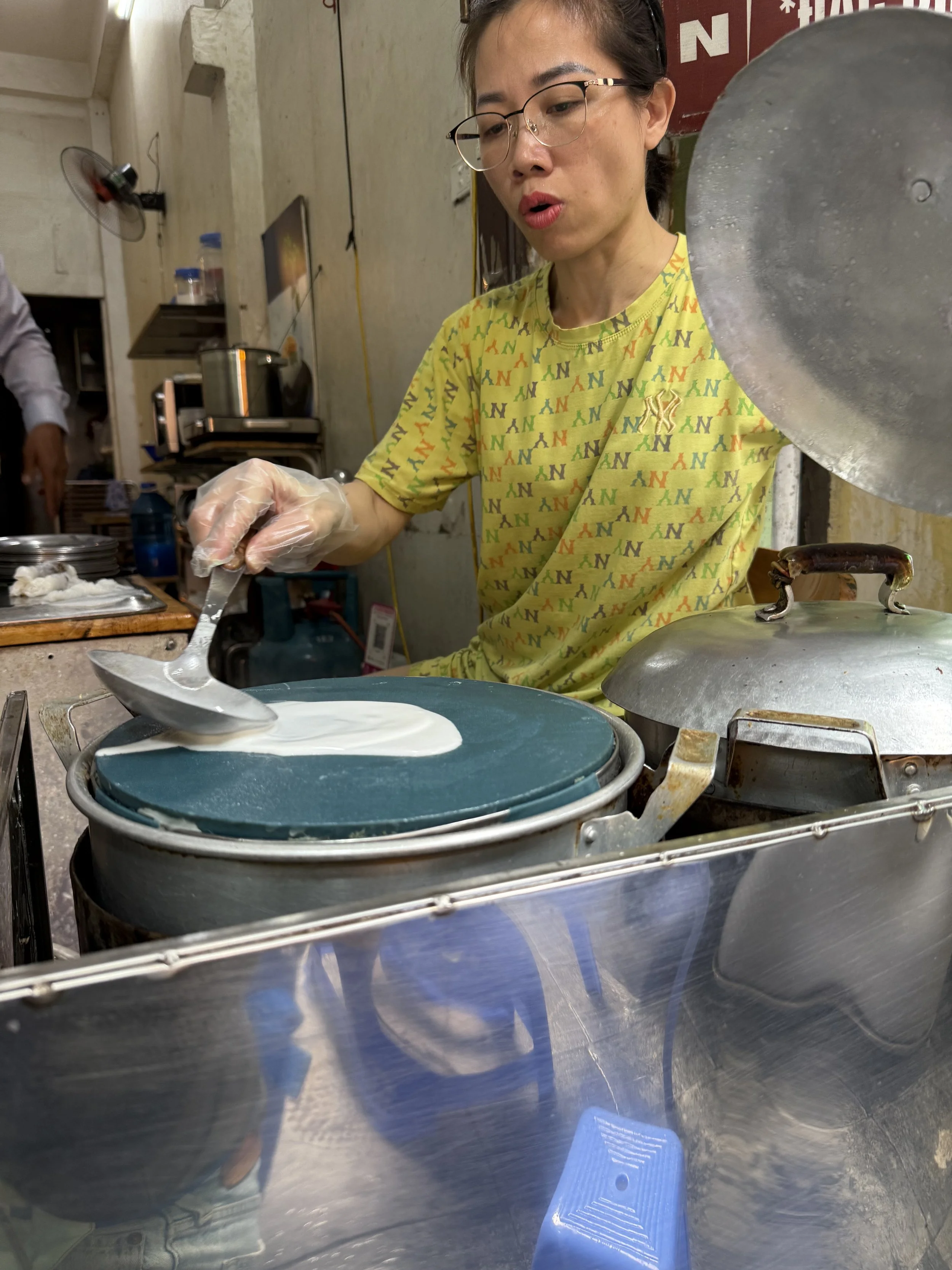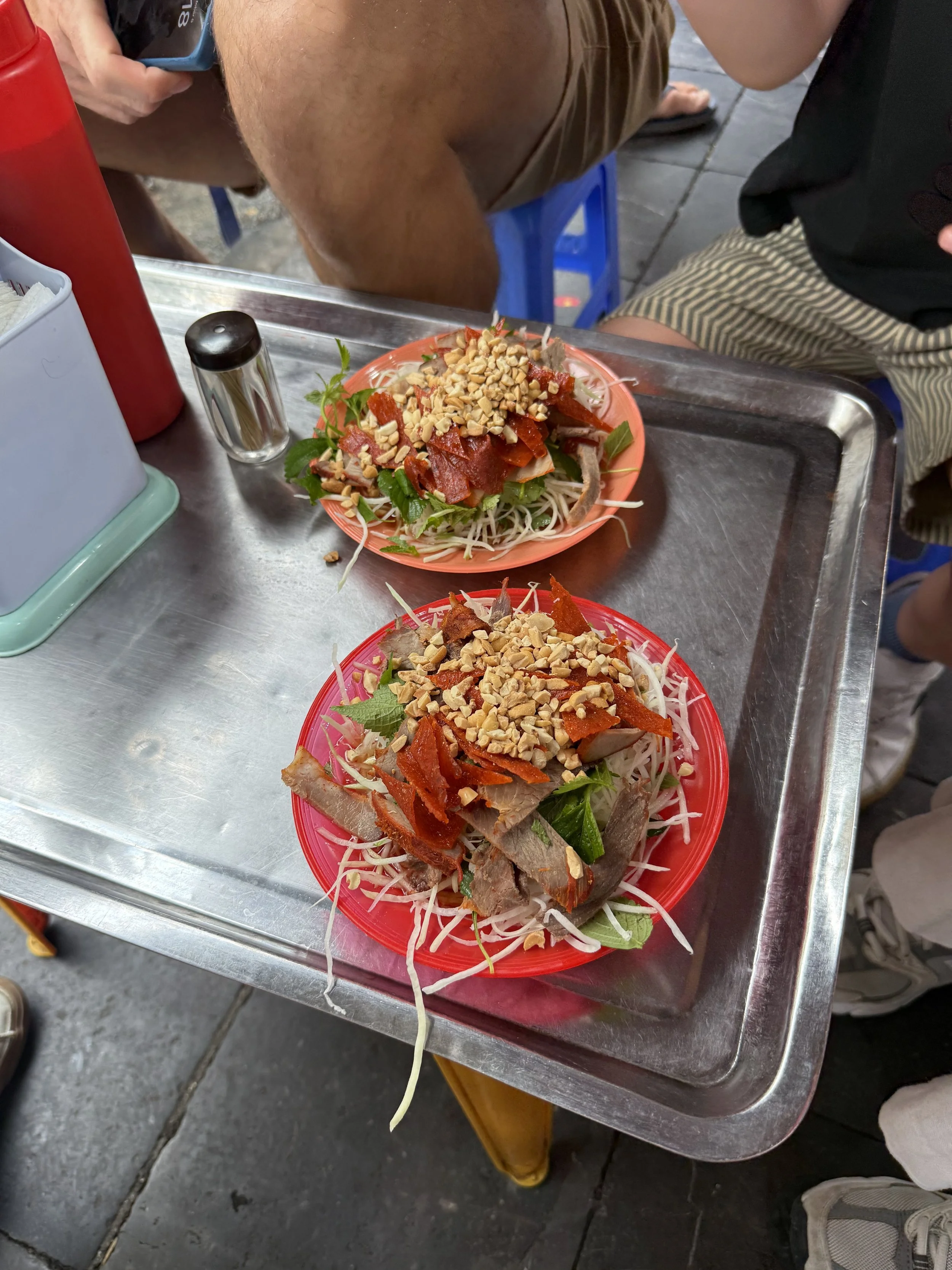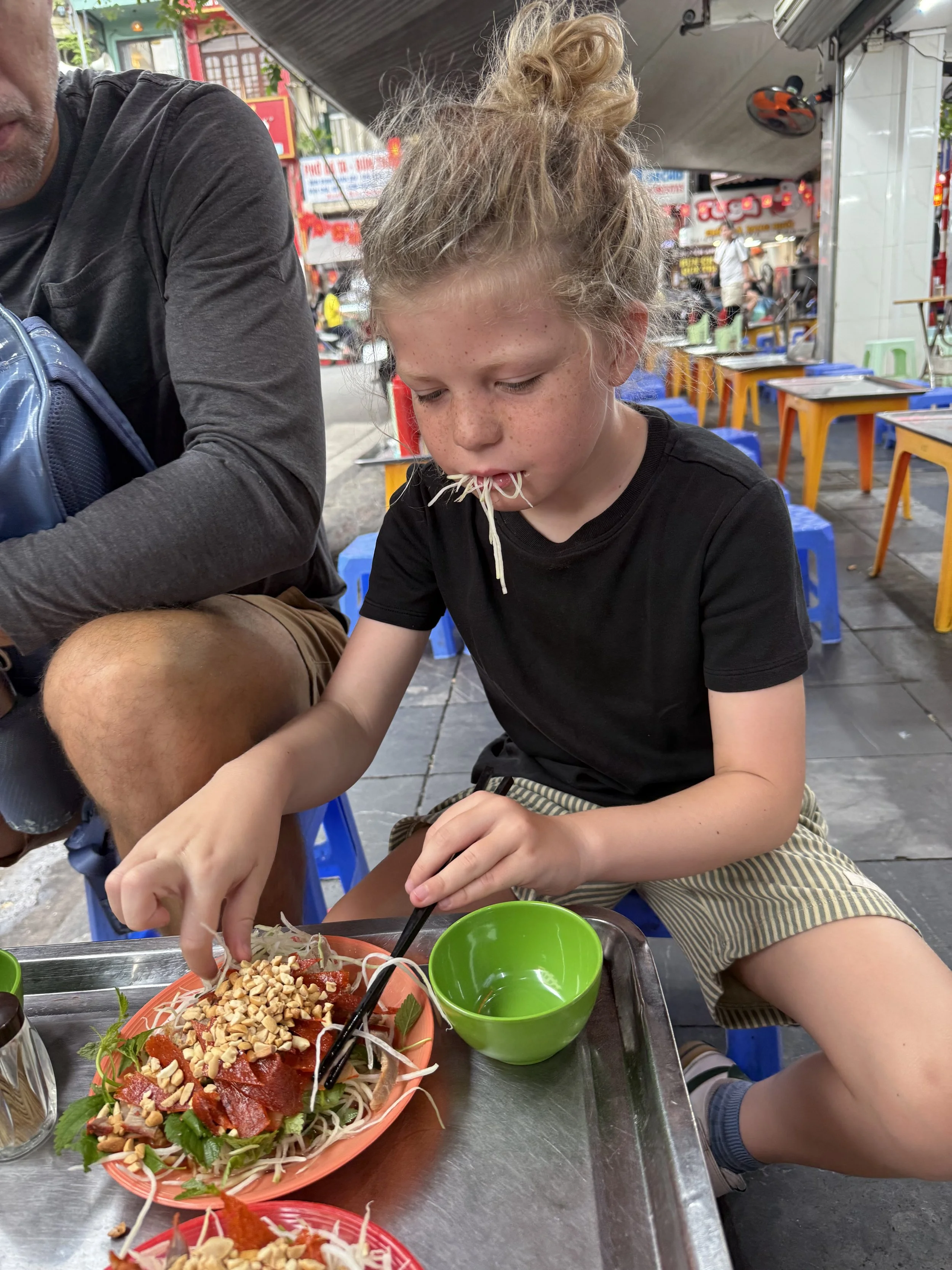 The first stop was for Nom thit bo kho, salad with green papaya, dried beef, herbs and peanuts with a light fish sauce. Ollie was quick to dive into the papaya before the dressing was mixed in but more hesitant once blended. Ciara was clever to anoint Len as the “chopstick hander outer” at all of the stops. While he loved having a job, this enthusiasm didn’t always carry over into trying the foods. He eventually tried the cured meat and compared it to pepperoni back home but let us know that he no longer cared for pepperoni. This was a favorite dish of mine though.