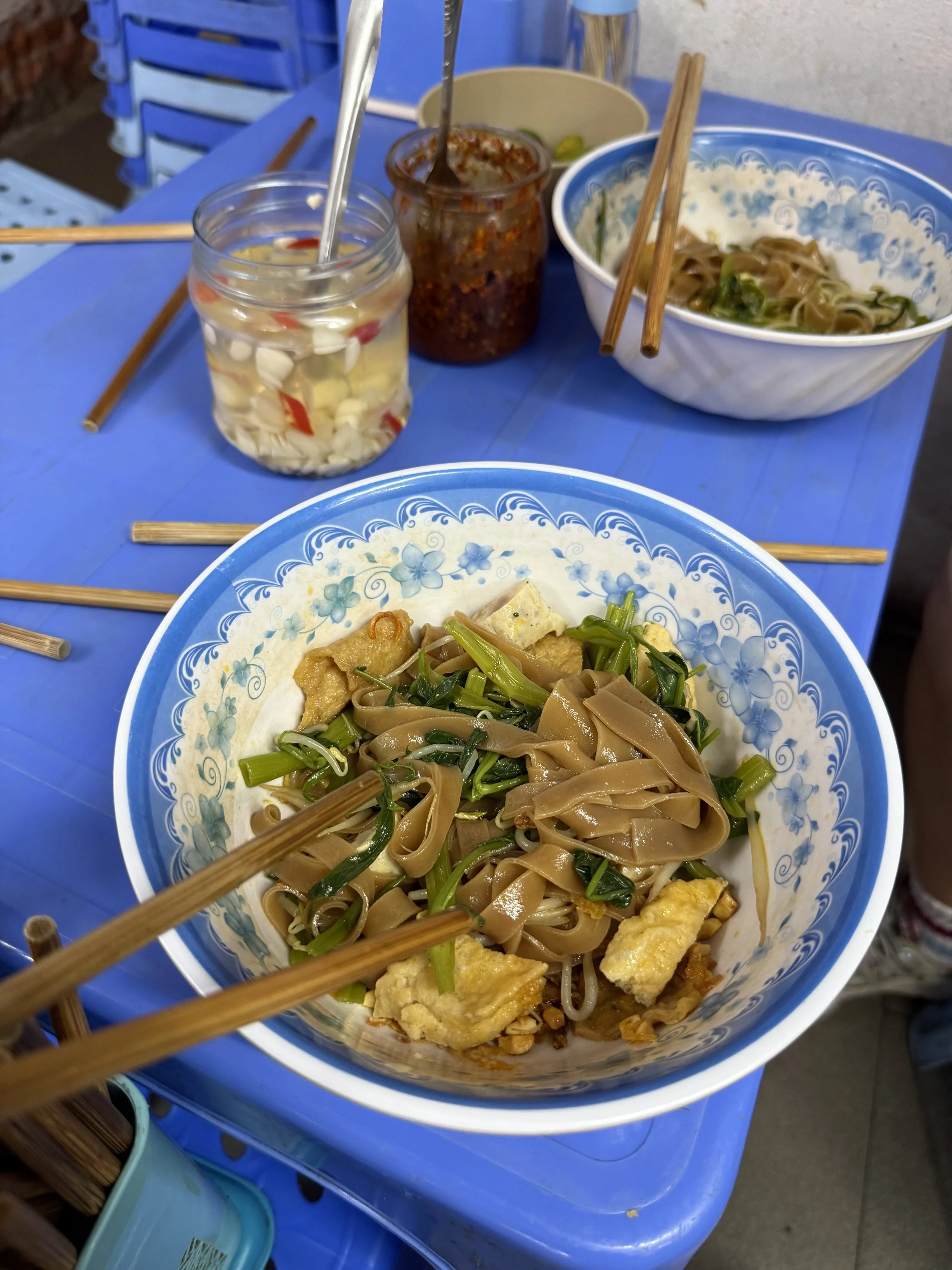 Next we stopped for Vietnamese street noodles. Ciara let us know that she preferred hers without broth so thats how we took ours. The rice noodles were served with fried tofu, fish skin, sausage, fried shallot and greens. For us, though, the star of the show were the condiments on the tables– picked garlic, chili paste and kumquats. We loved how bright the kumquats tasted and Kyle was quick to diligently collect the seeds to take home and attempt to sprout. The kids both had to use the bathroom so Ciara took them both down the street to a hotel and Kyle and I got to eat noodles in peace for a few blissful minutes.