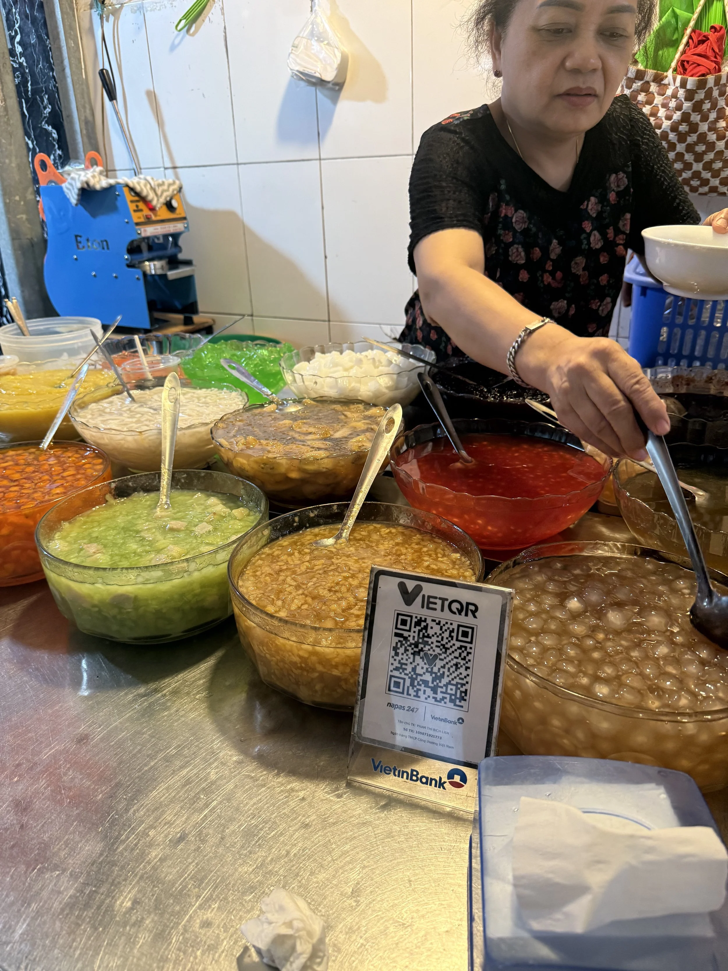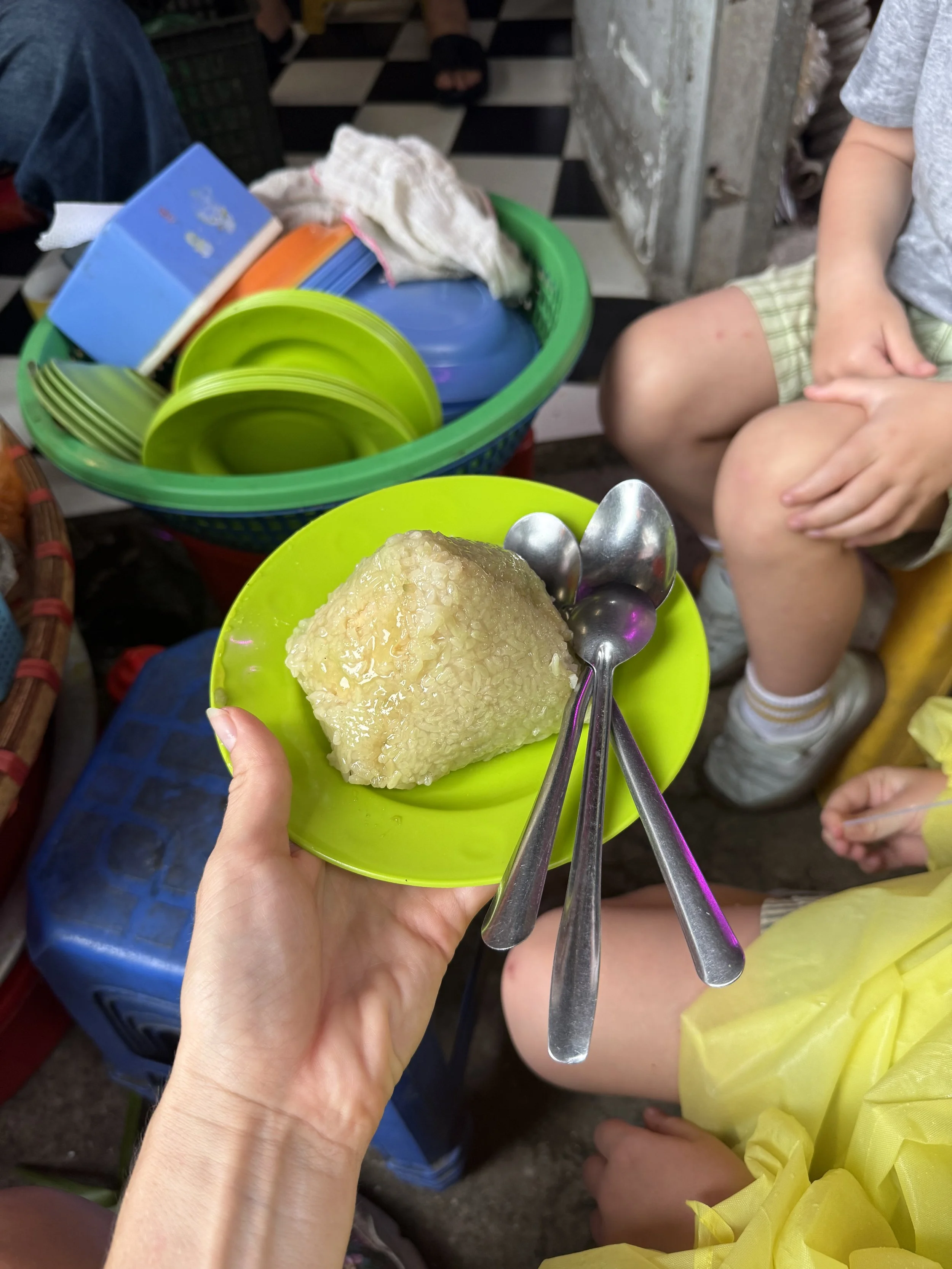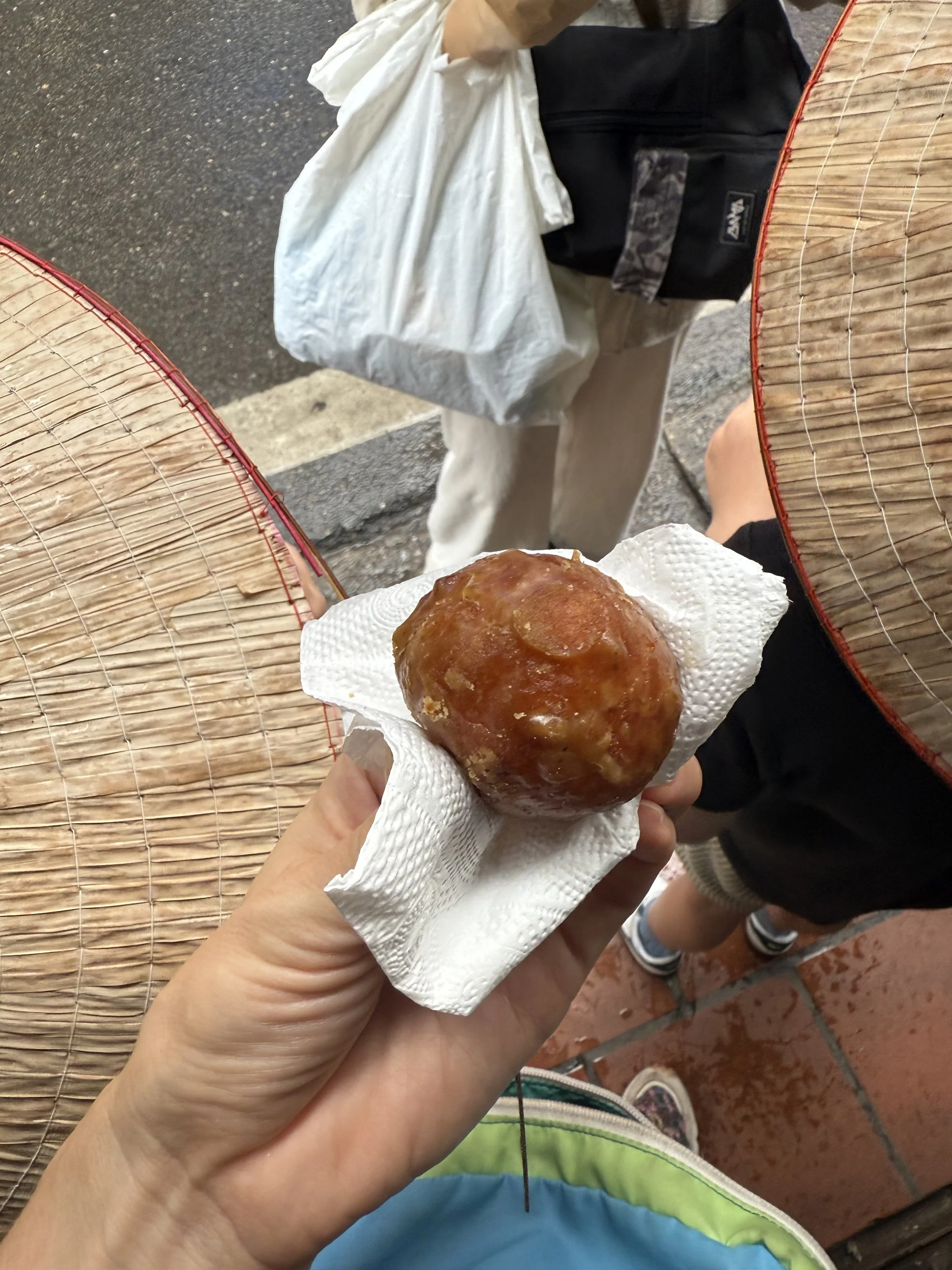 We also had sticky rice cake (Bahn chung) roadside and a dessert soup with jelly, tapioca and coconut (Che) in an alleyway. The Che vendor was especially taken with the boys and repeatedly told us (with Ciara translating) how beautiful she thought the boys were. She wanted to give them a special decoration to take home but we thanked her immensely but let her know we wouldn’t have space in our luggage.