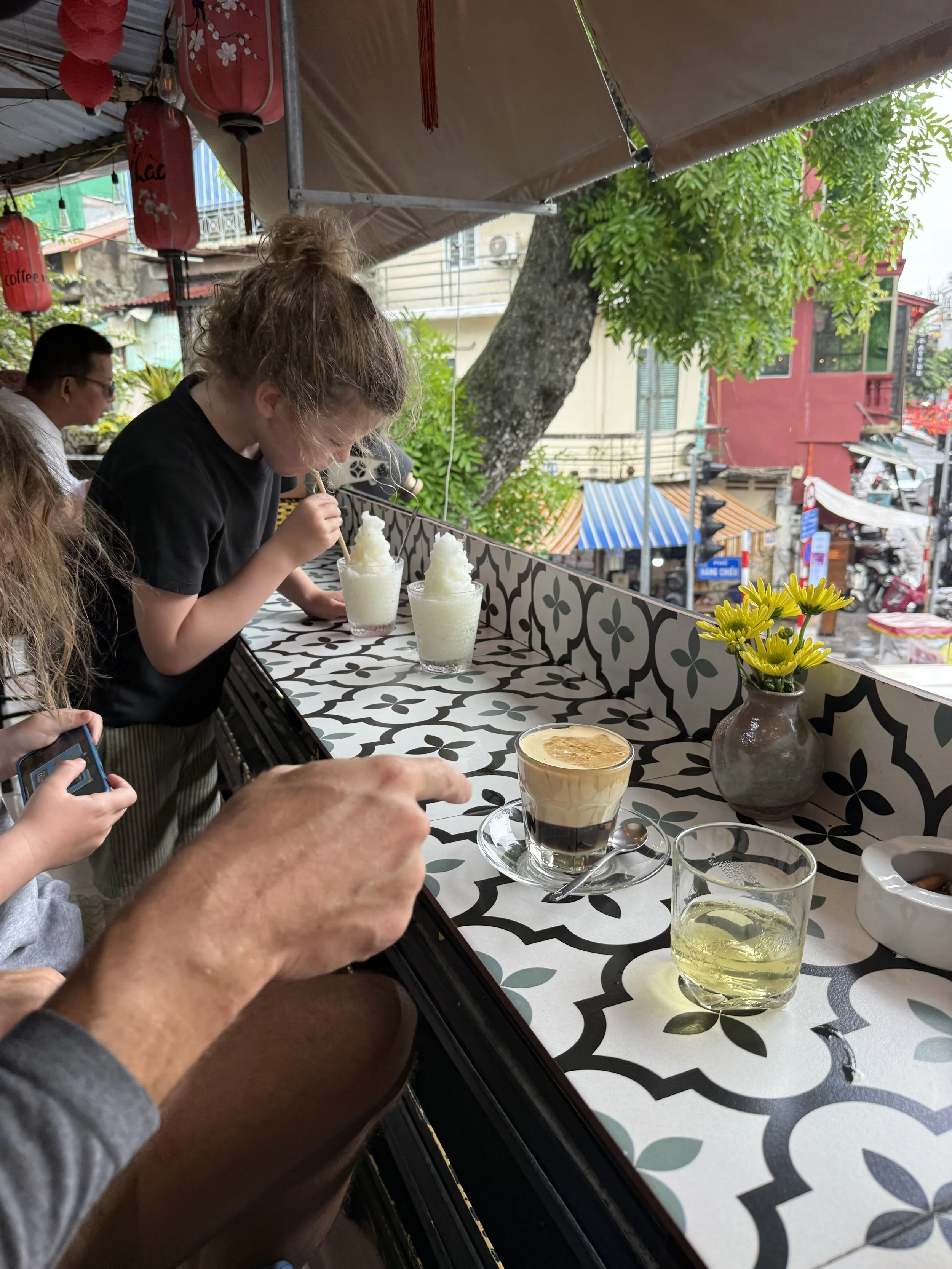 The tour ended at a second level coffee shop that we accessed through another hidden alleyway. Kyle tried the egg coffee, I had a pineapple juice and the boys snow lemonade. There was then a comedy of errors where the boys managed to spill 3 different glasses of their lemonade. The kids were good sports during the food tour but we had all hit our limit at this point.
