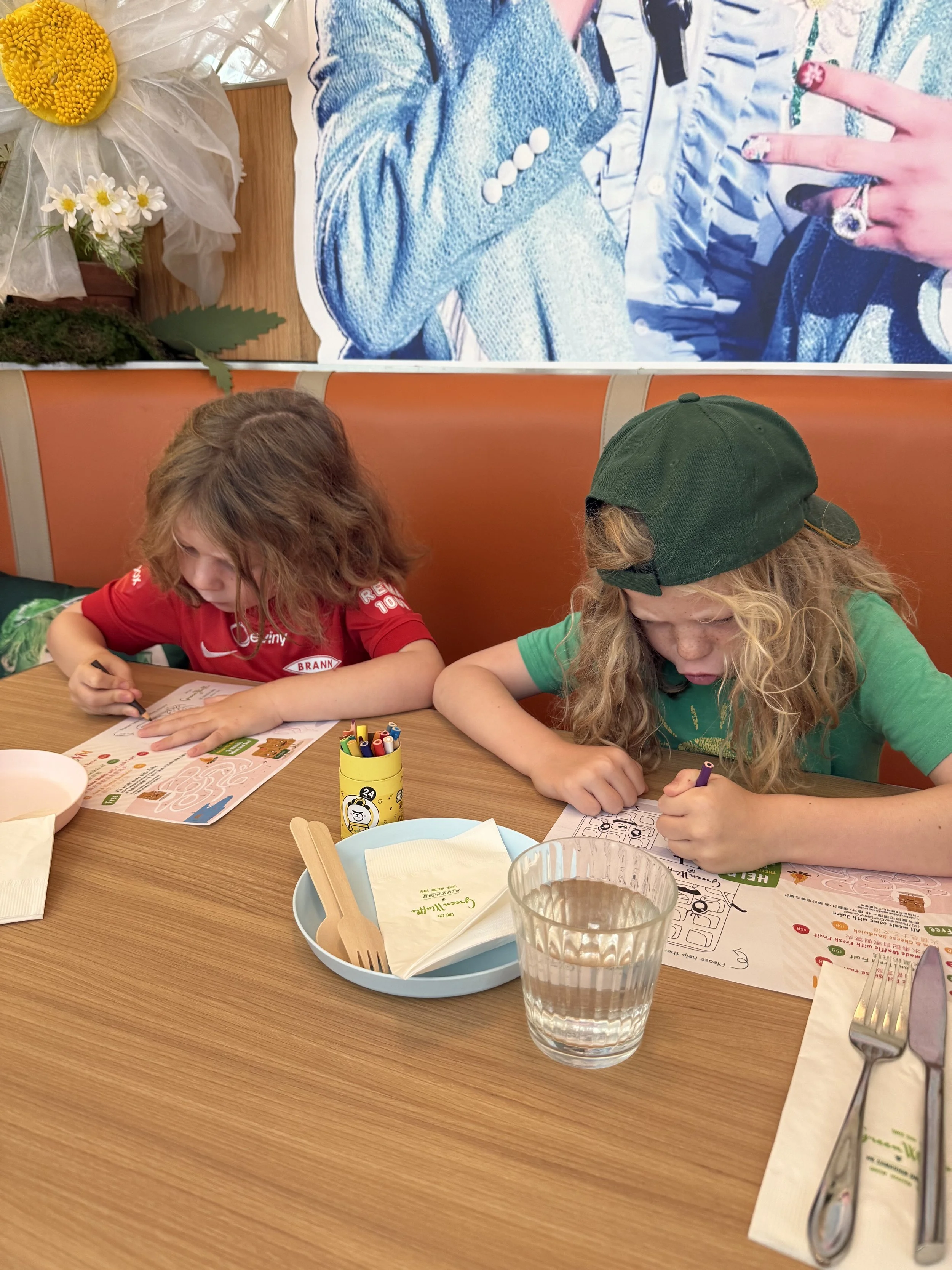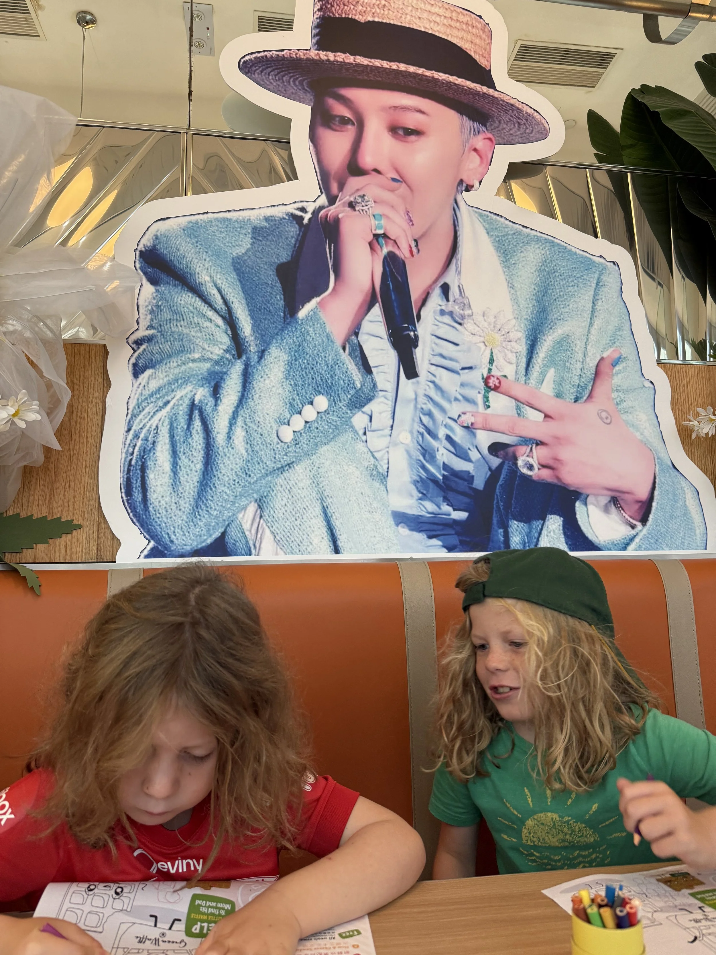 We are settling into a nice daily routine in Hong Kong. It all starts with a morning breakfast adventure which today led us to a diner that was described as a Canadian owned Hong Kong diner. We really just wanted a western breakfast and that was what we found. Upon arriving we noticed a very strong K-Pop theme and after texting our friend Gabby, she confirmed it was the same person everywhere, G-Dragon. The kids colored while we waited for our food. At one point I went in search of the bathroom and was given a key, told to go outside to the building next door , take the elevator to the 6th floor, and use the key to unlock the door. Somehow, I found it…