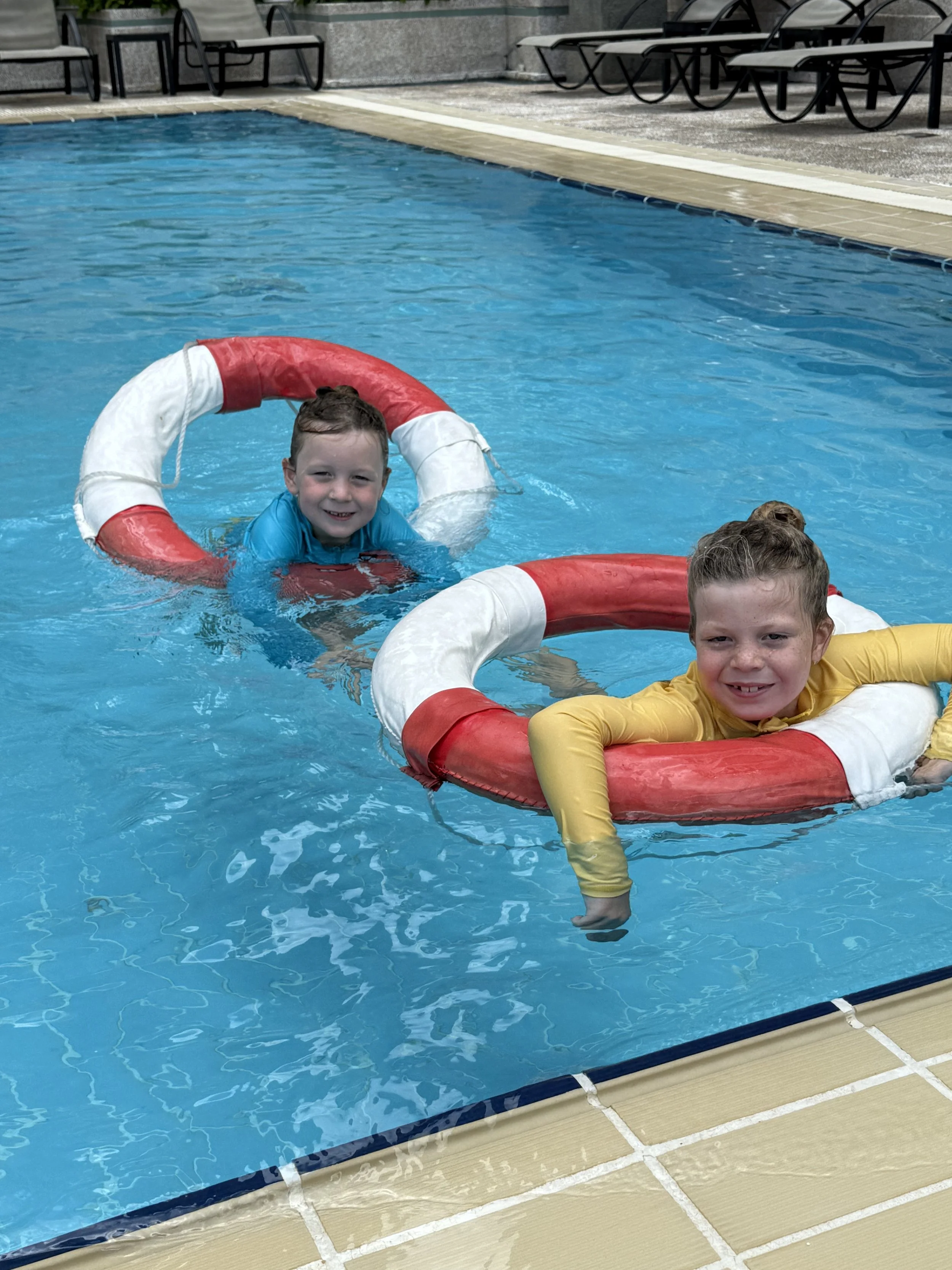 We all met up outside my gym. I told Kayleen how my suspension of the owner being a guy named Jimmy who was a trainer at the fancy gym I went to when I lived here 15 years ago were true! We all walked down the mountain to Kayleen’s yoga class. Then I headed back up the escalator with the boys, planning to go to the pool and cool off since they were roasting after being outside for the last hour. The pool yielded more games with them jumping into lifeguard rings and then back to the game where I was the boss who flashed red when below 20% health. Once Kayleen returned, we all headed up to our rooms to shower and get changed.