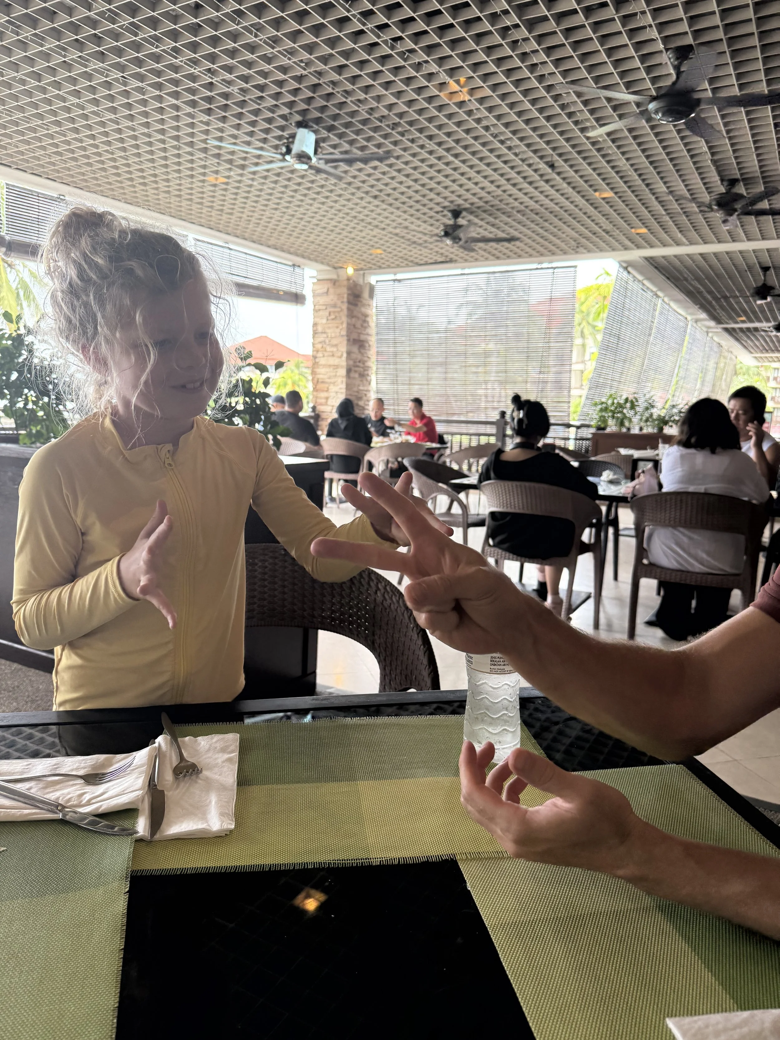 We headed to lunch at a different restaurant in the resort complex. The menu is similar and they all seem to have the staple dish of chicken and beef satay. The chicken satay is very good with a spicy peanut dipping sauce and I’m sure will be a repeat order during our time here. While we waited for our food we played speed rock, paper, scissor where the winner would go around the table facing everyone until defeated. Kayleen took the boys to the kid’s club to make it in time for a painting session while I paid. To our surprise/disappointment Kayleen learned the kid’s club isn’t drop off! She was quickly informed of this as you attempted to leave…a real bummer.