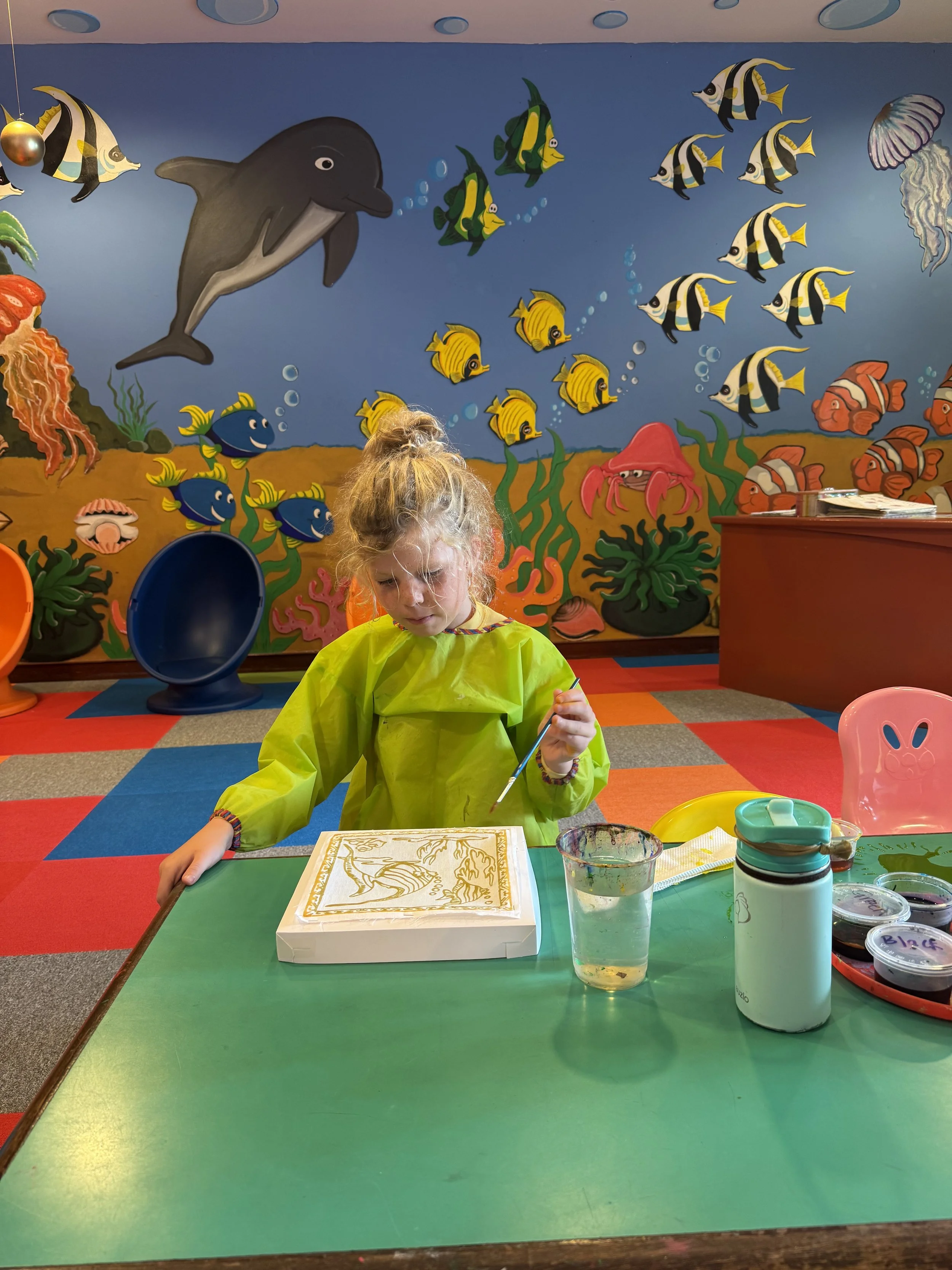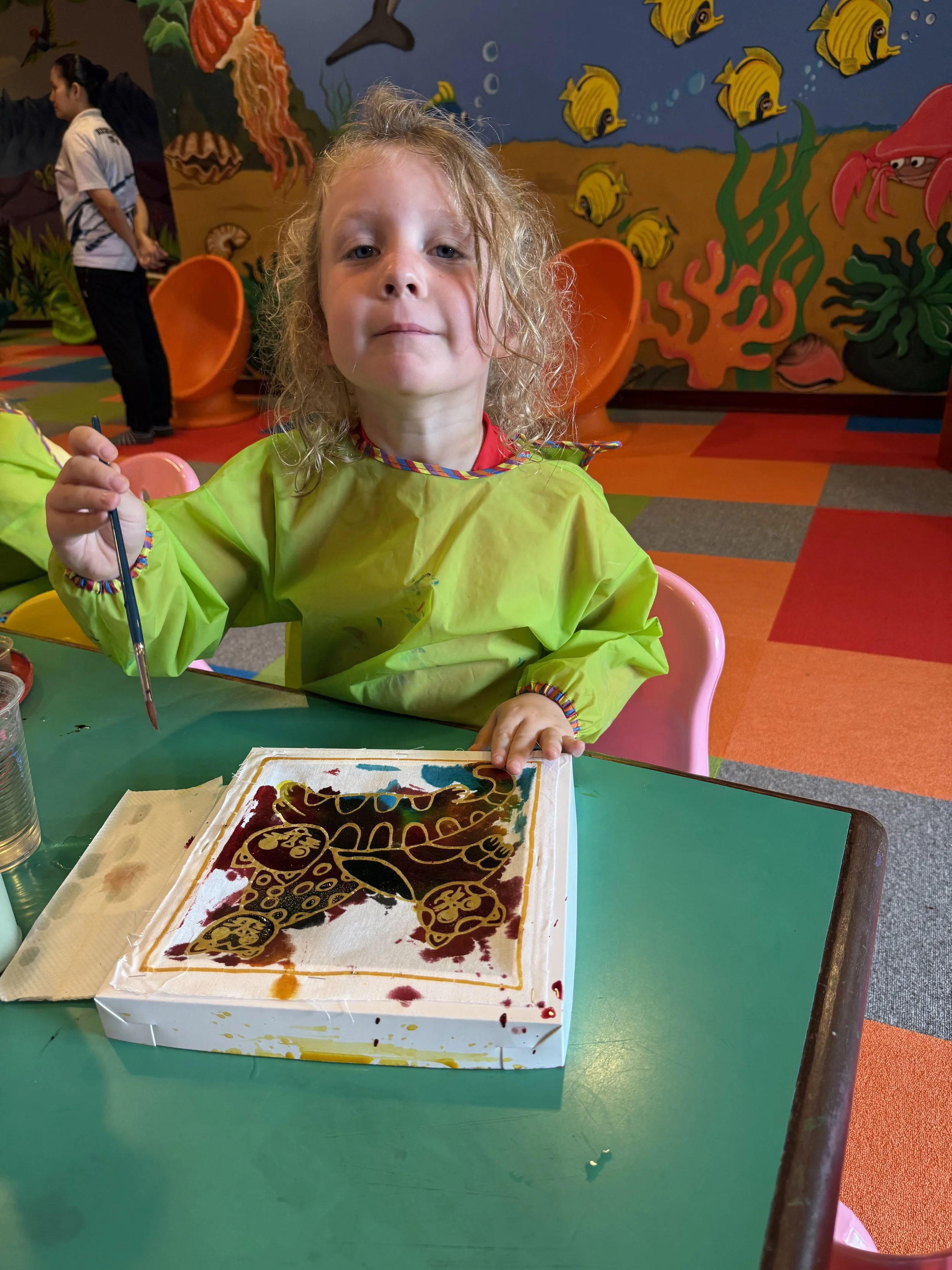 I headed over to the kid’s club to oversee their painting while Kayleen took her turn at the gym. The boys were painting away in their little smocks when I arrived but their interest only lasted about 15 minutes. They played around with a few of the other little toys before we decided to head to the pool since there was a break in the rain.