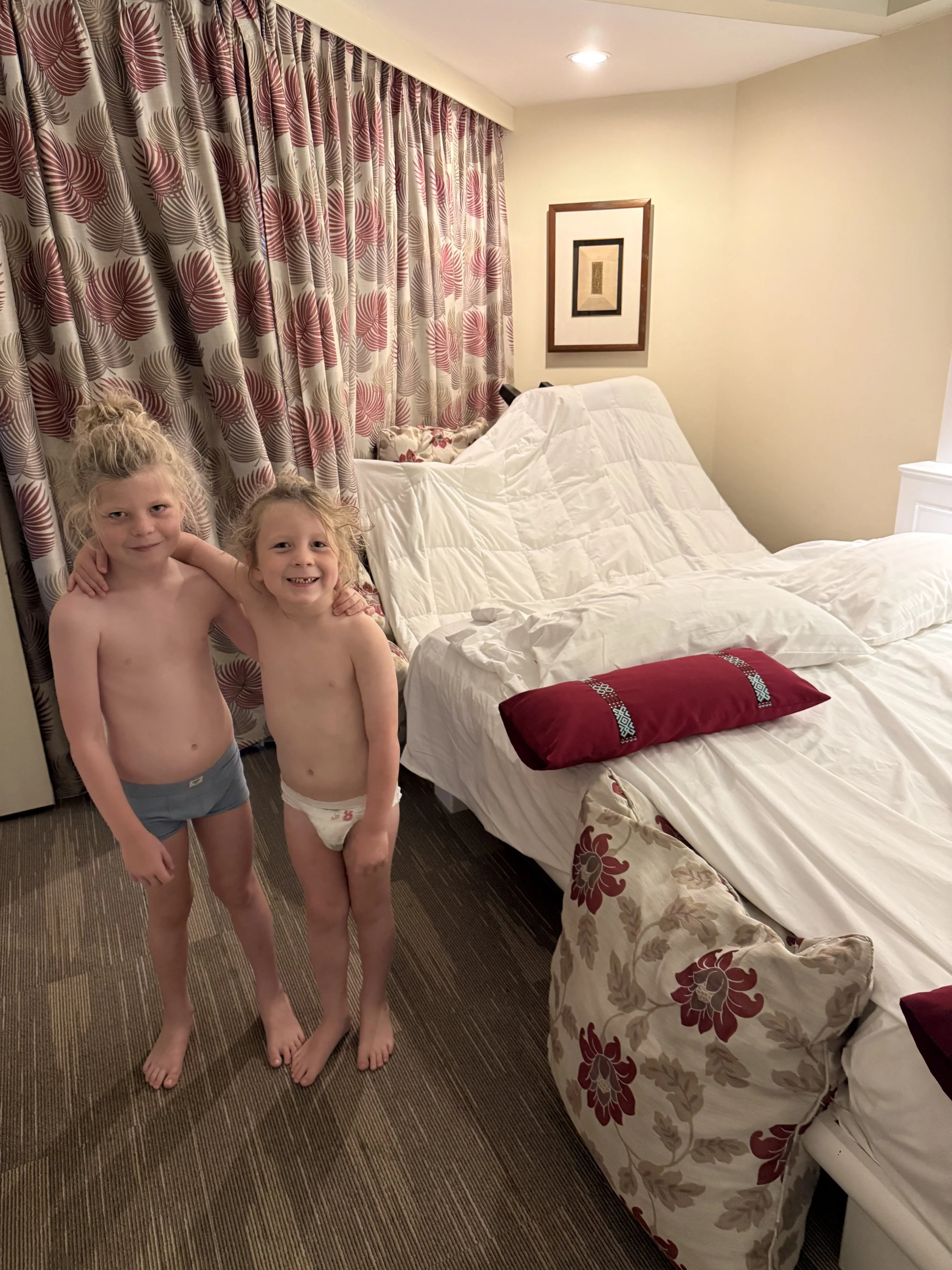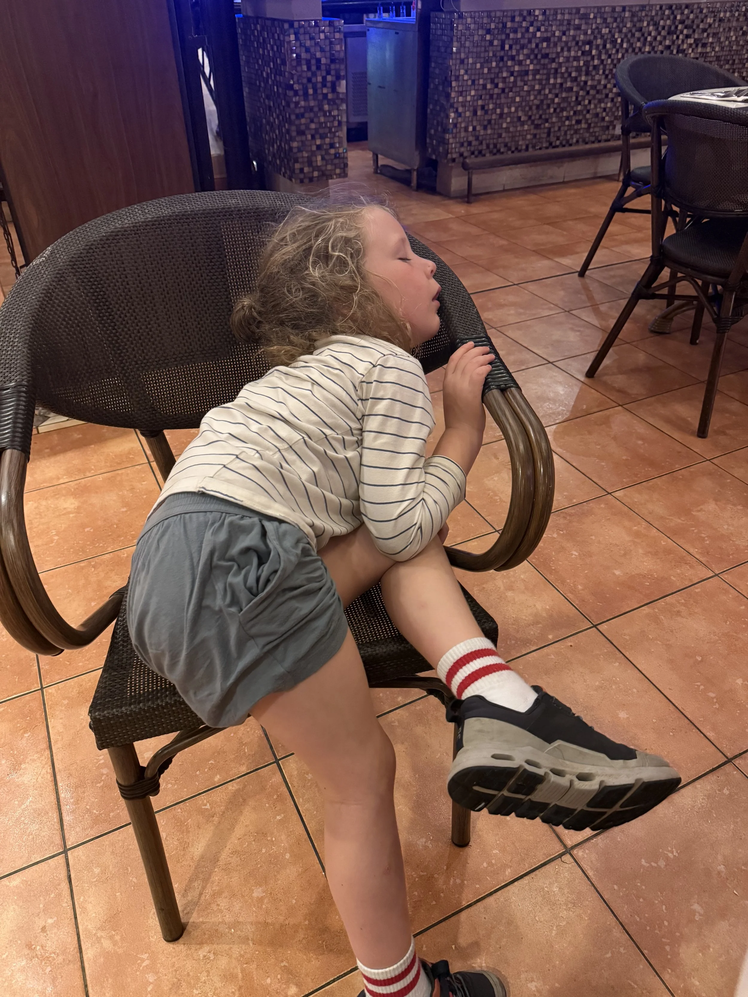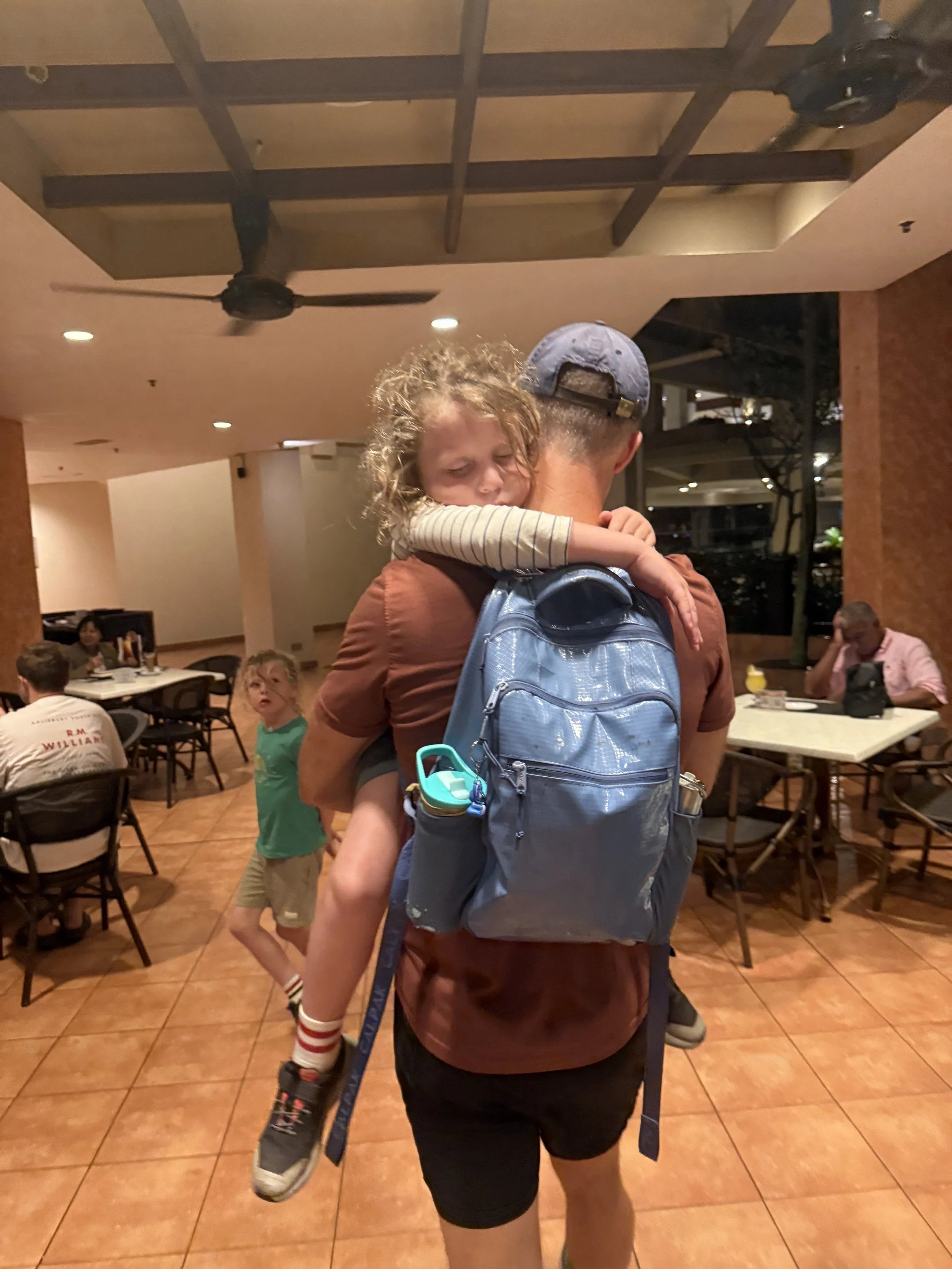 Lenny somehow passed out at dinner, an incredibly feat given the shape and comfort level of the chairs. He missed desert because of this and needed to be carried back to the room after dinner. Back in the room he woke up and whined, “desserttttt, desserttttt, desserttttt” while Kayleen put him to bed. He was denied desert and everyone went to bed to get some rest before our full day excursion tomorrow.