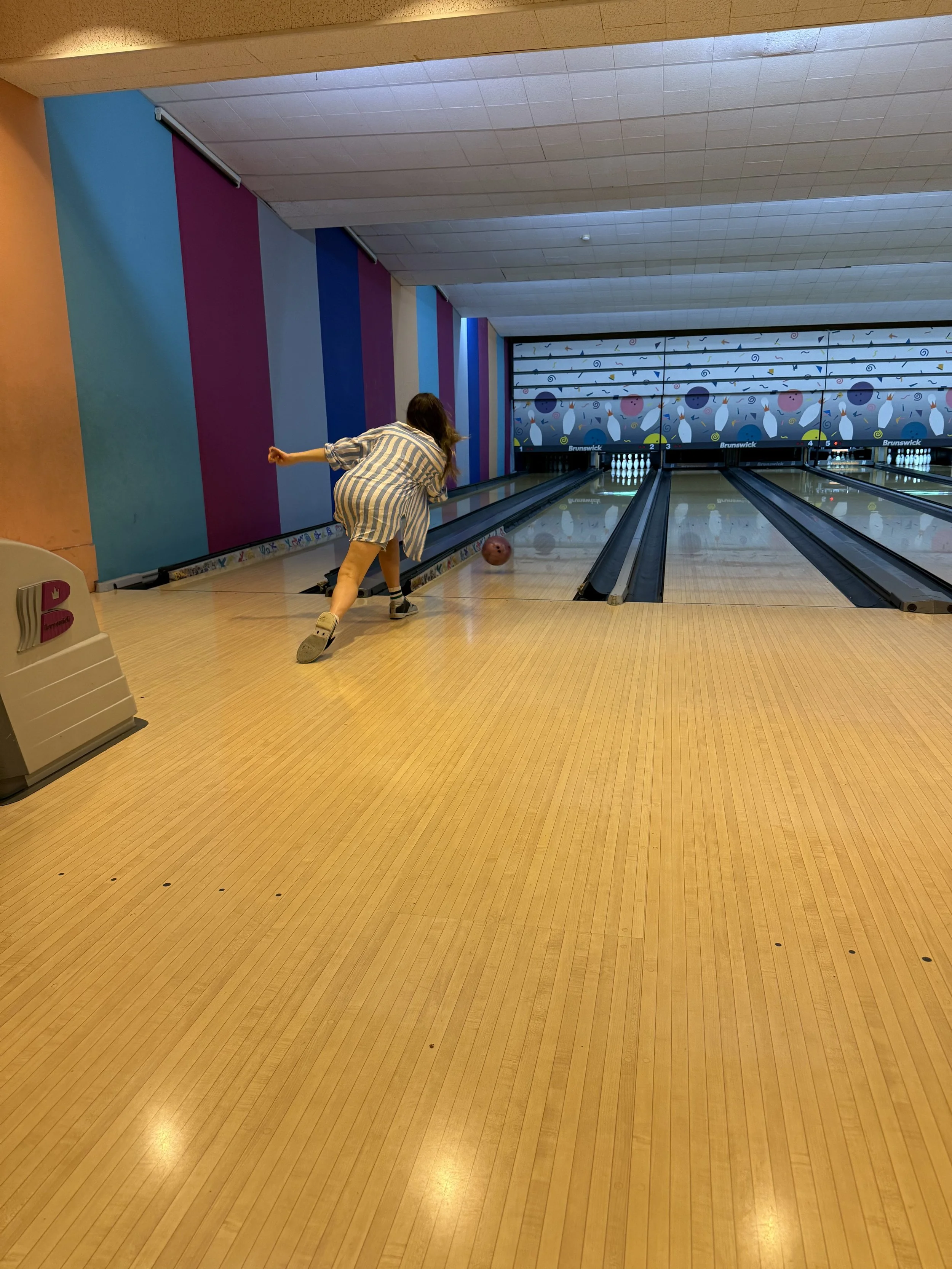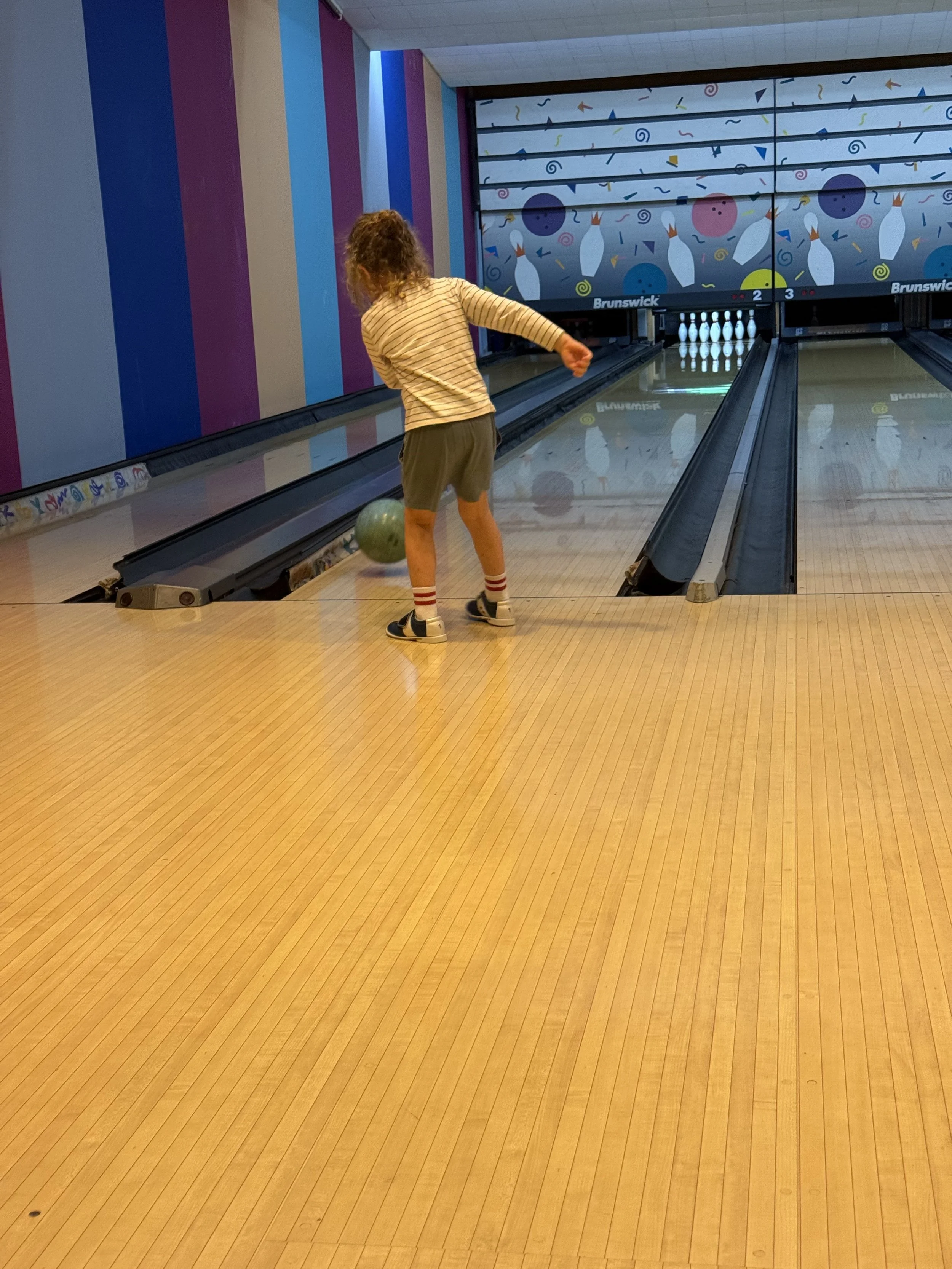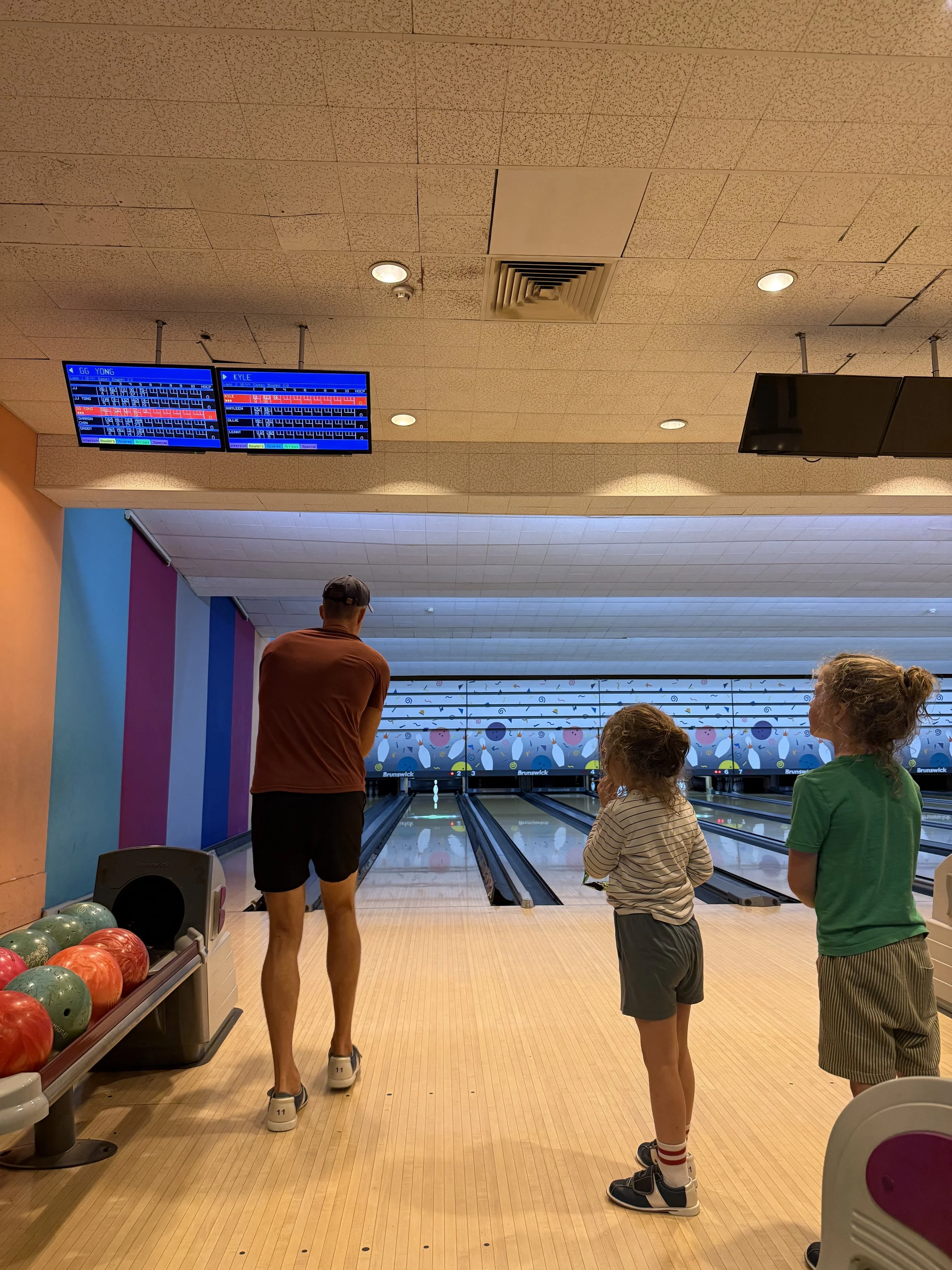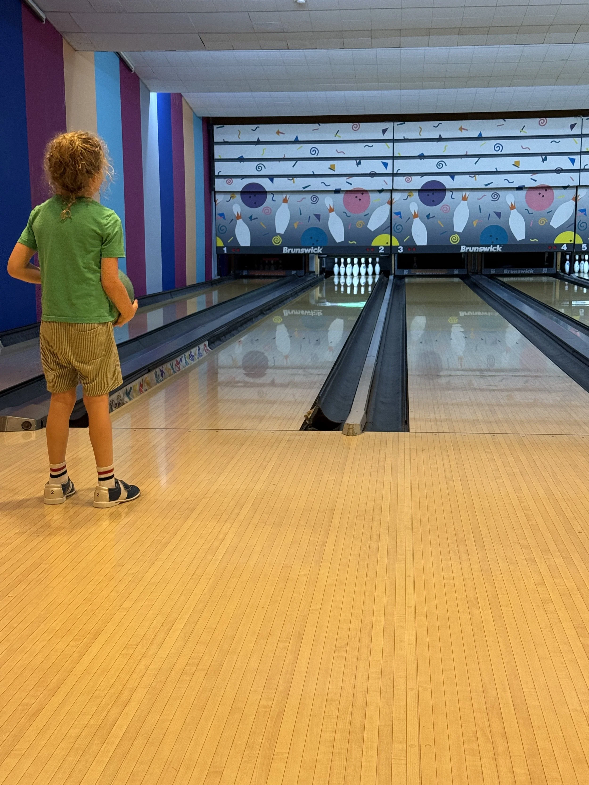 After the rain returned and closed down the slide, we went to the room to shower and change before checking out the bowling alley. Such a random thing to have at the resort but great for a rainy day with the kids. We grabbed a lane with bumpers and got our shoes. There was some frustration with figuring out the best way to throw the ball, the kids needed a lighter ball than they had, but we all still had fun. Lenny managed to toss his ball into the next lane more than once! I’m sure we will be back in the coming days if the rainy weather persists.