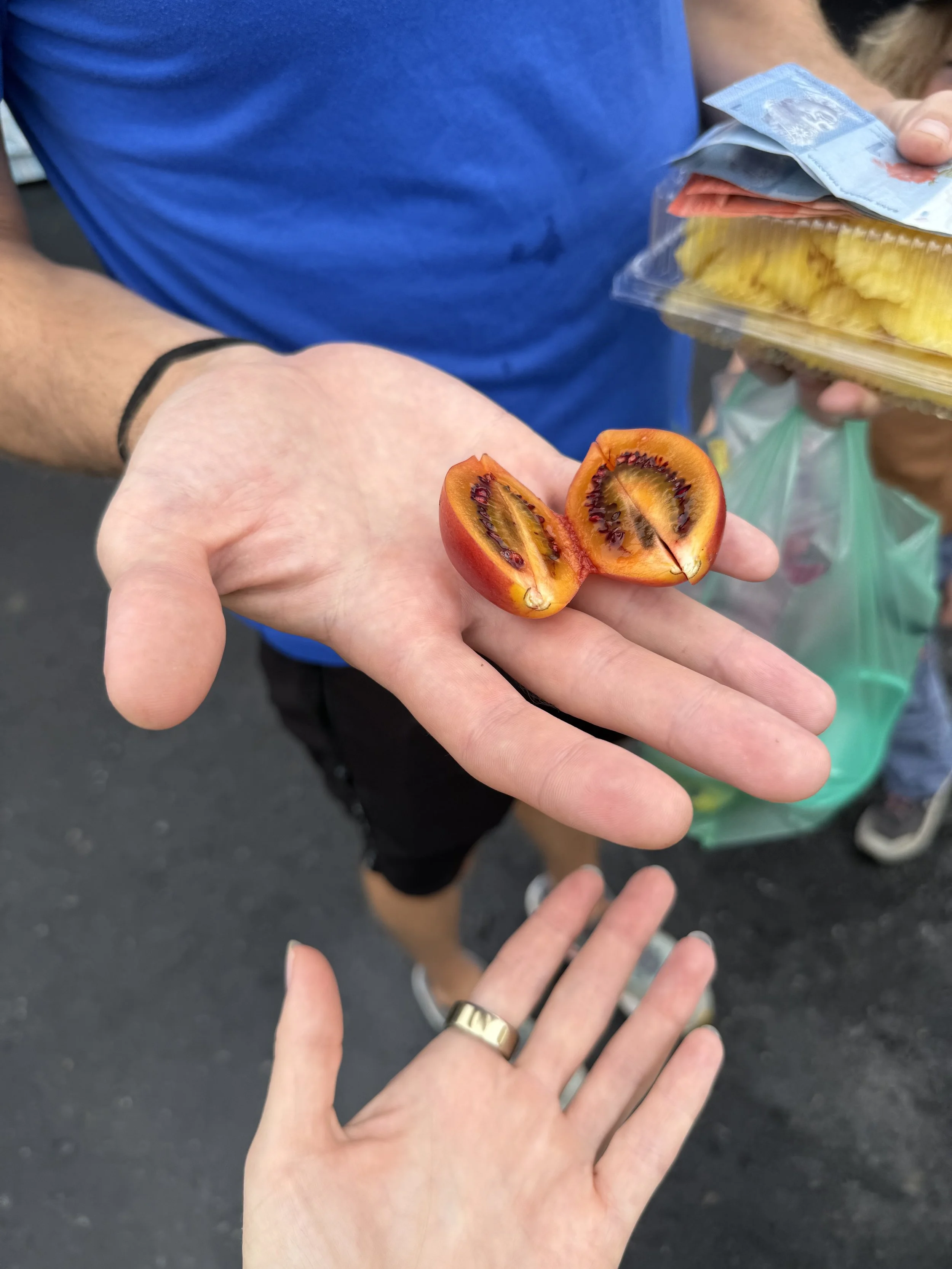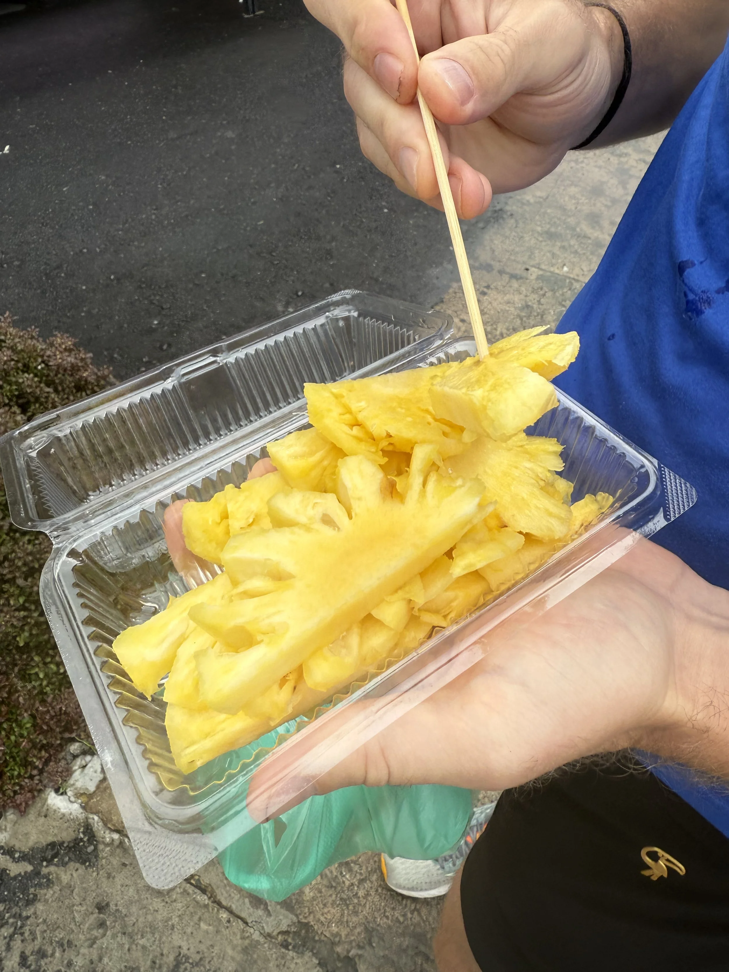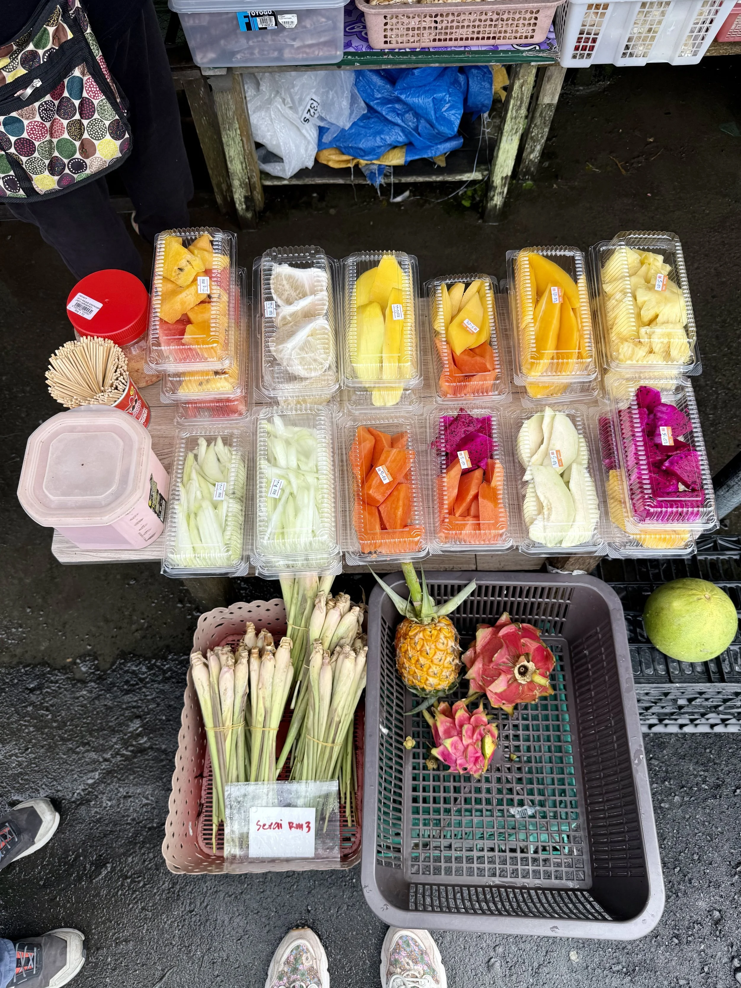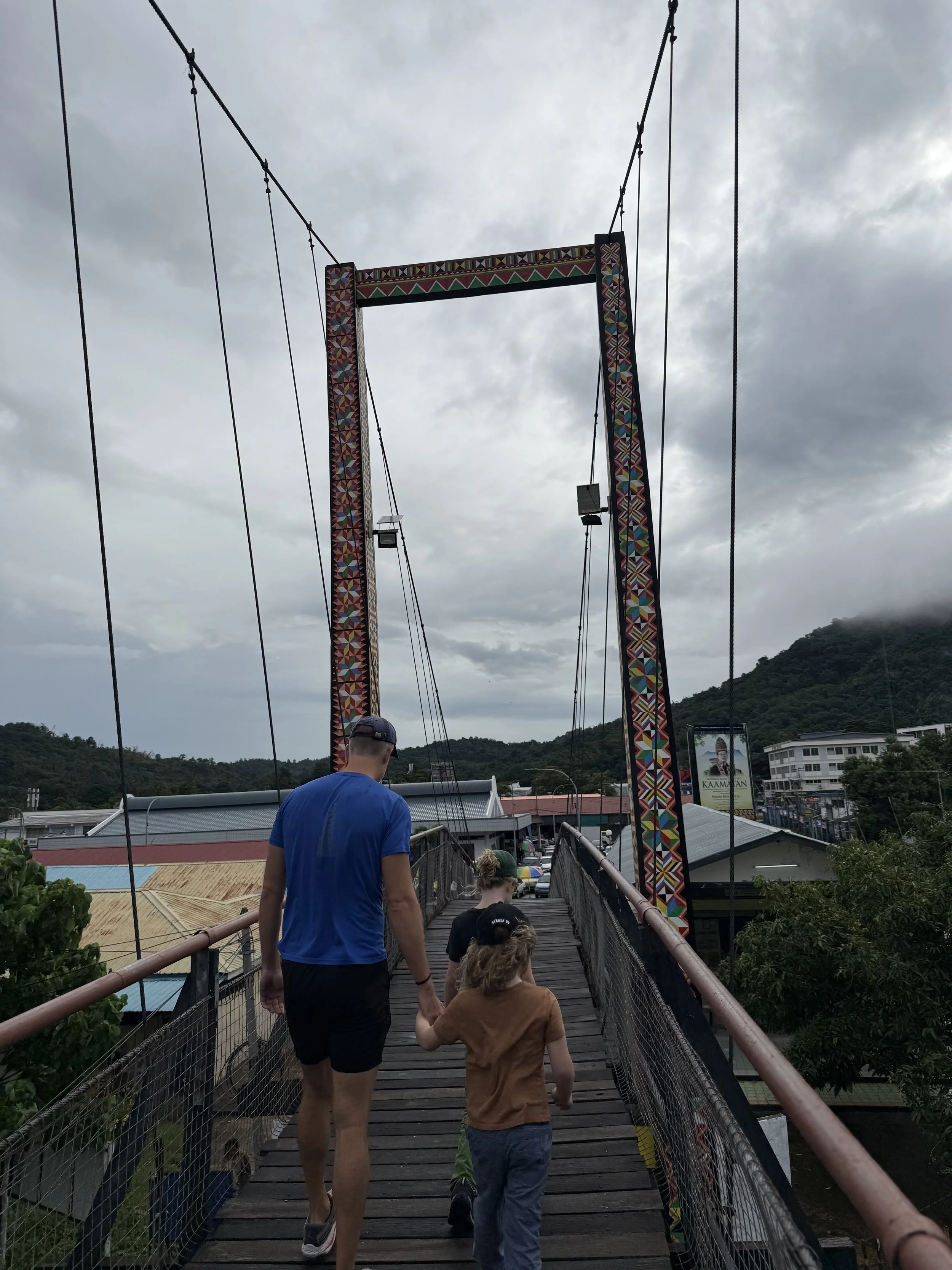 After crossing the suspension bridge, we began driving up the winding mountain roads to a large outdoor market. Other than trying the honey pineapple (loved!) and the love fruit (meh) we could have skipped this stop. The stalls were packed with mostly touristy souvenirs which left us fighting off kid requests for ridiculous souvenirs like a bulky coconut guitar and a stuffed monkey that made loud noises when his belly was squeezed. Len picked out an approved small leather fish wallet and Ollie went on souvenir strike after his coconut guitar request was refused.