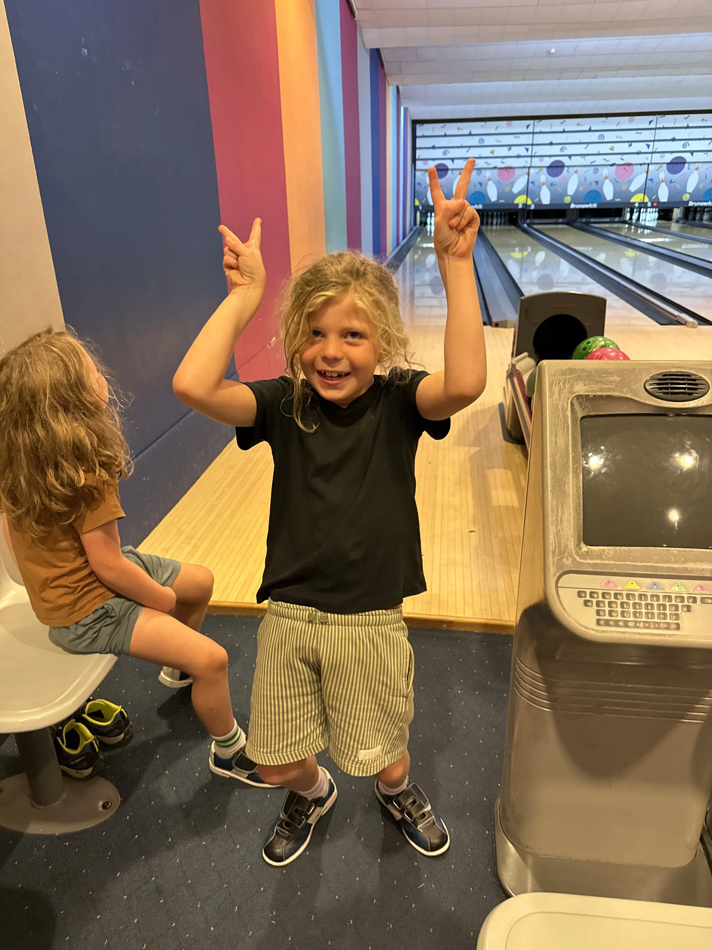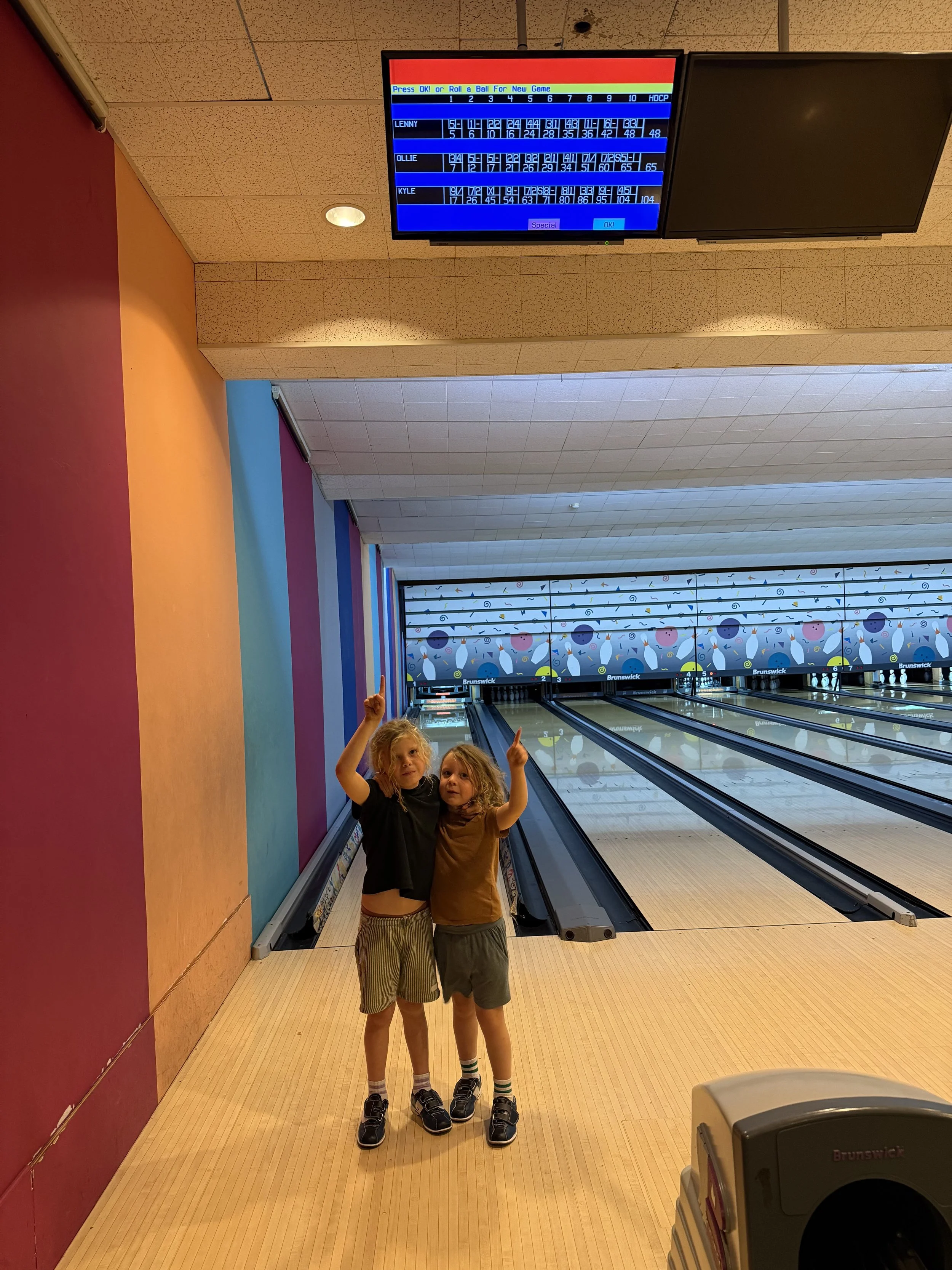 I was feeling nauseous from the ride so stayed back at the room to lay down while Kyle took the kids bowling to burn off some energy. Ollie bowled his first ever spare and the kids’ scores combined beat Kyle’s so they were pretty jacked up. We ended the day with another room service dinner— mine and Kyle’s chicken satay consumption knows no limits this week!